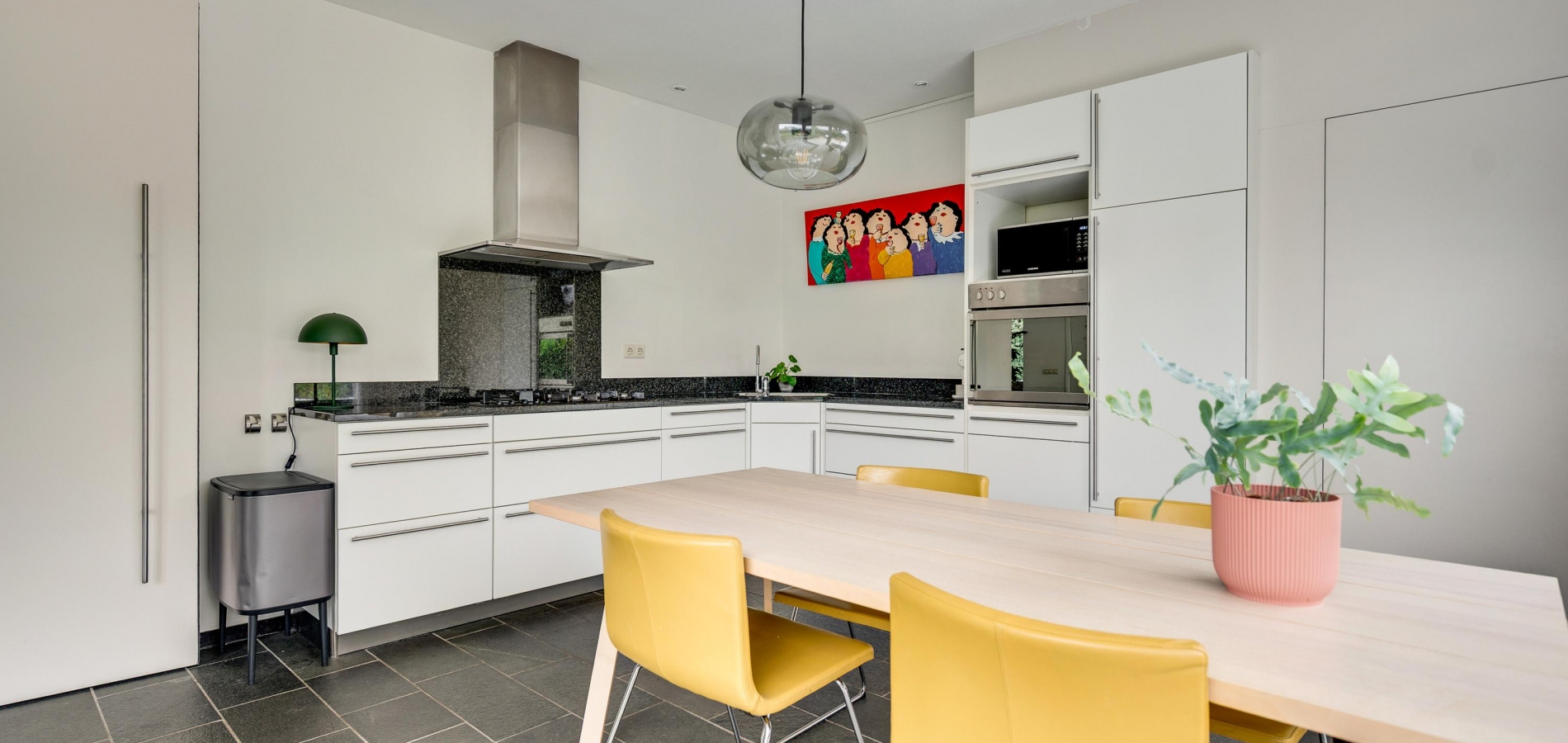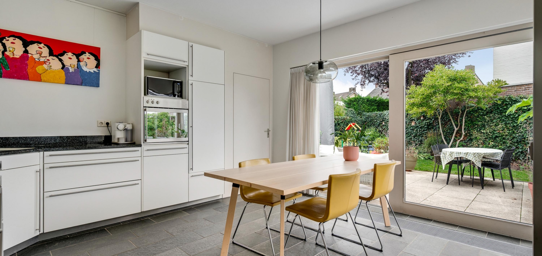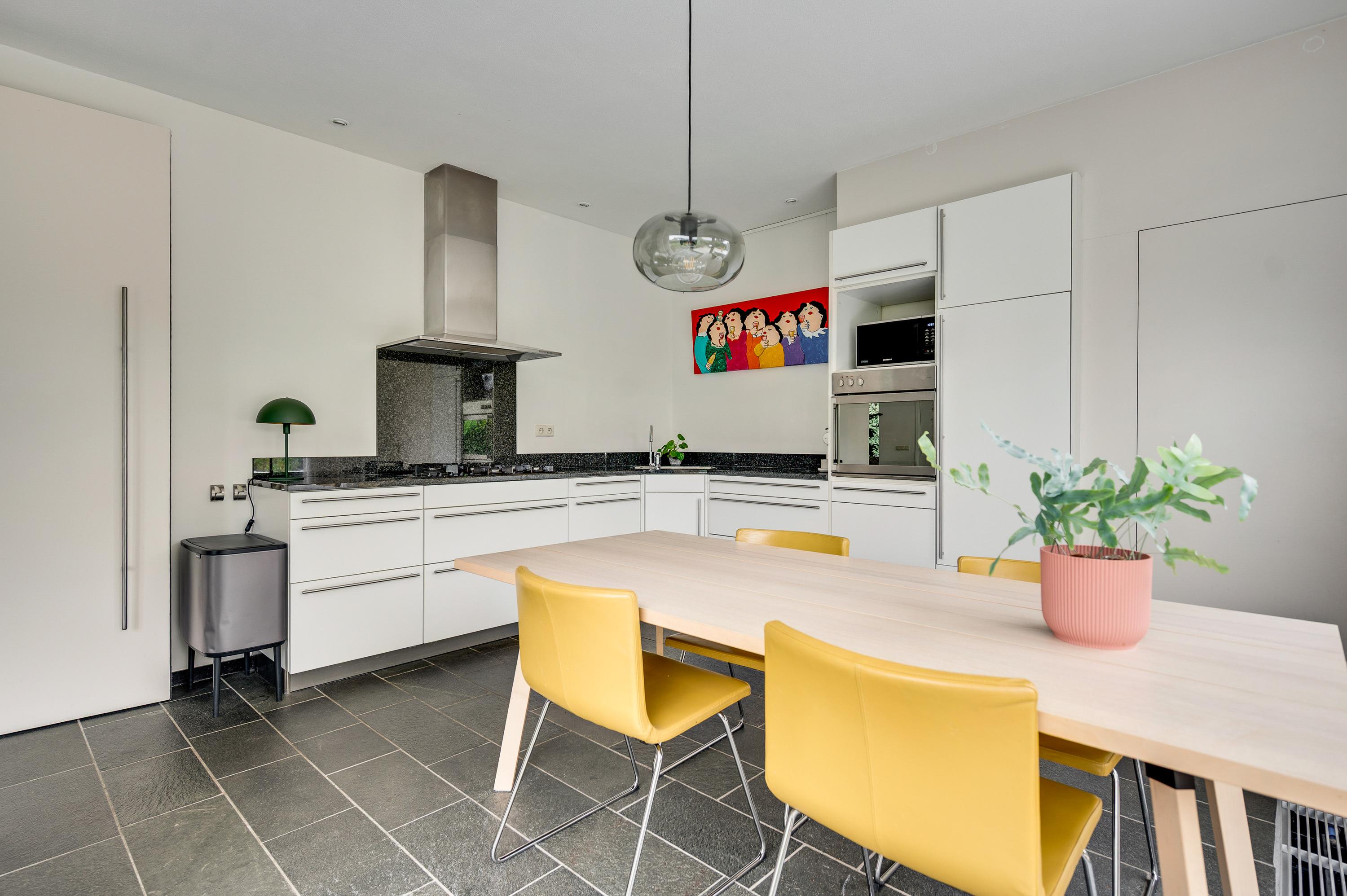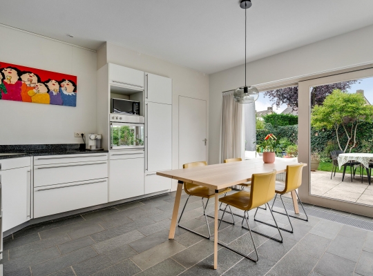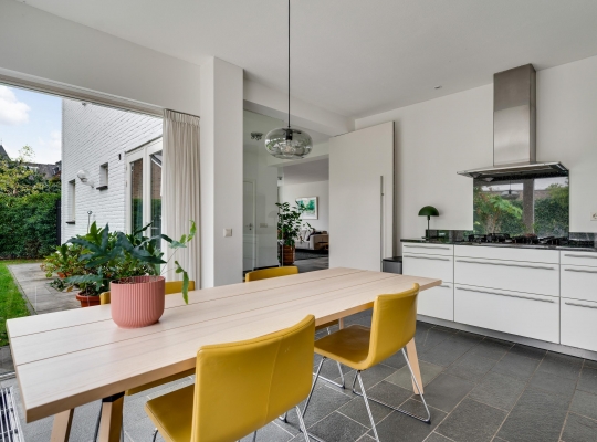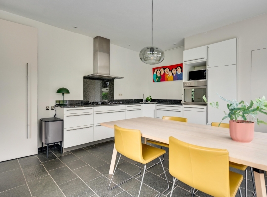 Een taatsdeur verbindt de woonkamer met een lichte werk-/studeerkamer (circa 4,18 x 2,07) met een vaste kastenwand. Naast deze kamer is de eetkeuken (circa 4,18 x 4,16) met een schuifpui naar het grote terras in de tuin. Er is genoeg plek voor een eettafel en de lichte, hoekopstelling heeft een ingebouwde gaskookplaat, afzuigkap, oven, vaatwasser en een koelkast met vriesvak.