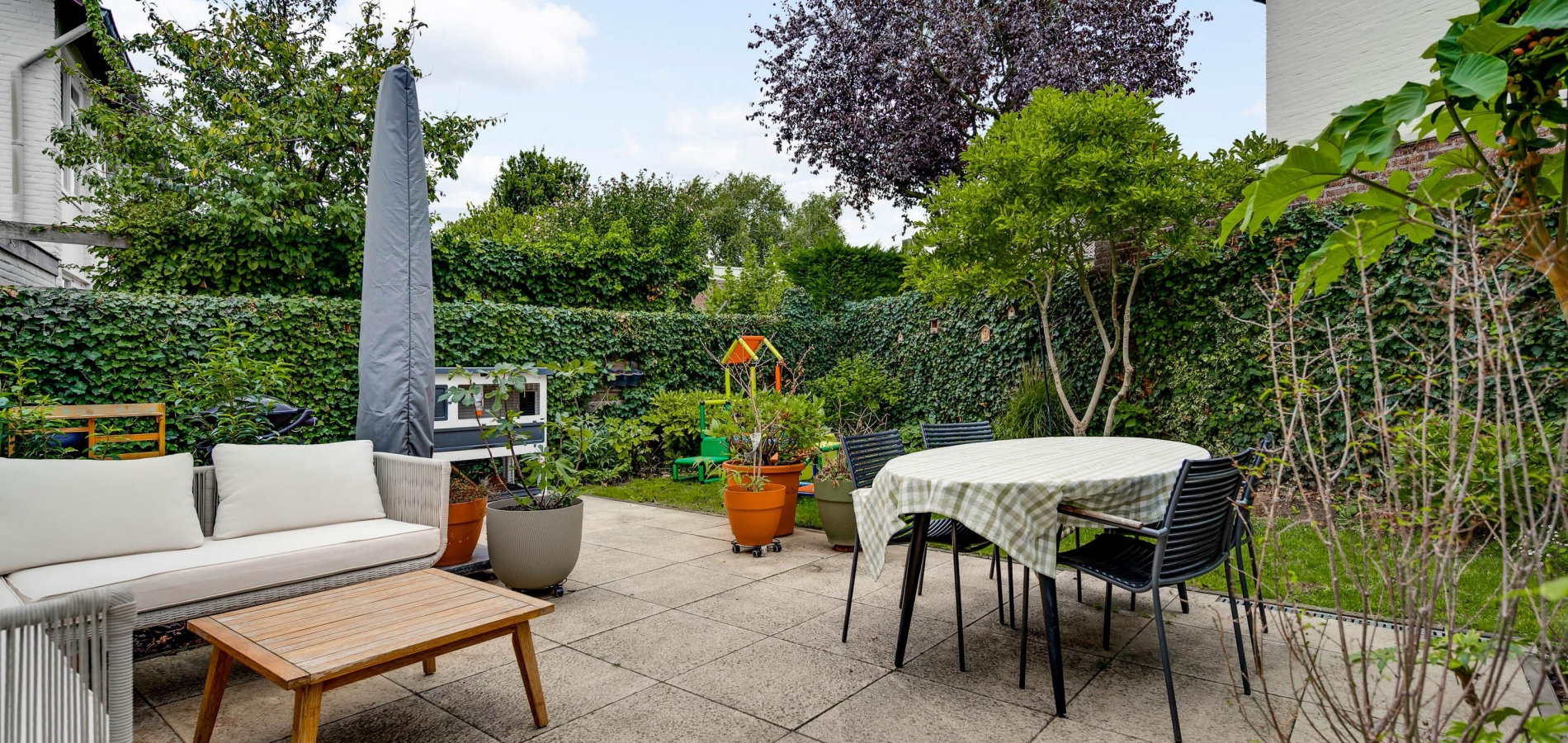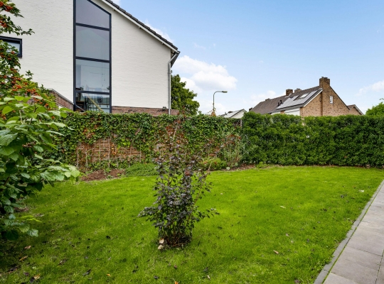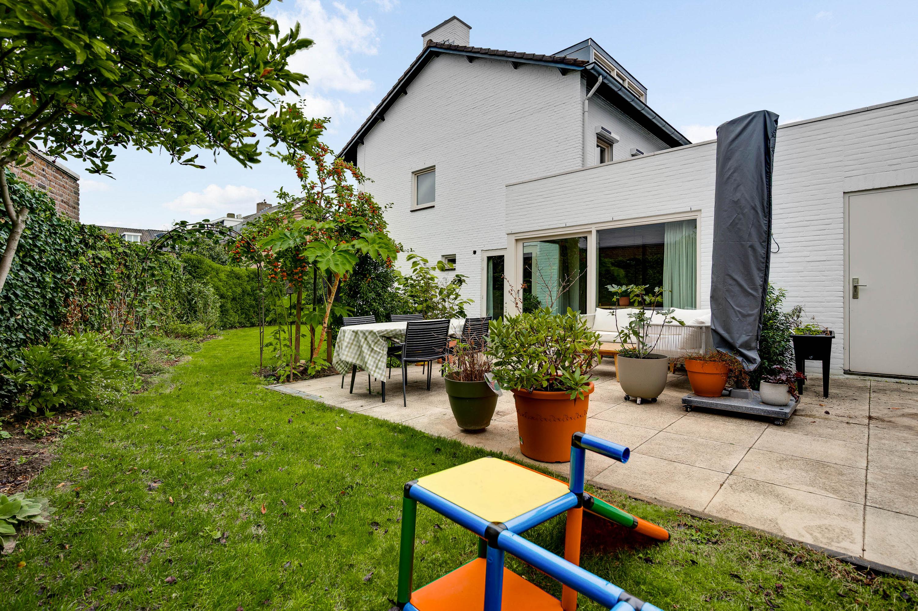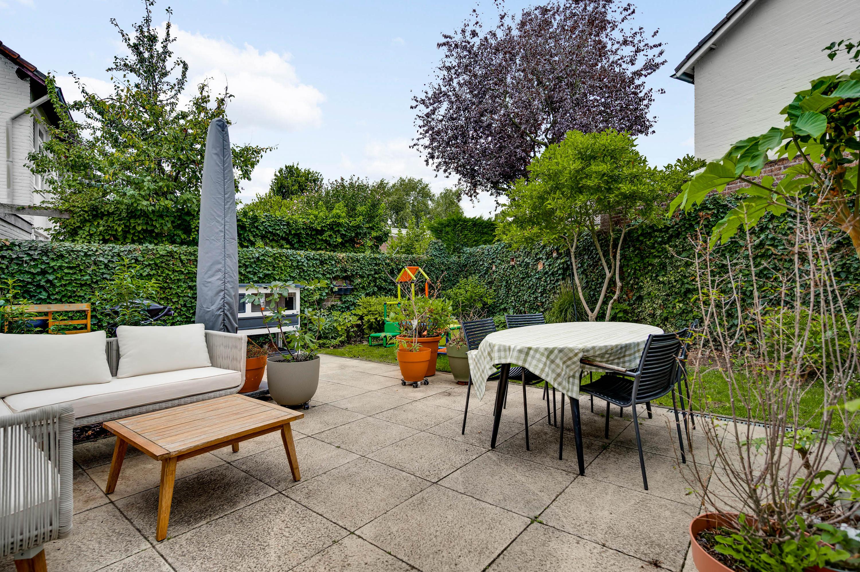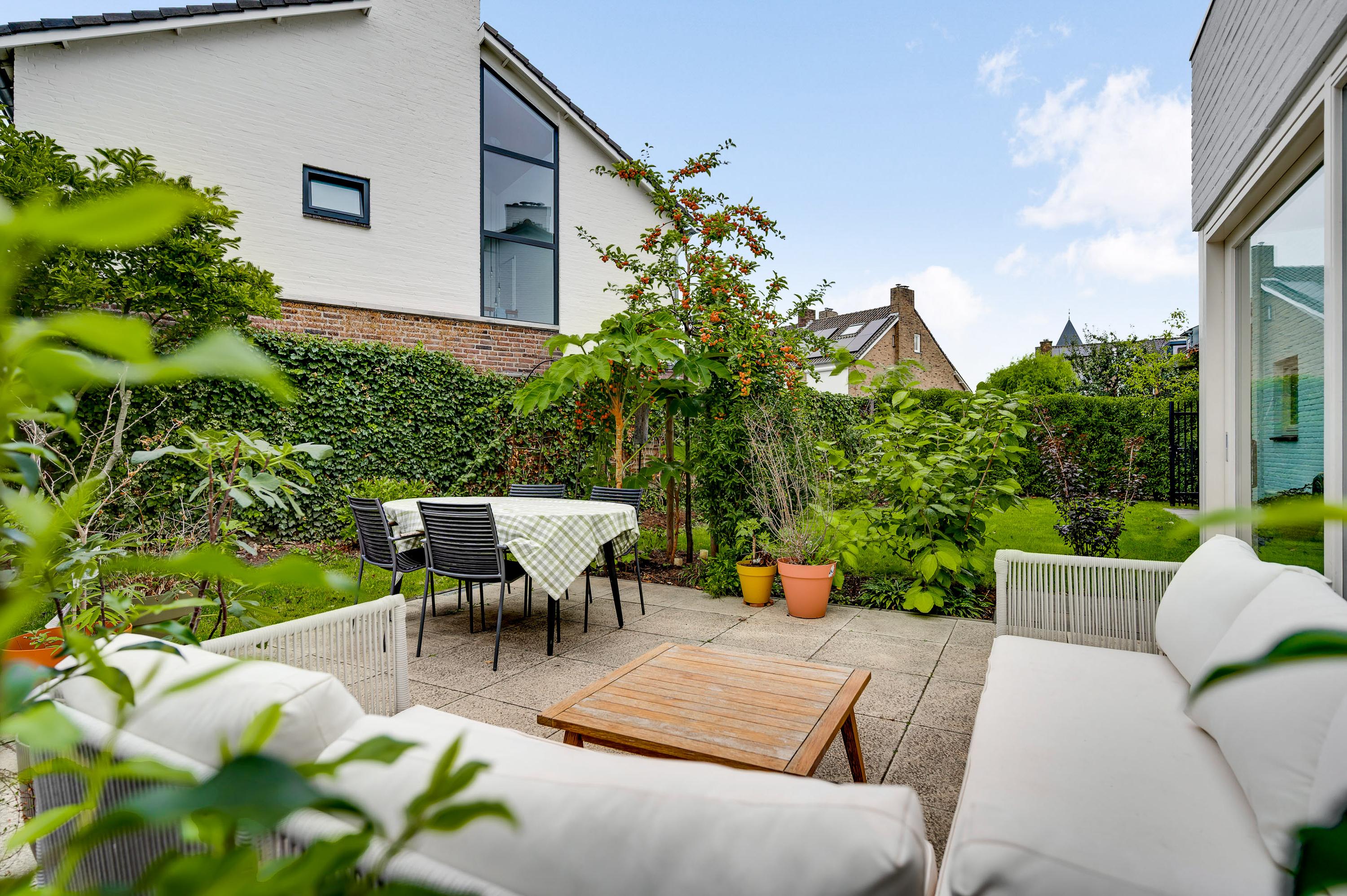 Mooi aangelegde tuin aan drie zijden, met veel groen en een groot terras