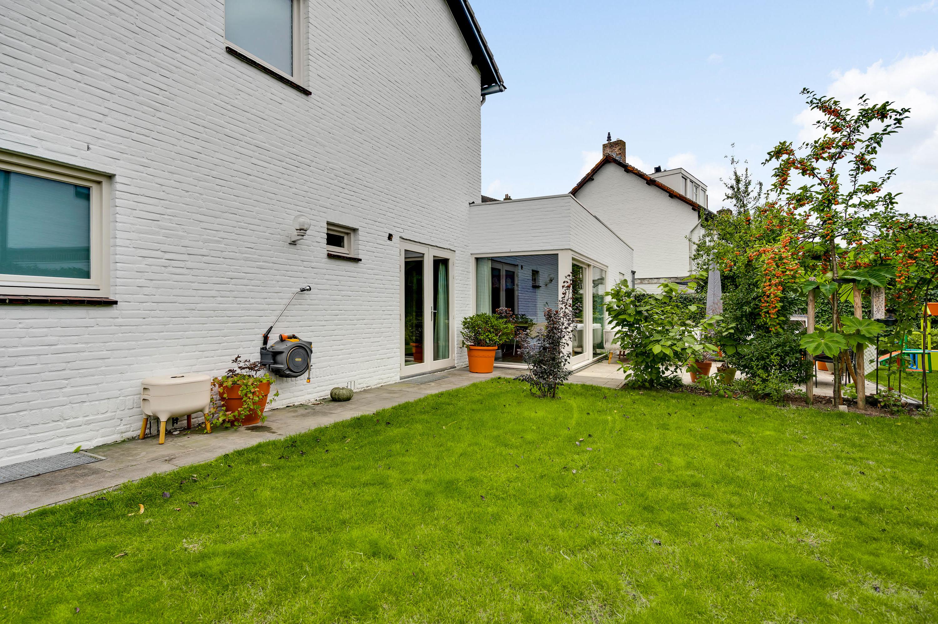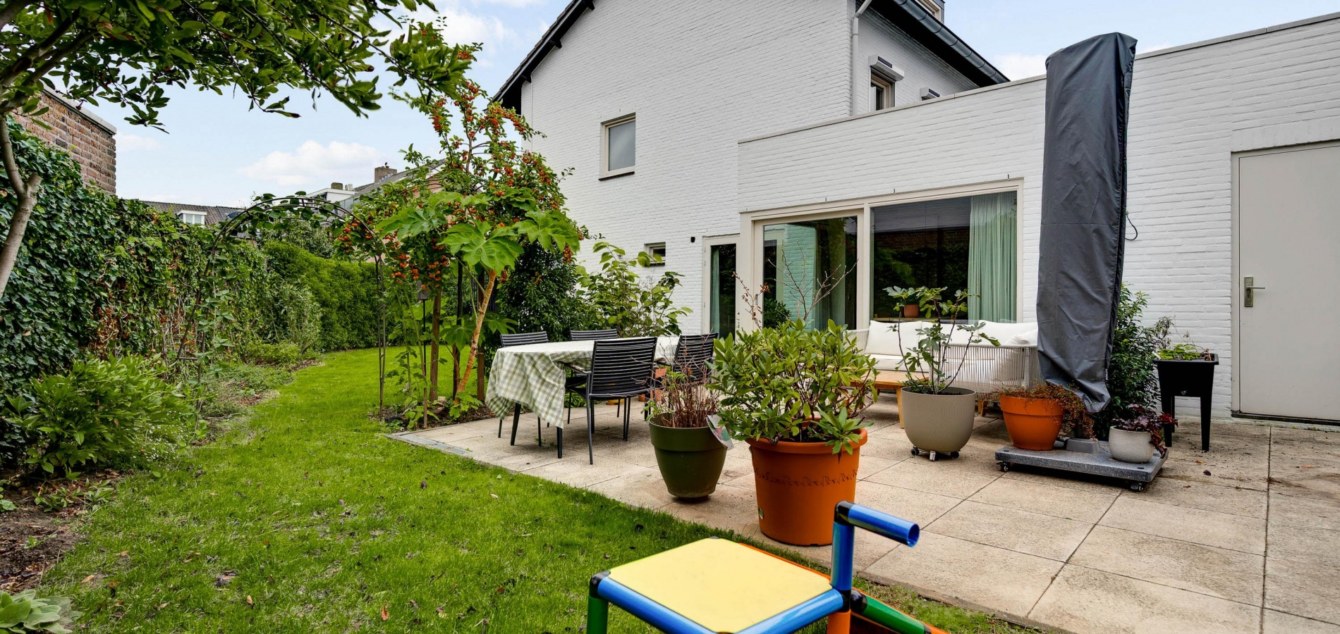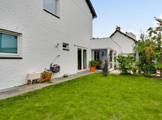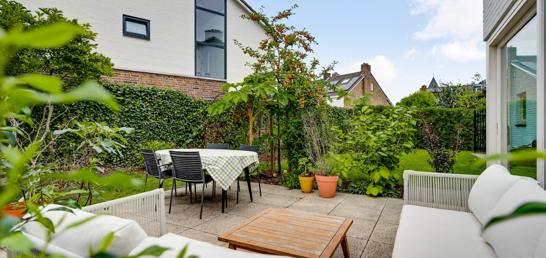 Mooi aangelegde tuin aan drie zijden, met veel groen en een groot terras