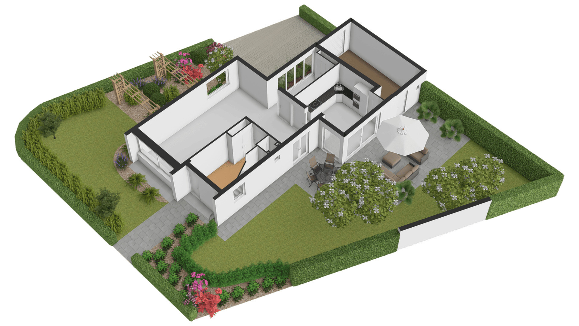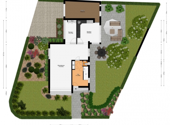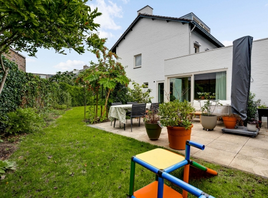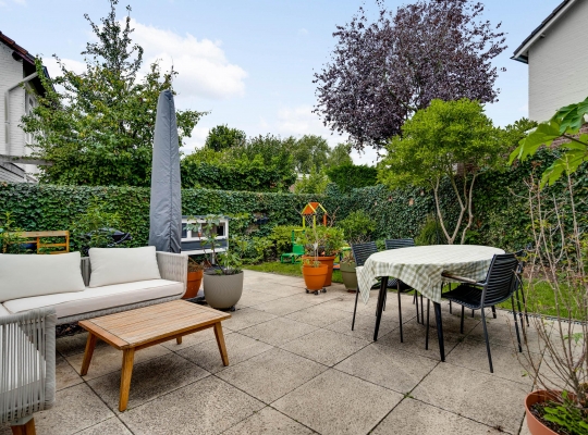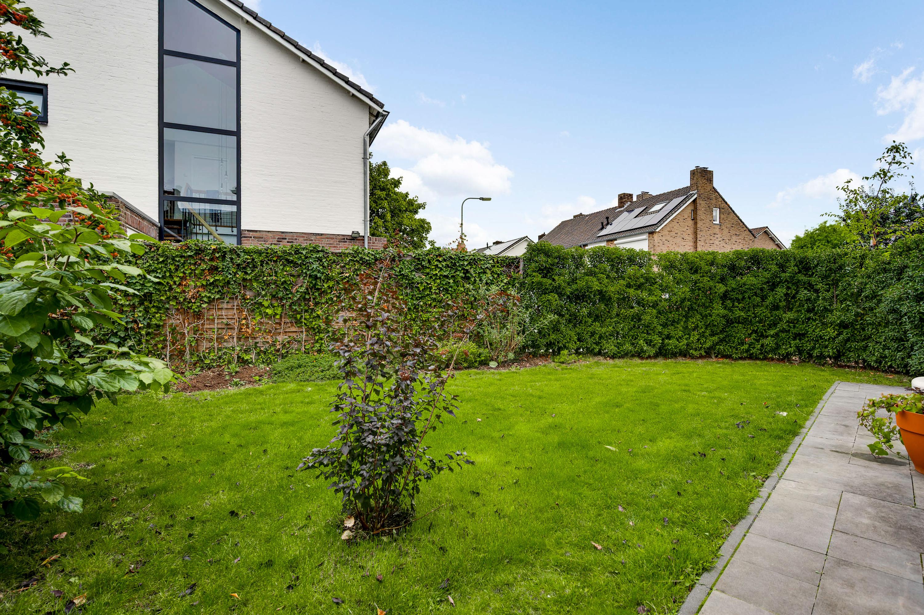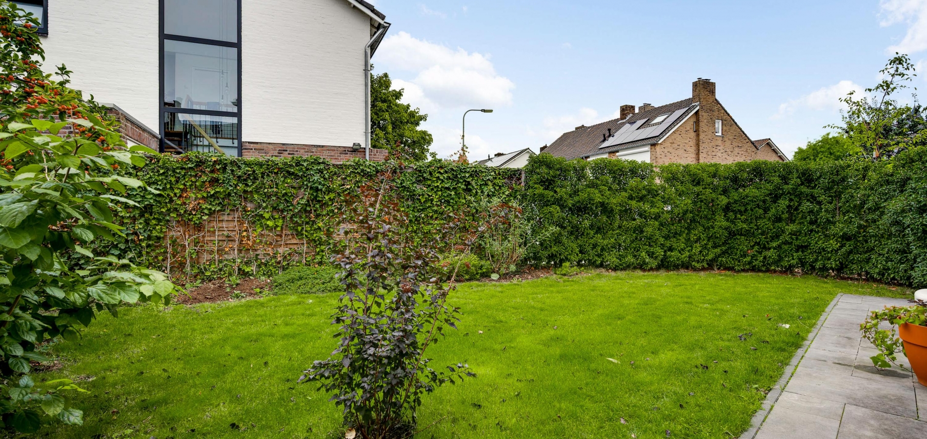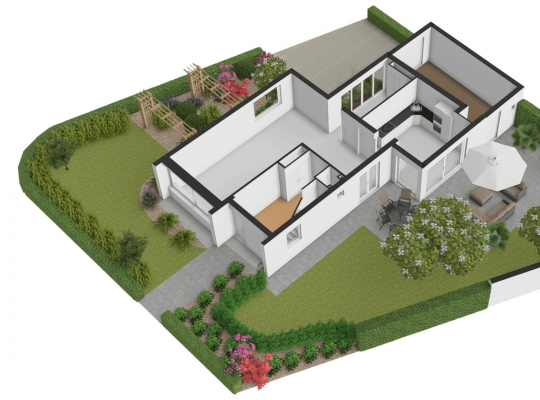Mooi aangelegde tuin aan drie zijden, met veel groen en een groot terras