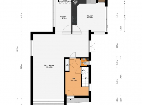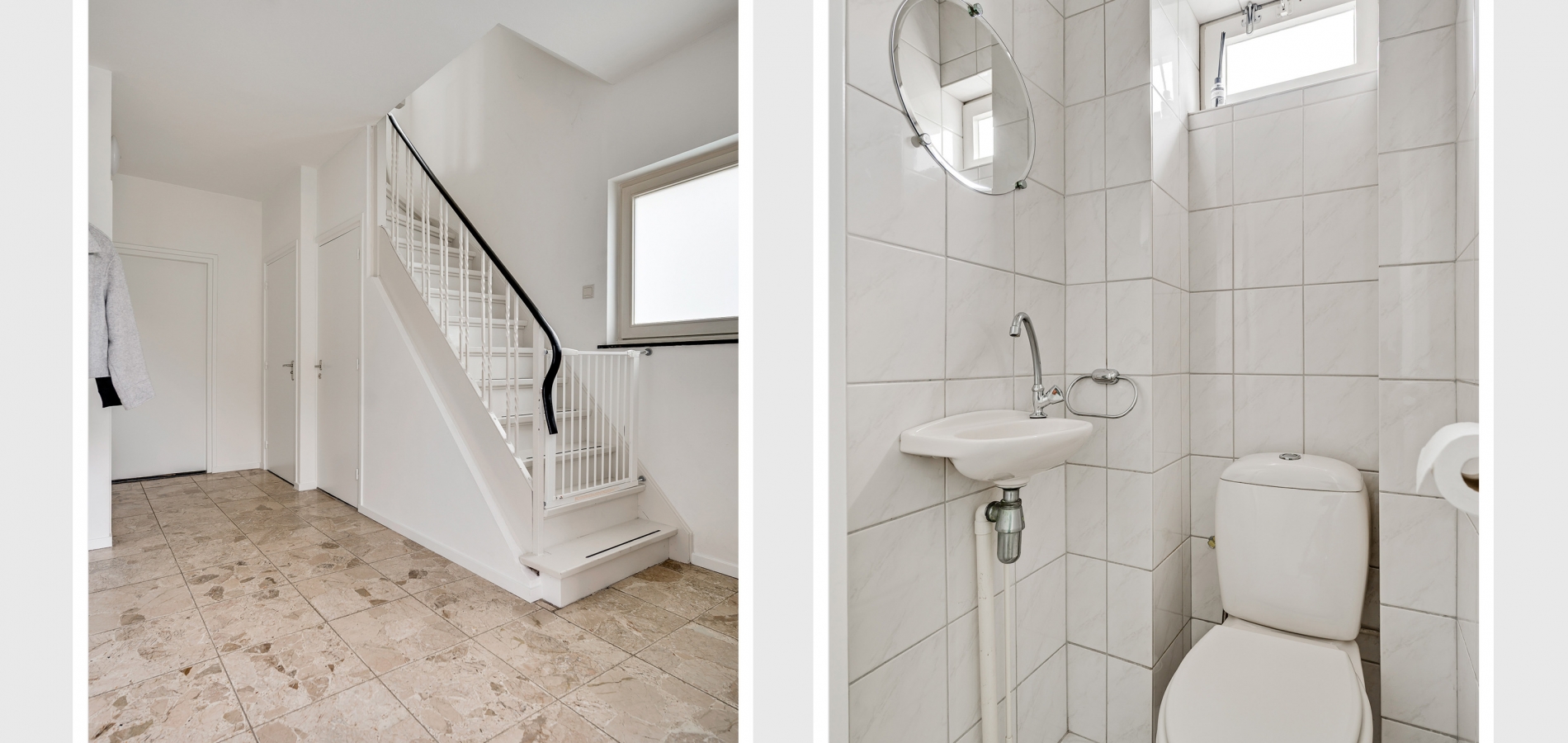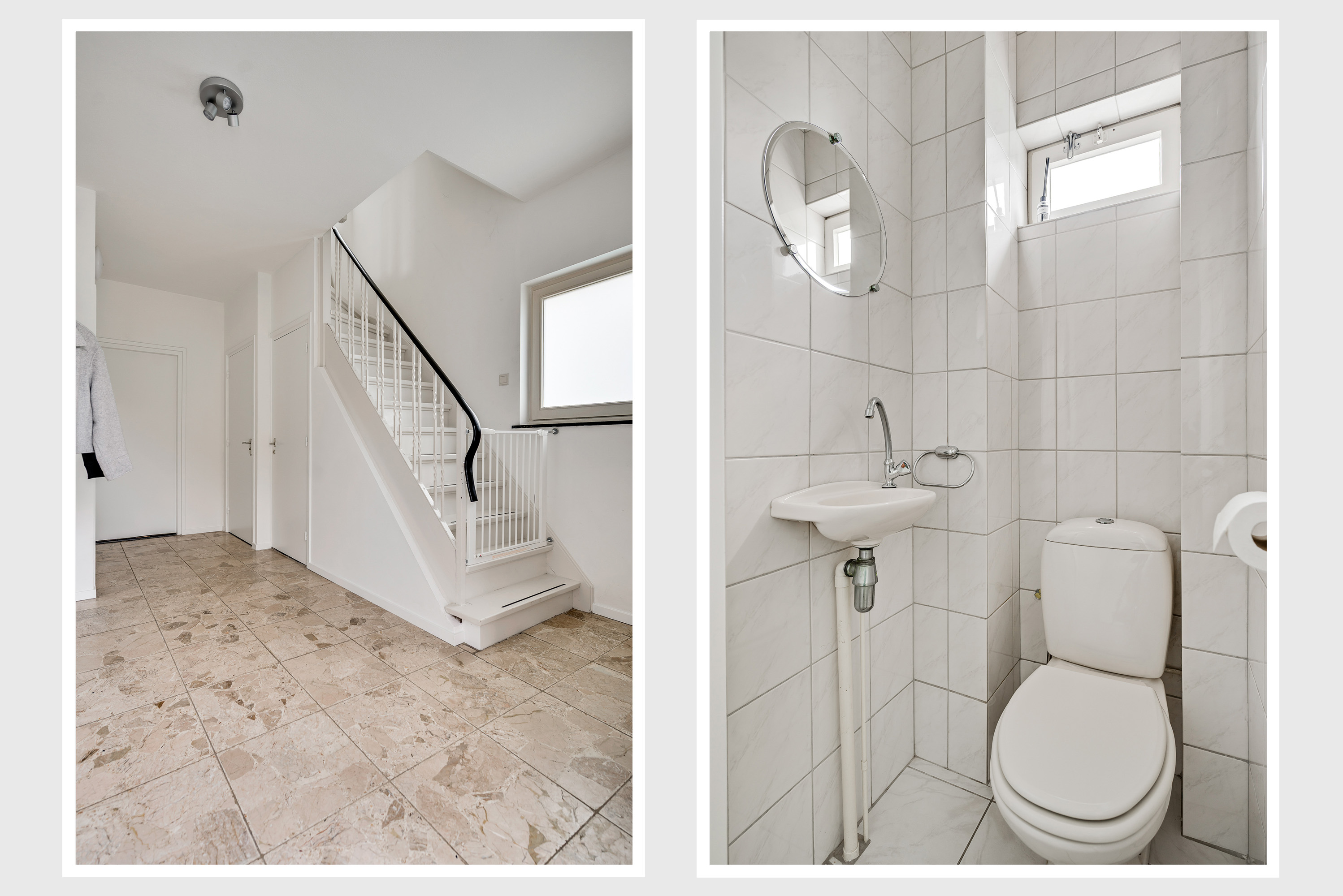 De hal (circa 4,72 x 2,96) met toiletruimte is een royale en lichte ontvangstruimte, met een lichte leisteen vloer en de trap naar de eerste verdieping. Mooie details zijn de kleine, ronde ramen in de voorgevel en de sierlijke trapbalustrade.