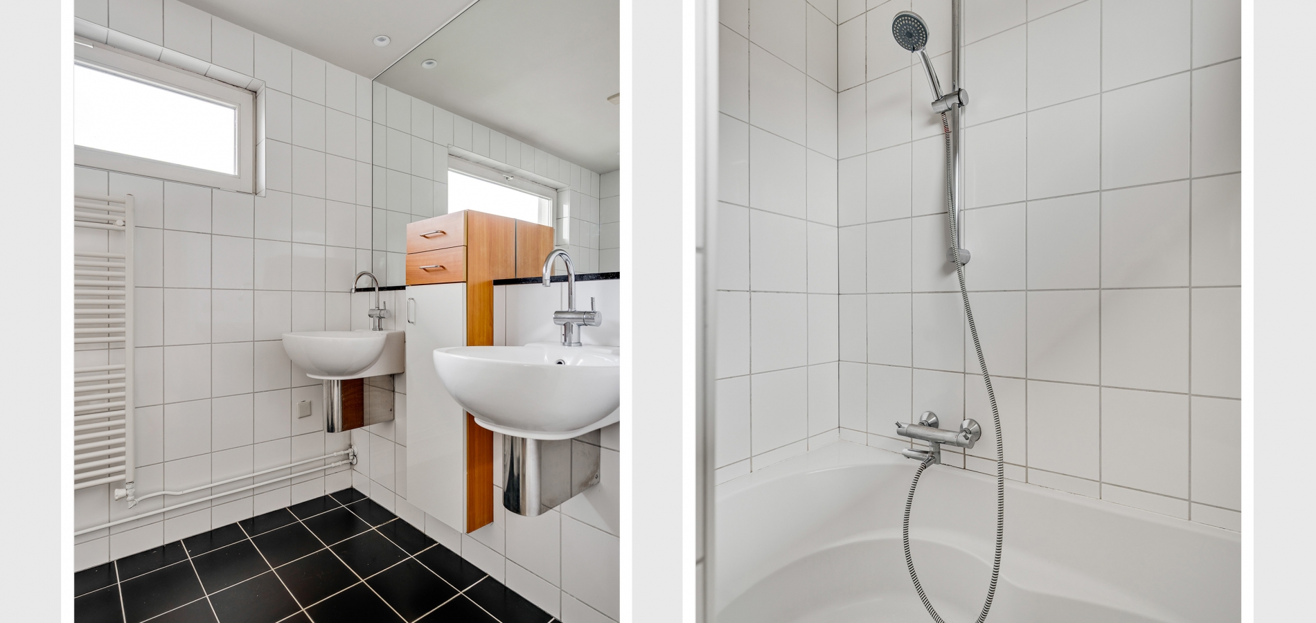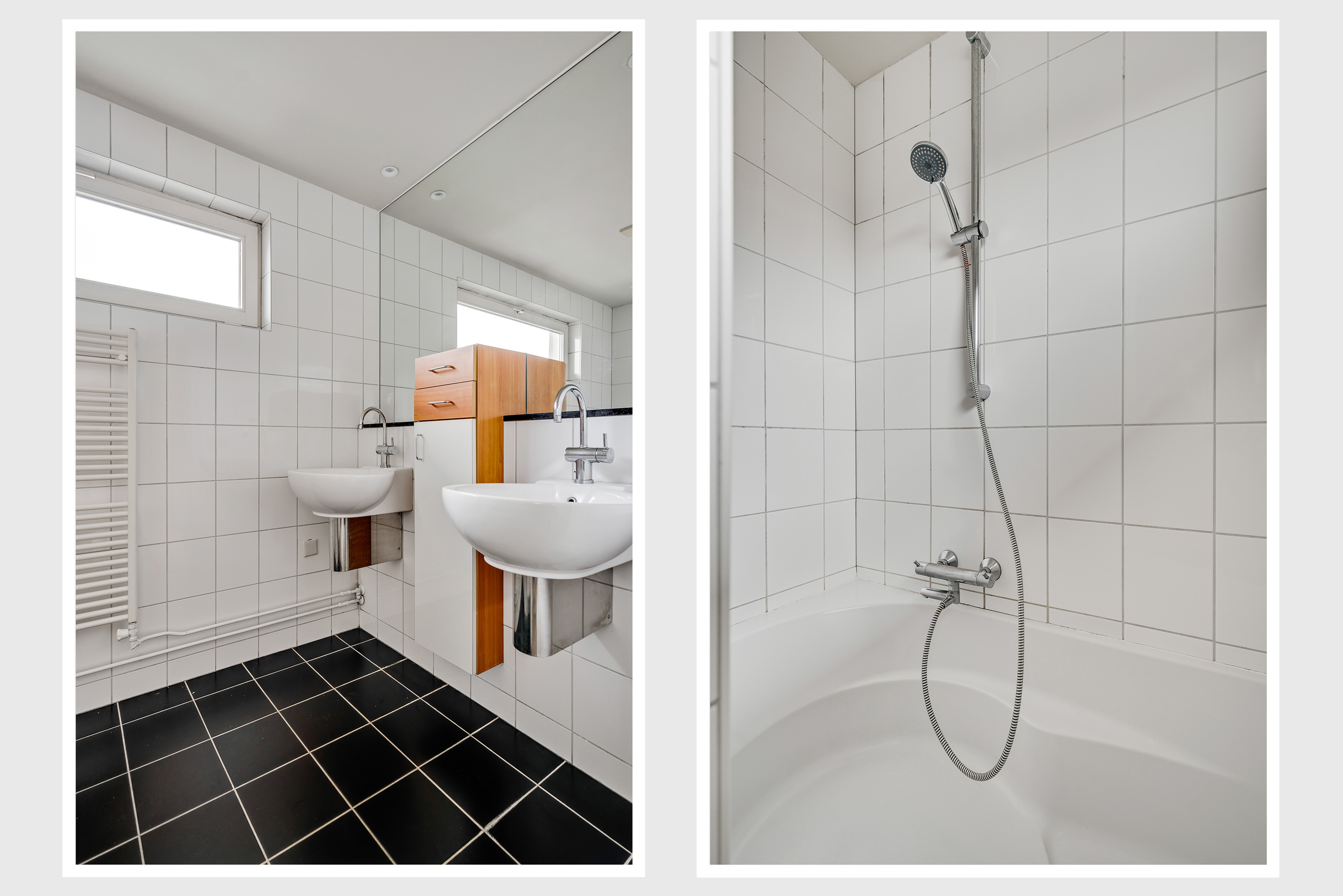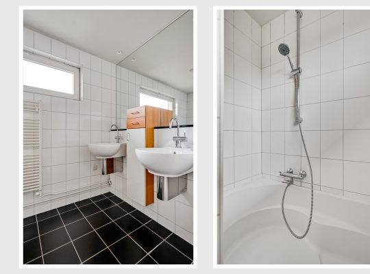 De badkamer (circa 2,96 x 1,54), met witte wandtegels en zwarte vloertegels, is ingedeeld met een bad/douchecombinatie, twee wastafels en een hoge kast. Aan de andere kant van de overloop, naast de trap, is een separate toiletruimte in dezelfde stijl als de badkamer.