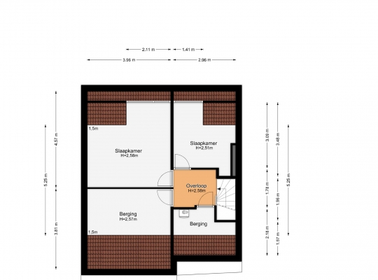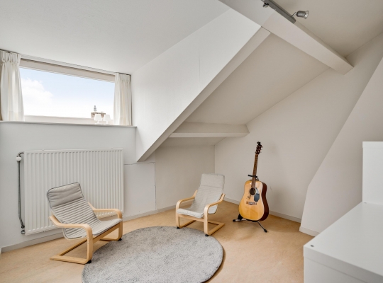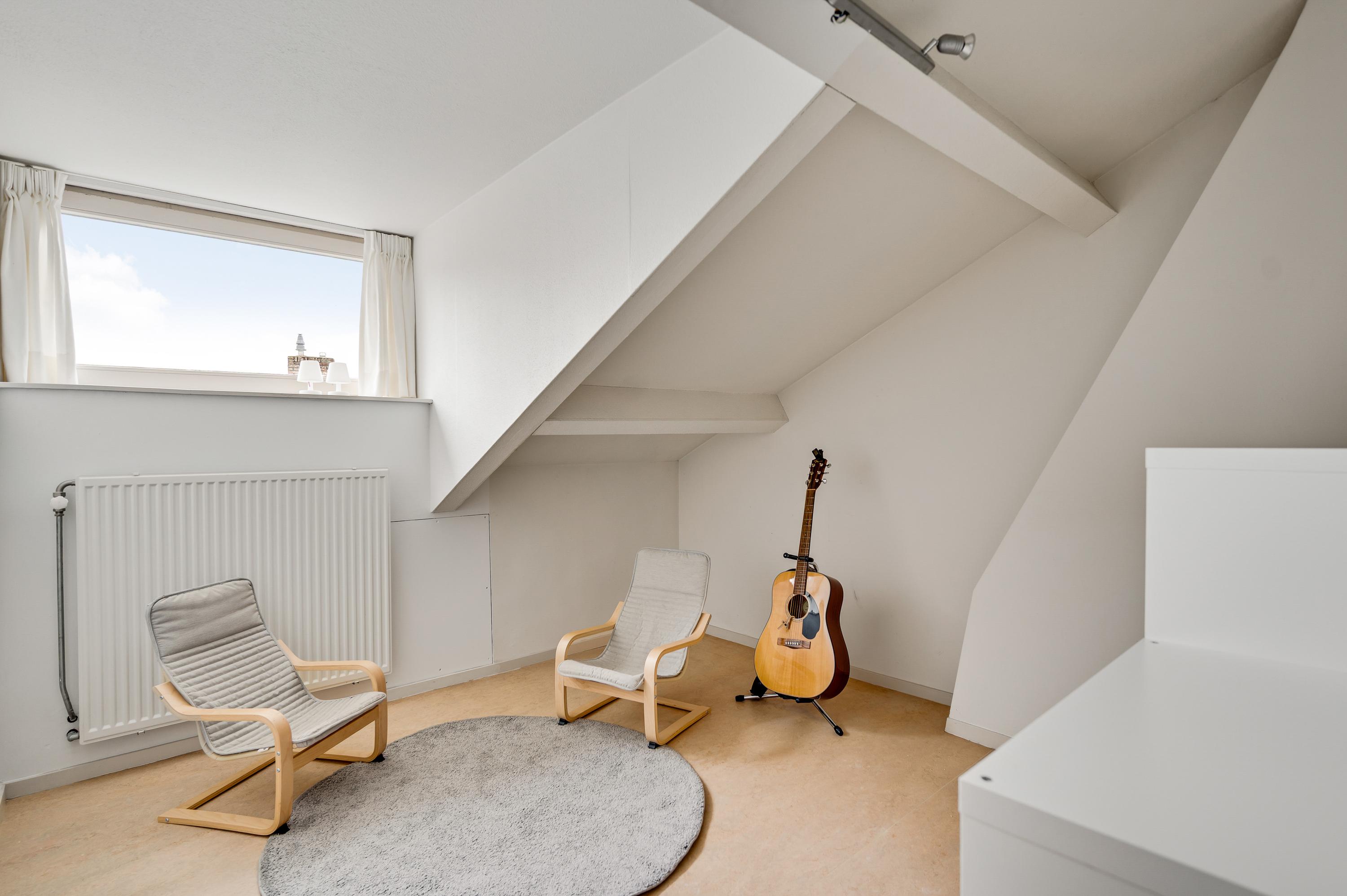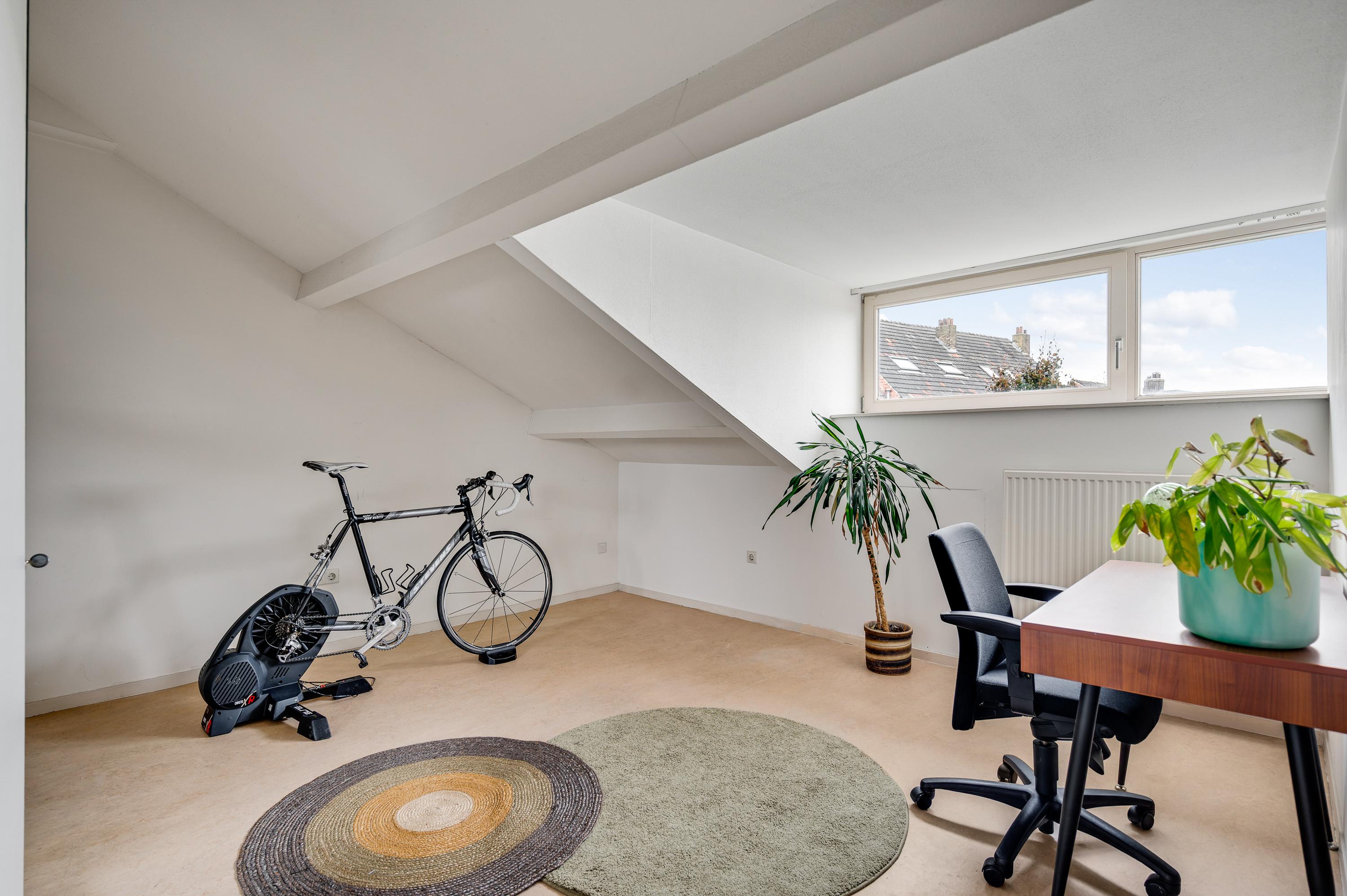 Een vaste trap geeft toegang tot de tweede verdieping, met een optimale indeling en een dakkapel aan de achterzijde. Hier zijn slaapkamer IV (circa 4,57 x 3,96), ingericht als sport-/werkkamer, en slaapkamer V (circa 3,09 x 2,96). Aan de voorzijde zijn twee bergingen, waarvan een met de opstelling van de HR-ketel (Atag, 2025, eigendom).