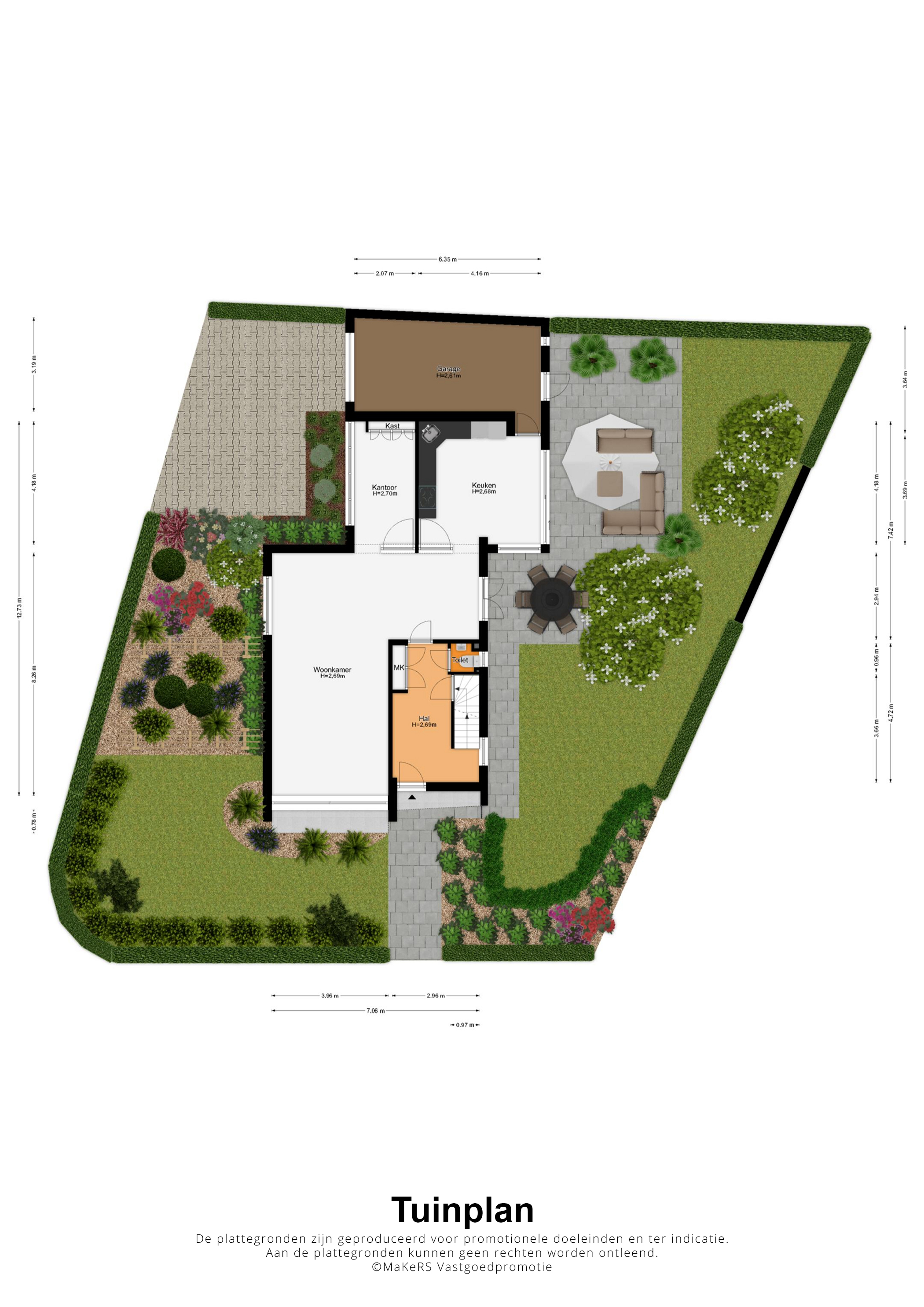 In de hoek van de eetkeuken is er toegang tot de garage (circa 6,35 x 3,64/3,19) met een sectionaalpoort naar de oprit en een deur naar de tuin. In de tuin, die de woning aan drie kanten omringd, ziet u veel groen en een groot terras. Voor kinderen is er volop ruimte om te spelen en er is een grote moestuin met een mooie vakverdeling gemaakt. Op de oprit, aan de kant van de Gerechtigheidslaan, is parkeergelegenheid voor twee auto’s.