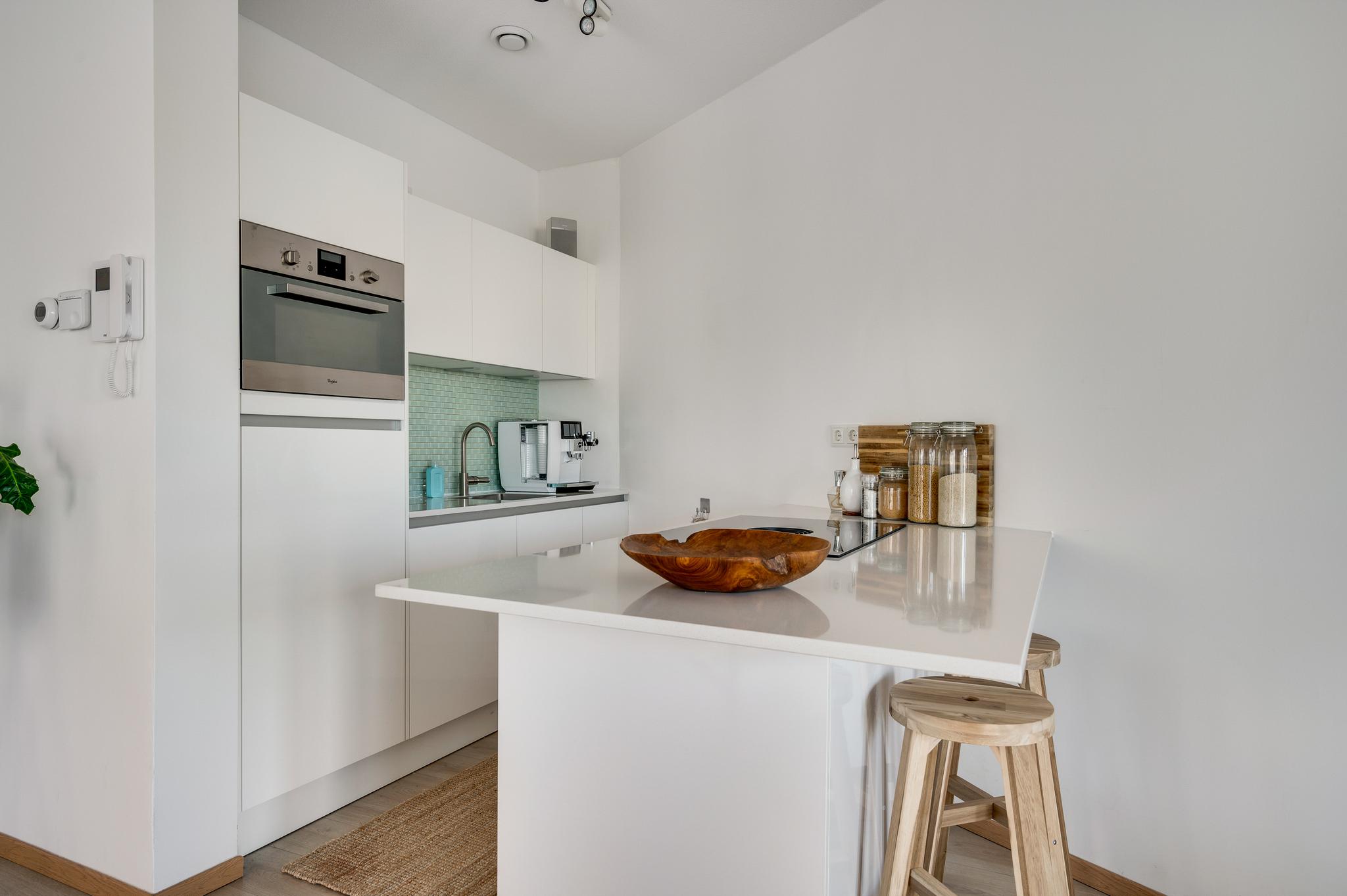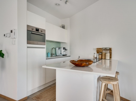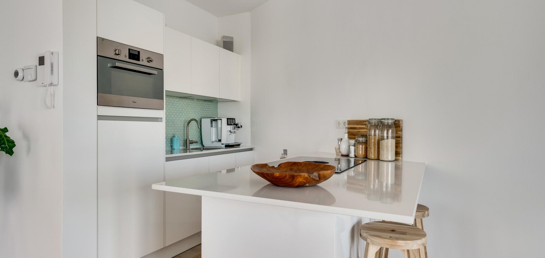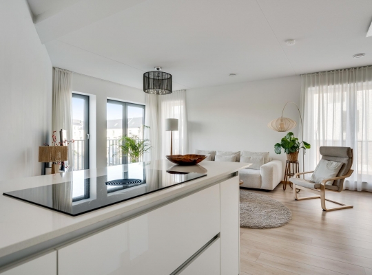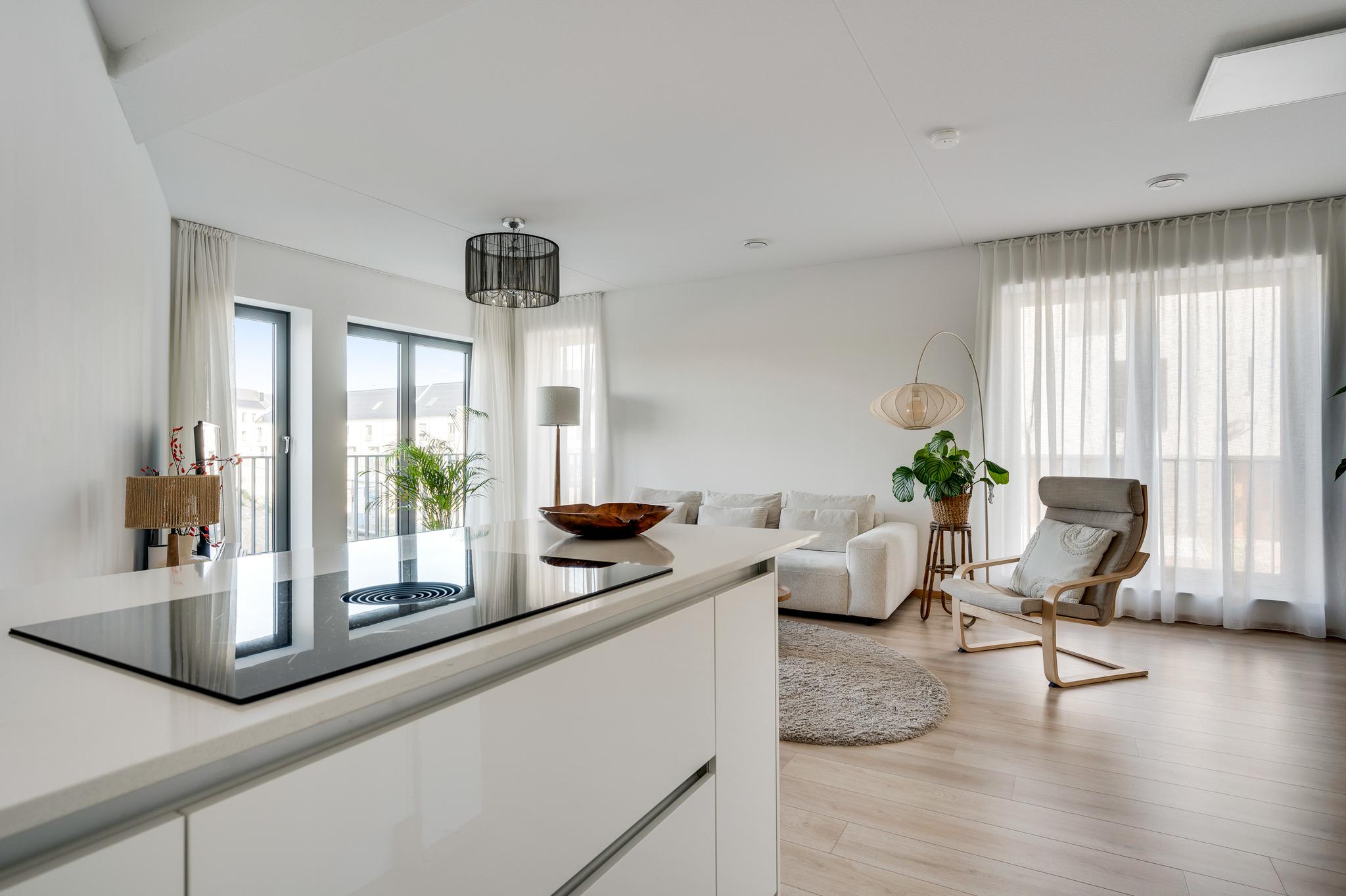 De woonkamer (circa 36 m2 inclusief keuken) is een fraaie leefruimte met grote ramen twee zijden, met het Frans balkon aan de westkant. Speels element is de schuine muur, die ook in de open keuken zichtbaar is. Hier heeft u de beschikking over een kook-/ziteiland en een wandopstelling, met het spoelgedeelte. De Bora inductie kookplaat met afzuiging, combi-oven, vaatwasser en koelkast zijn ingebouwd.