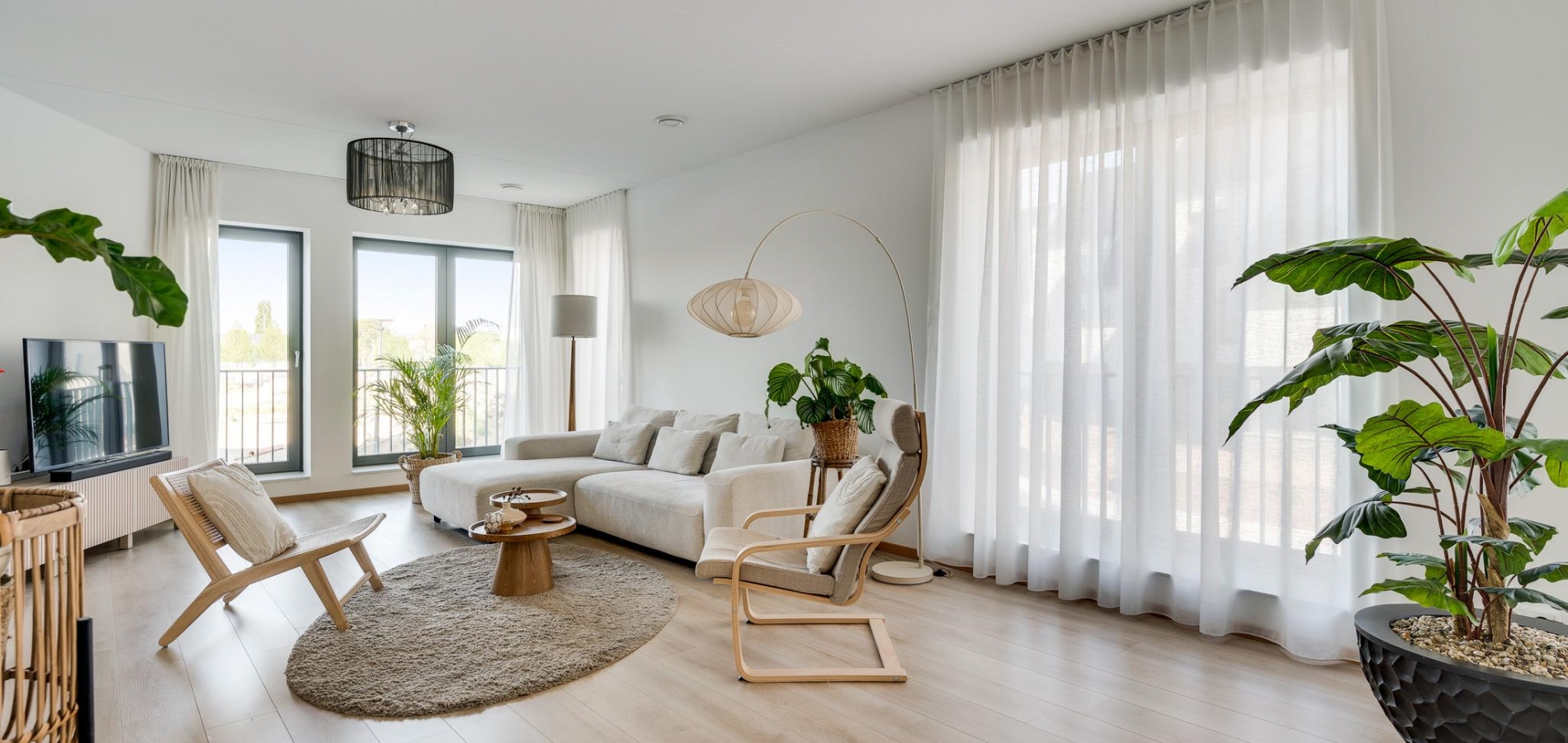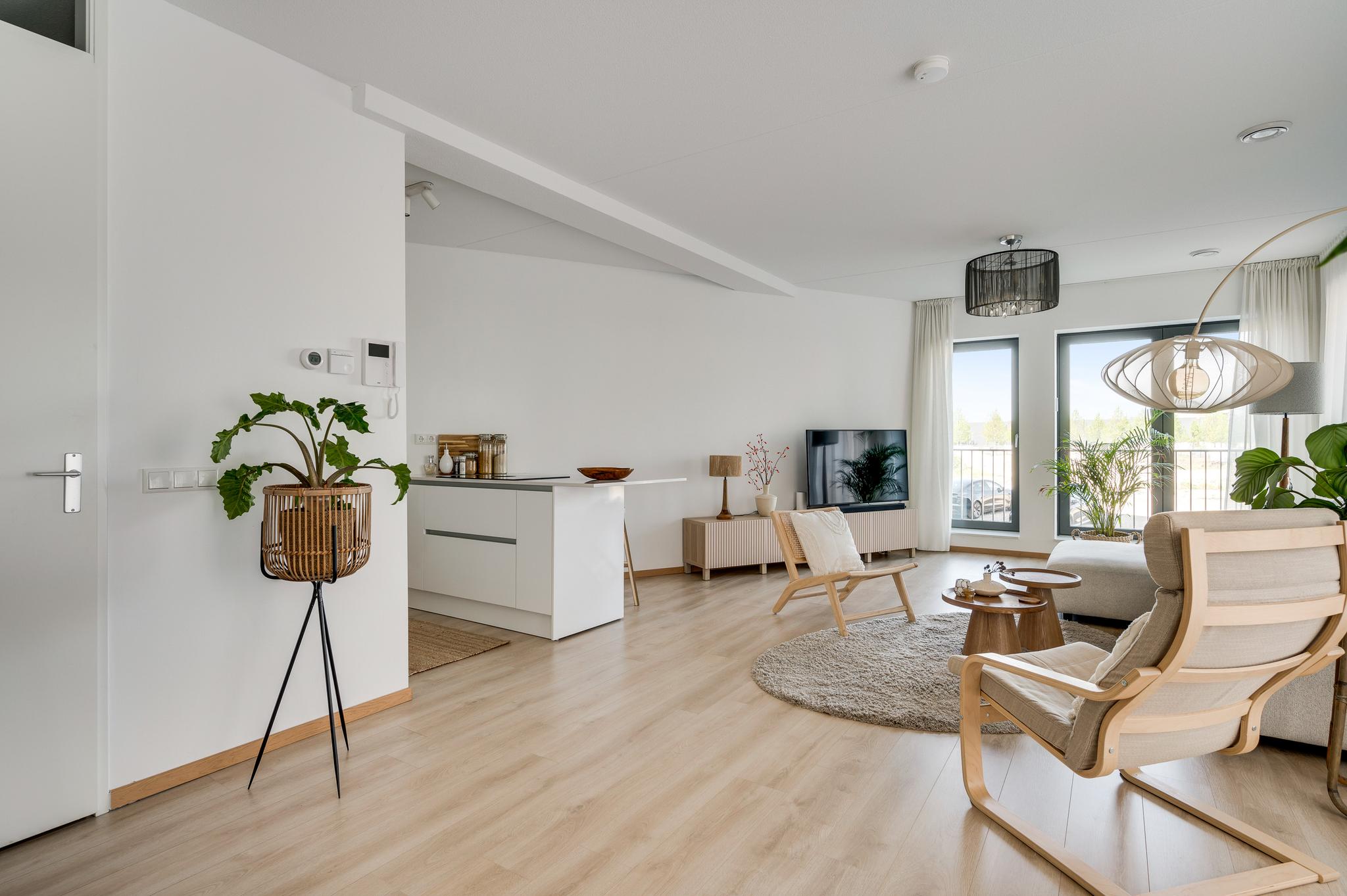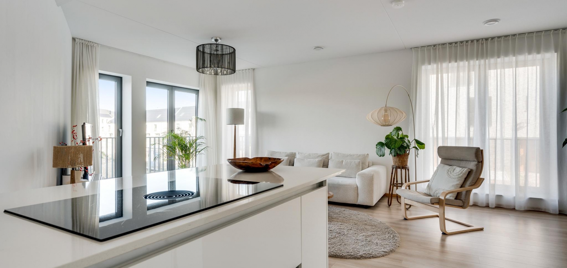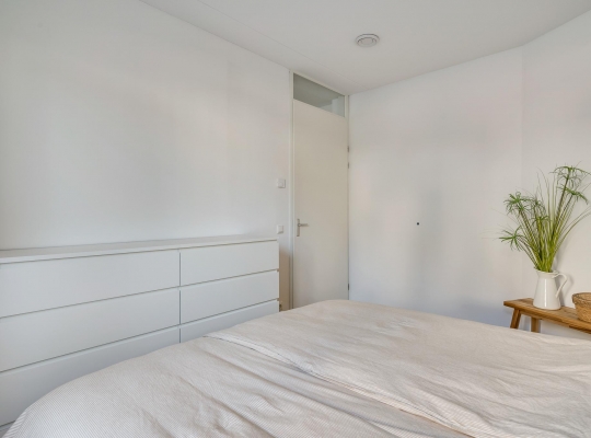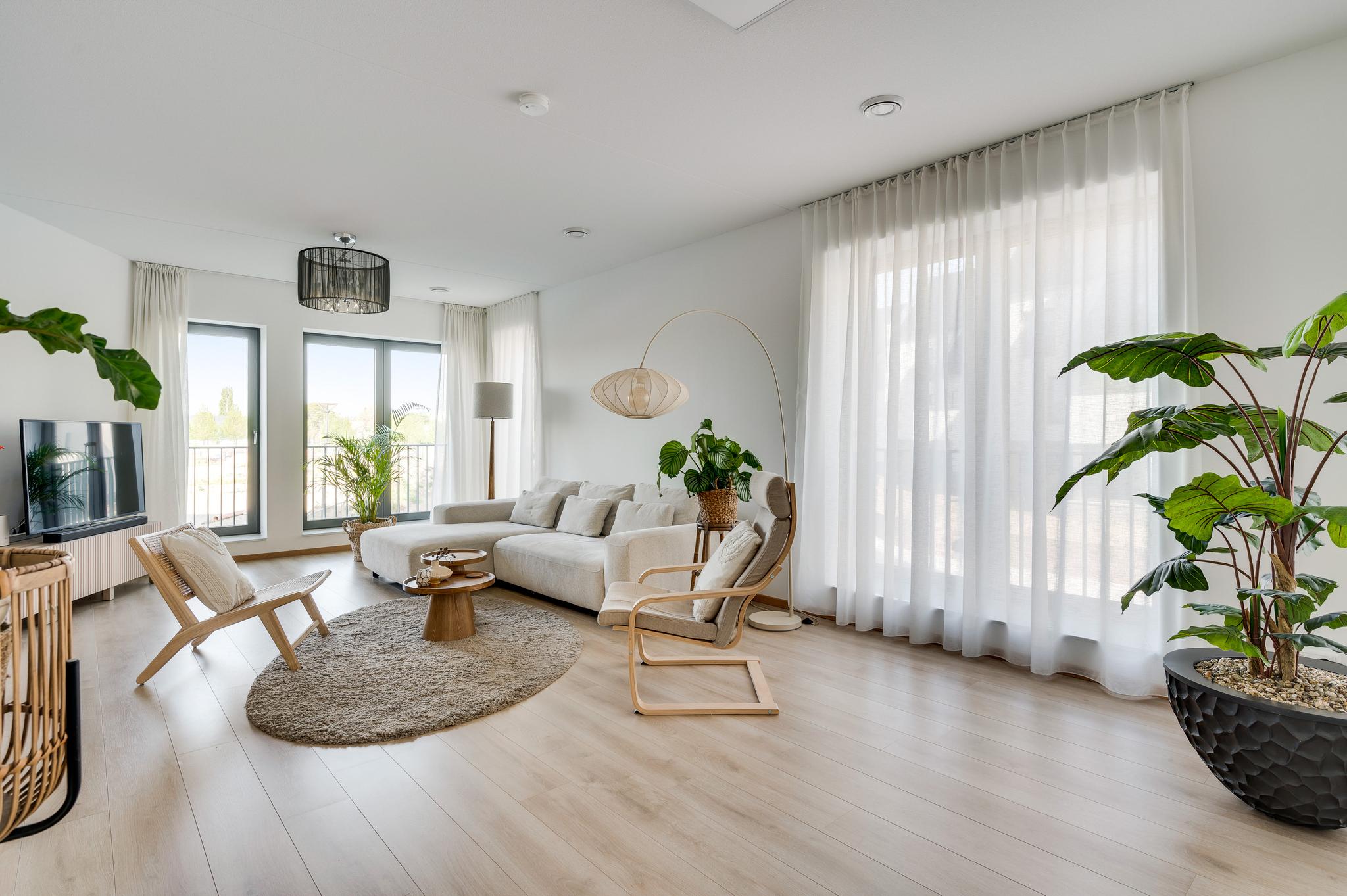 De woonkamer (circa 36 m2 inclusief keuken) is een fraaie leefruimte met grote ramen twee zijden, met het Frans balkon aan de westkant. Speels element is de schuine muur, die ook in de open keuken zichtbaar is. Hier heeft u de beschikking over een kook-/ziteiland en een wandopstelling, met het spoelgedeelte. De Bora inductie kookplaat met afzuiging, combi-oven, vaatwasser en koelkast zijn ingebouwd.