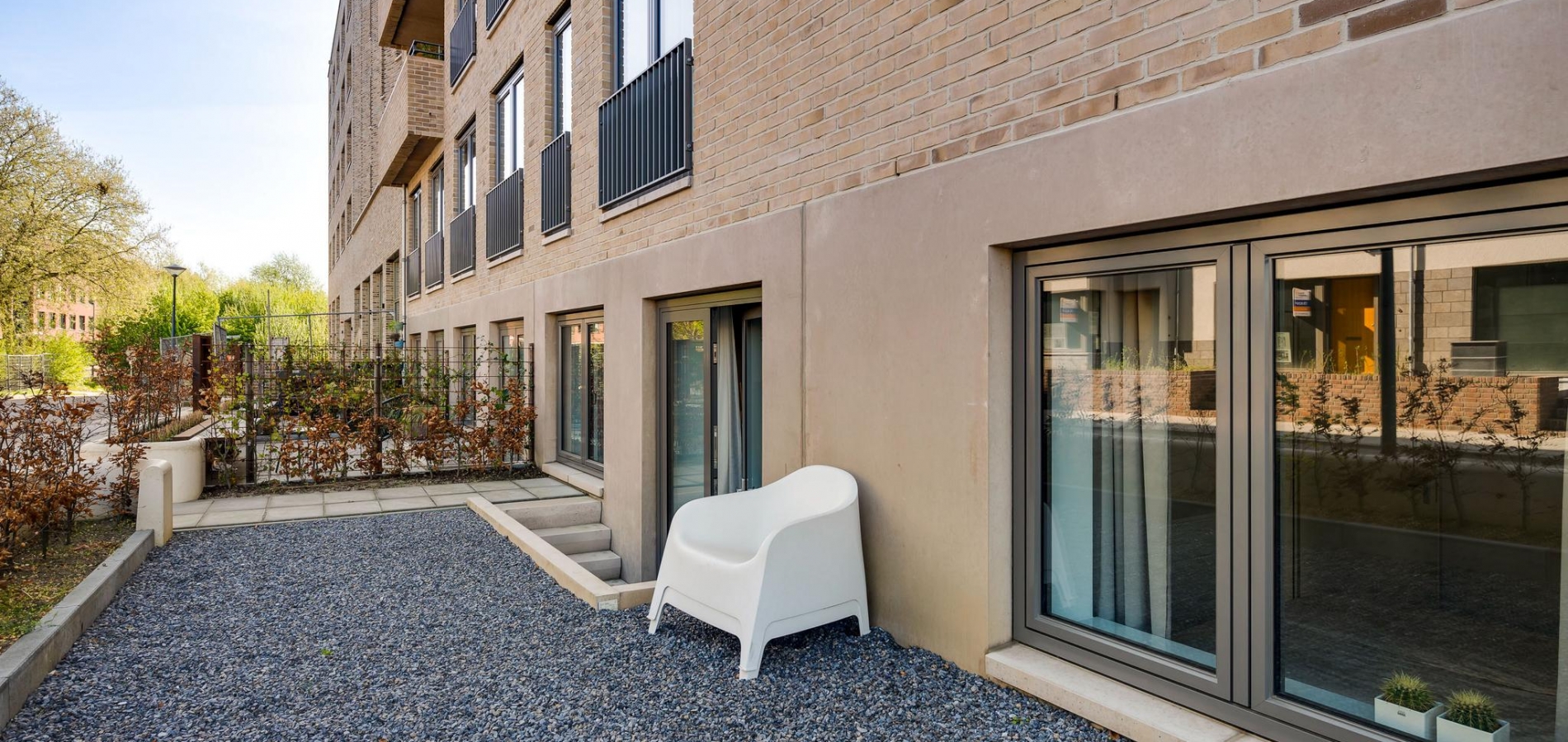 Openslaande deuren in de werk-/logeerkamer geven toegang tot het circa 44 m2 grote terras, met een beukenhaag aan de straatzijde en grind als bodembedekker. Waar de meeste appartementen een klein balkon hebben, heeft dit appartement een buitenruimte van groot formaat.