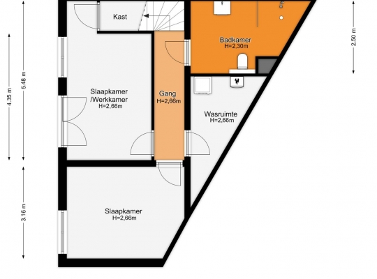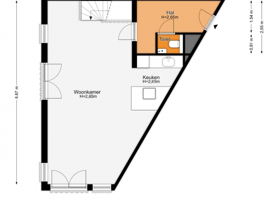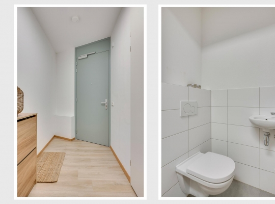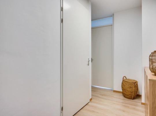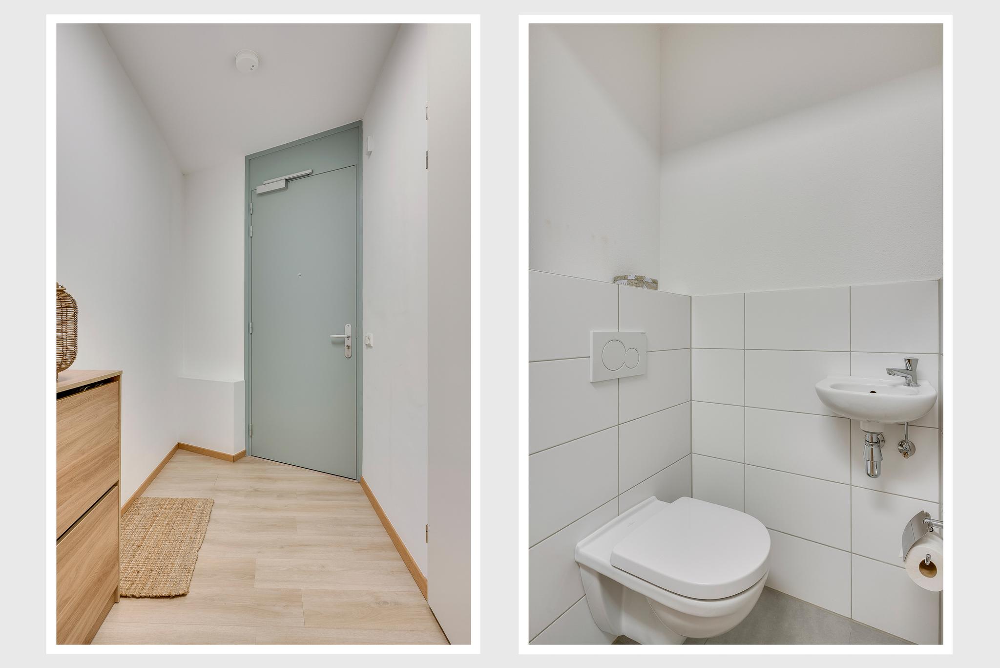 De woonverdieping is gesitueerd boven straatniveau, waardoor er weinig inkijk is. Als eerste is er de hal, met aan de linkerzijde de toiletruimte met fonteintje. In de hal, woonkamer en keuken ligt een mooie laminaatvloer met laagtemperatuur vloerverwarming. De hal is groot genoeg om een schoenenkast is side-table neer te zetten.
