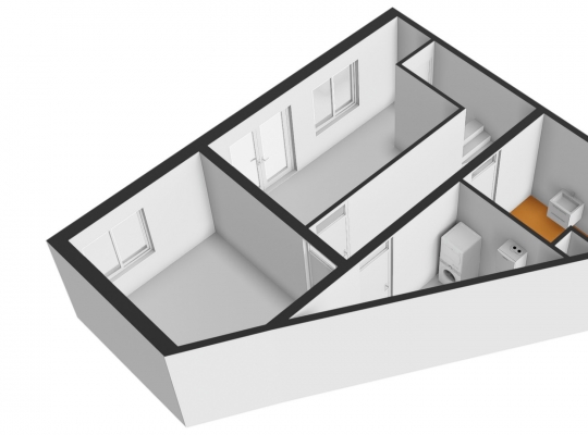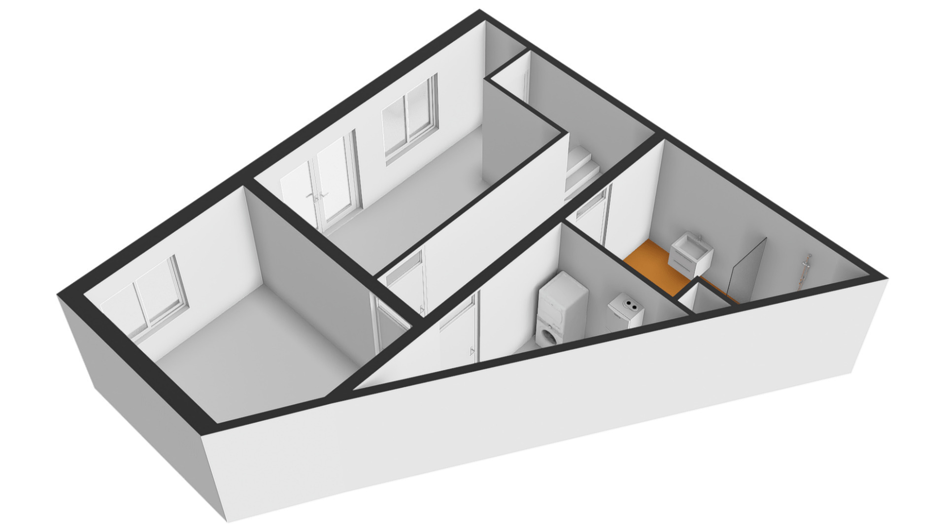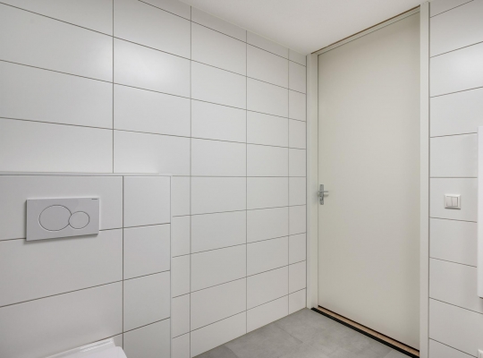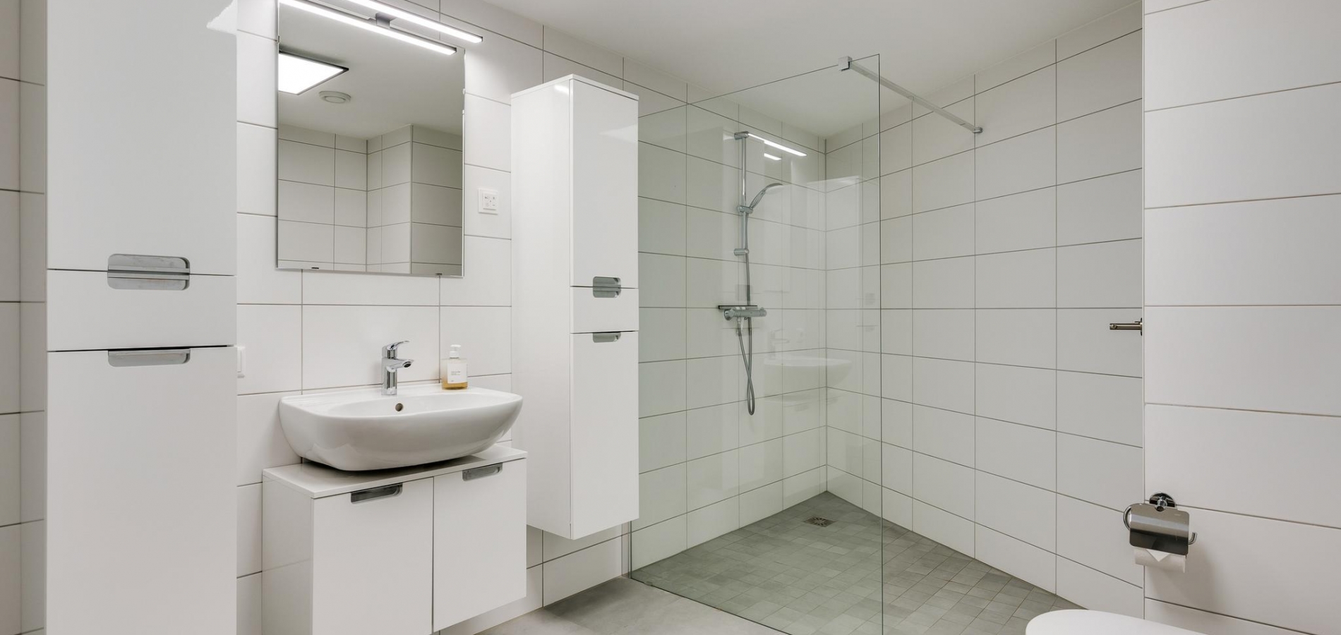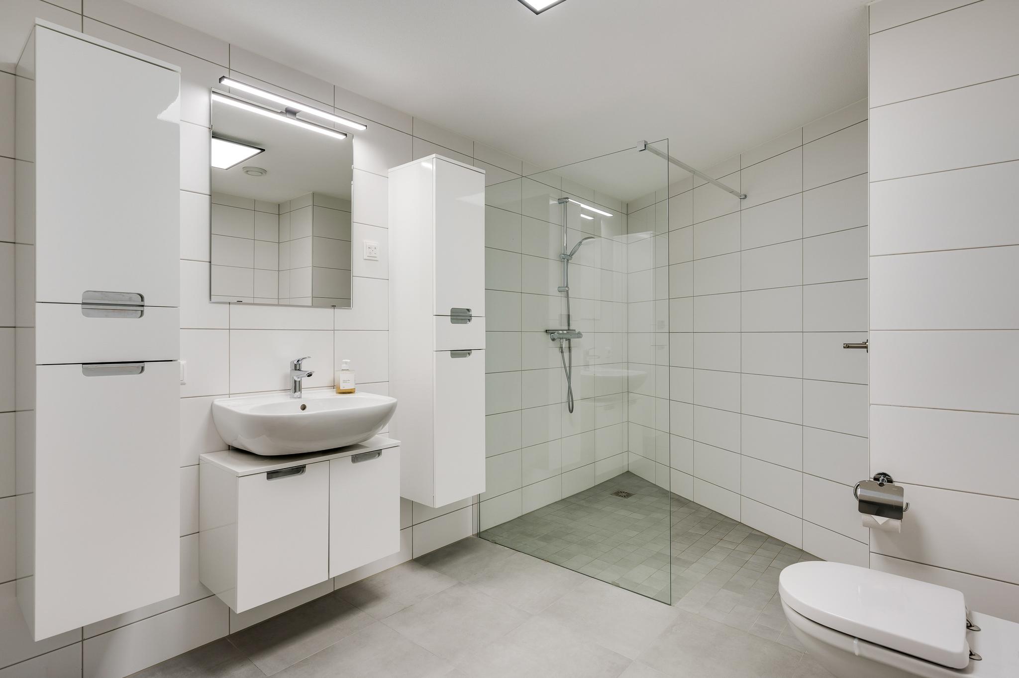 Aan de overzijde van de overloop zijn de berging en de badkamer. In de berging is de opstelling van de warmtepomp, de unit van de vloerverwarming en de wasapparatuur. De badkamer is ingedeeld met een royale inloopdouche, wandcloset en een wastafel. Een wastafelkast en twee hoge zijkasten bieden volop bergruimte.