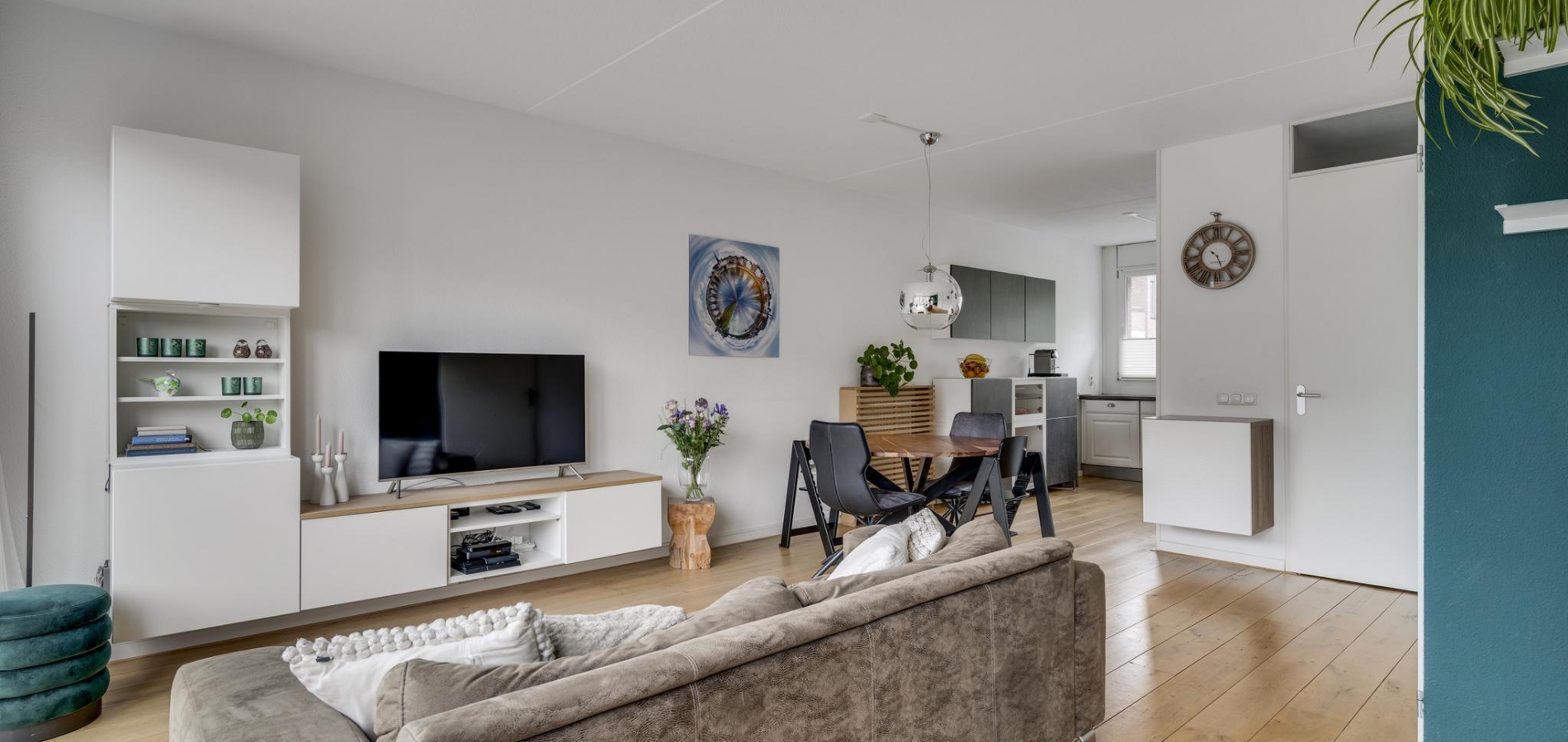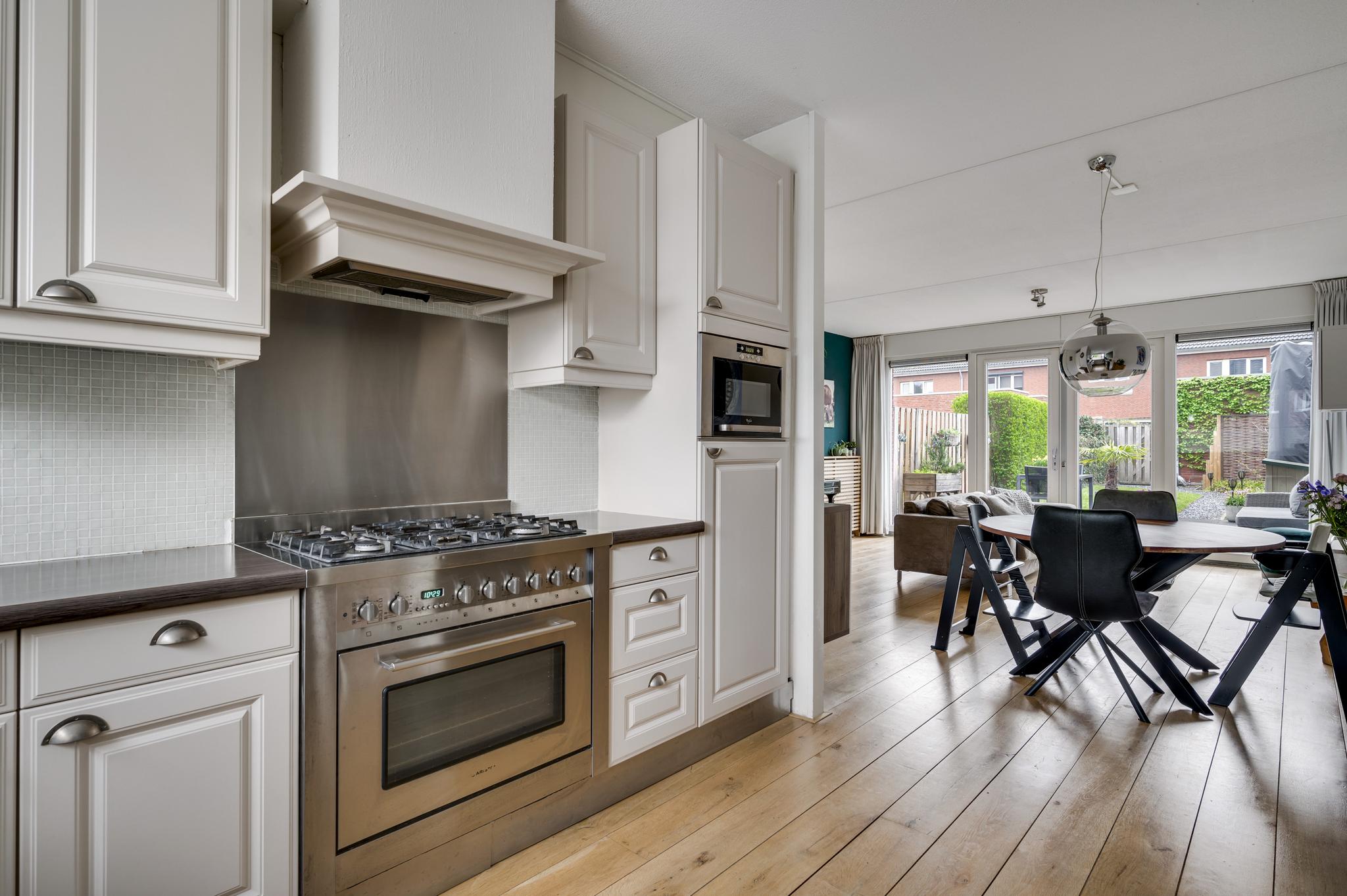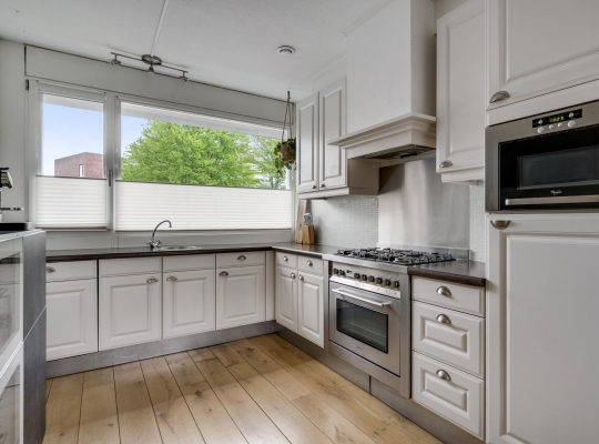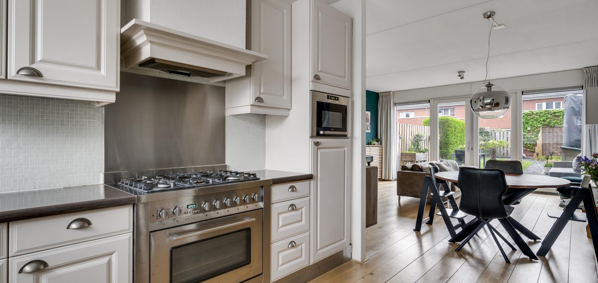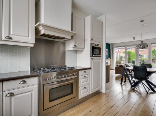 De hal met parketvloer is een mooie ruimte met de gerenoveerde trapopgang en aan de linkerzijde is de toiletruimte met halfhoge, lichte betegeling en een fonteintje. De parketvloer ligt niet alleen in de hal, maar ook in de woonkamer en keuken. De tuingerichte woonkamer (ca. 25 m²) heeft grote ramen en openslaande deuren aan de zuidkant. Onder de trap is een bergkast en aan de voorzijde is de open keuken (3.60 x 2.73), waar een grote hoekopstelling in een landelijke stijl staat. Alle benodigde apparatuur is ingebouwd: een groot gasfornuis met oven, een afzuigkap, koelkast, magnetron en een vaatwasser.