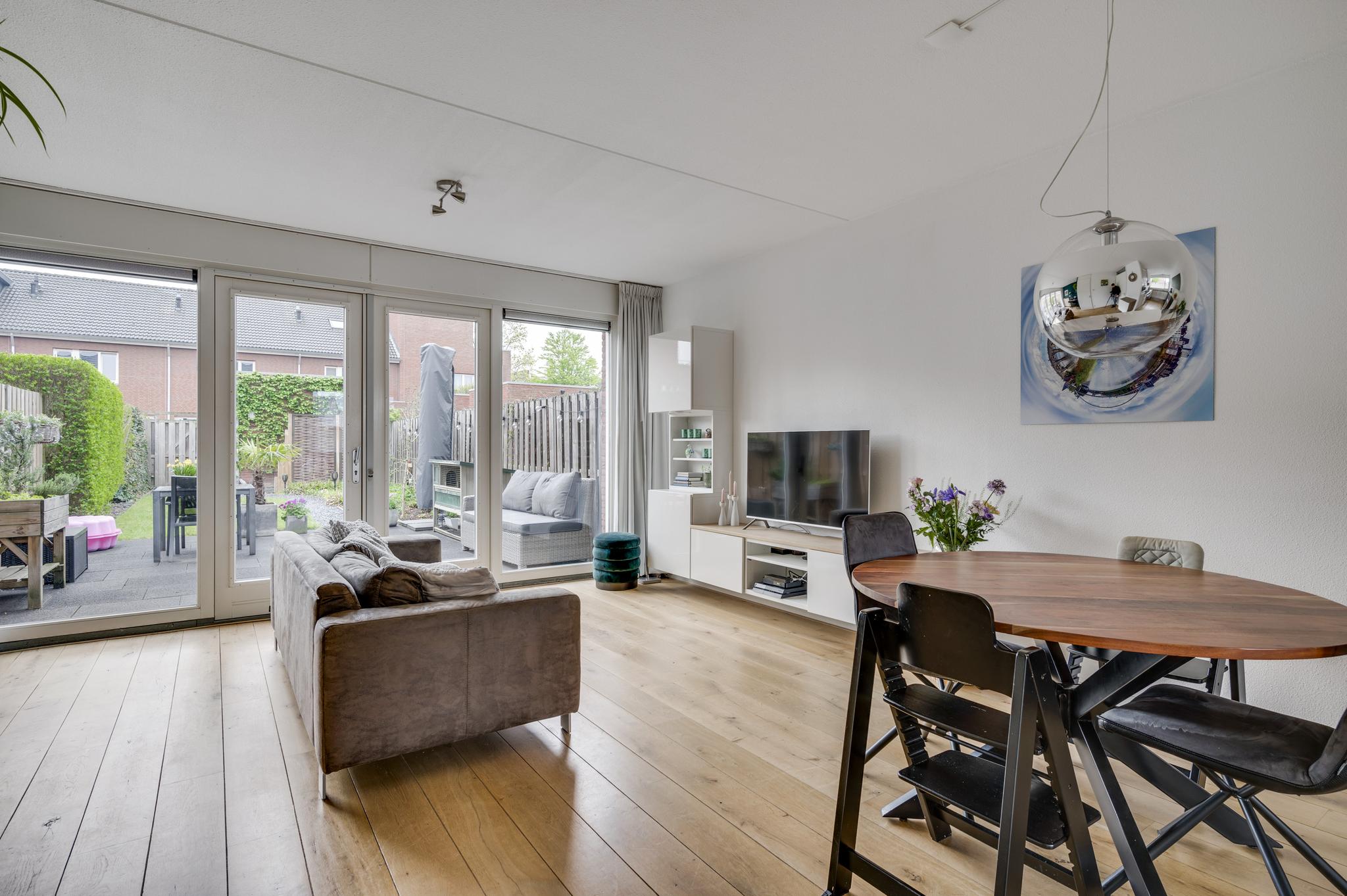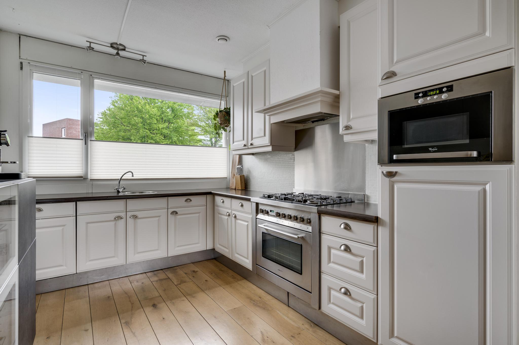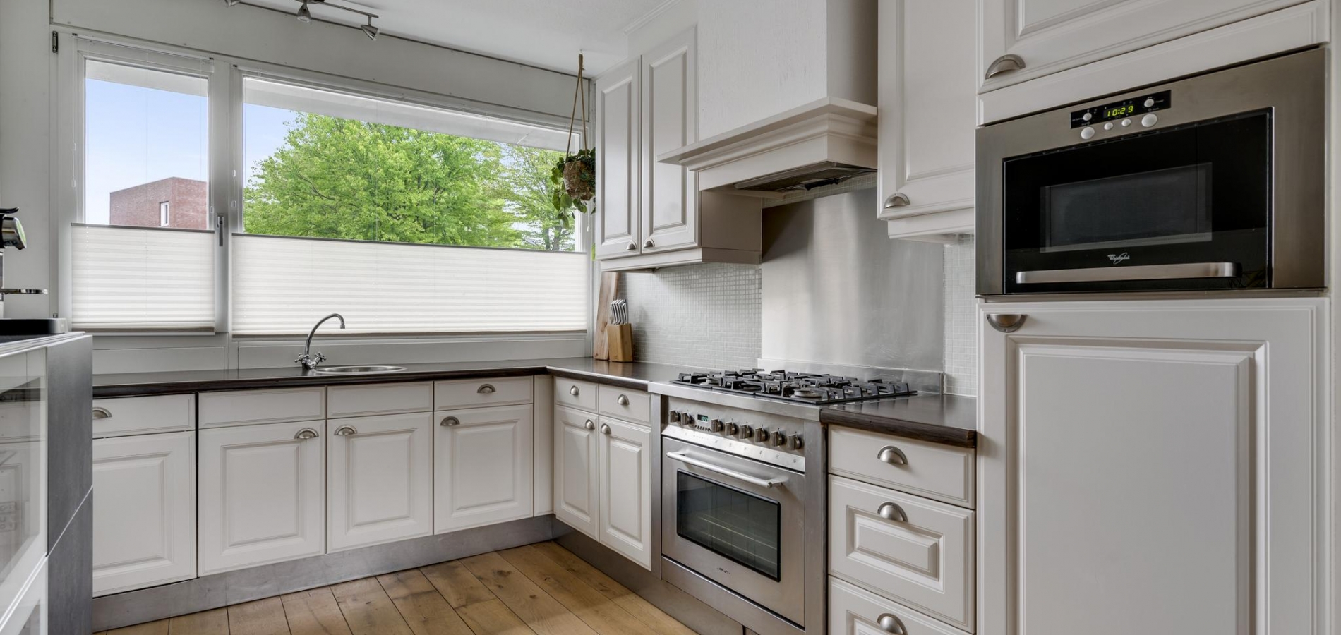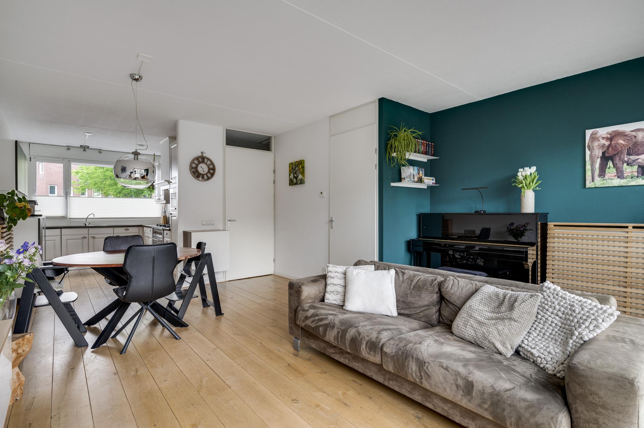 De hal met parketvloer is een mooie ruimte met de gerenoveerde trapopgang en aan de linkerzijde is de toiletruimte met halfhoge, lichte betegeling en een fonteintje. De parketvloer ligt niet alleen in de hal, maar ook in de woonkamer en keuken. De tuingerichte woonkamer (ca. 25 m²) heeft grote ramen en openslaande deuren aan de zuidkant. Onder de trap is een bergkast en aan de voorzijde is de open keuken (3.60 x 2.73), waar een grote hoekopstelling in een landelijke stijl staat. Alle benodigde apparatuur is ingebouwd: een groot gasfornuis met oven, een afzuigkap, koelkast, magnetron en een vaatwasser.