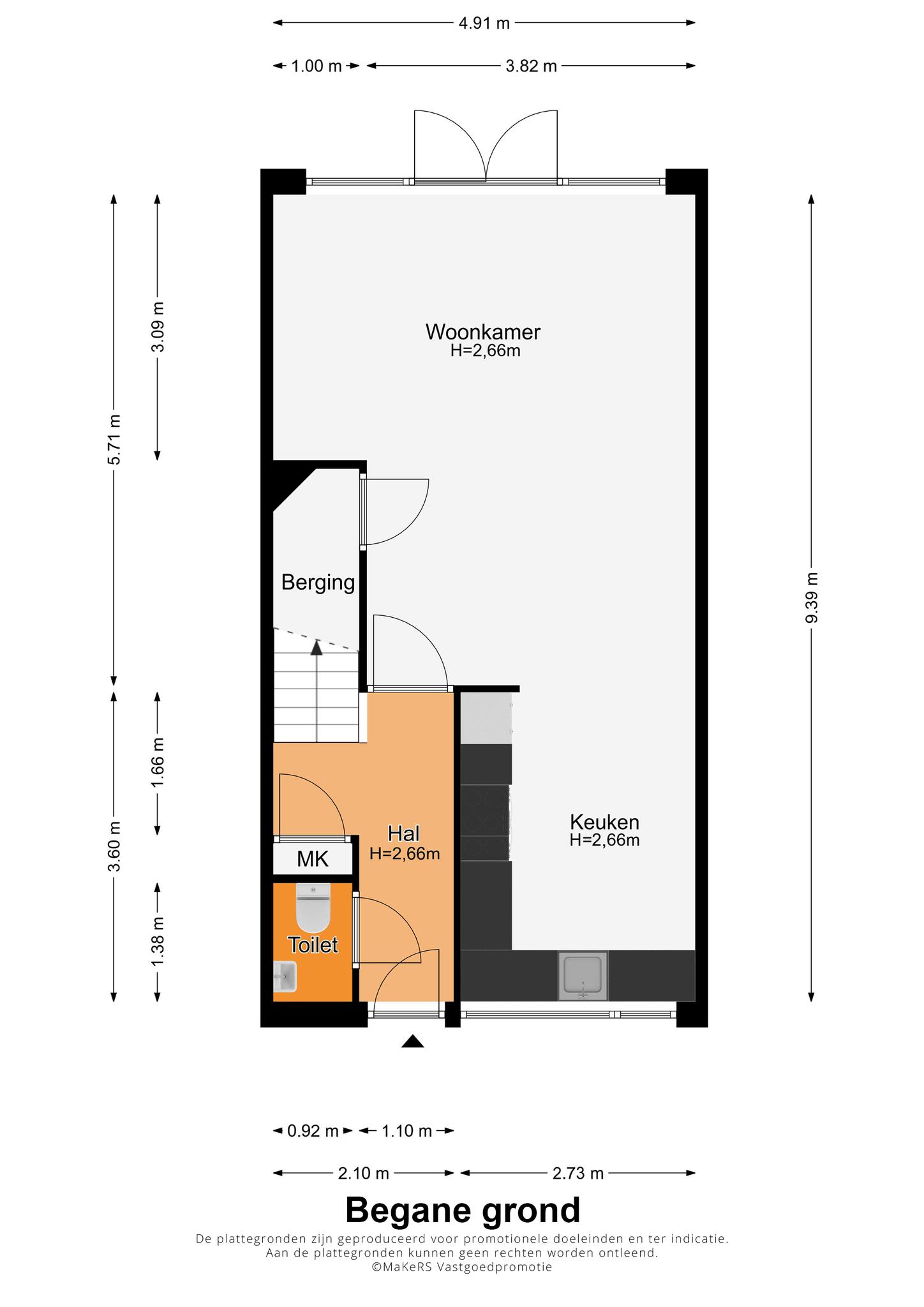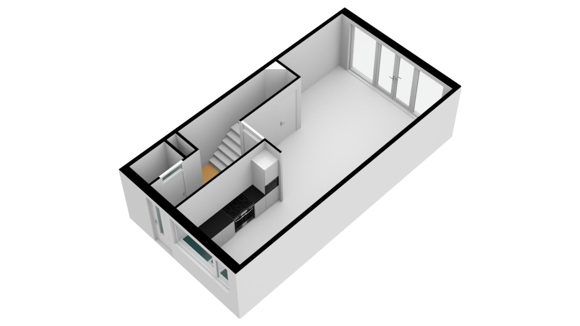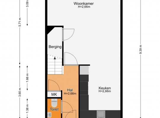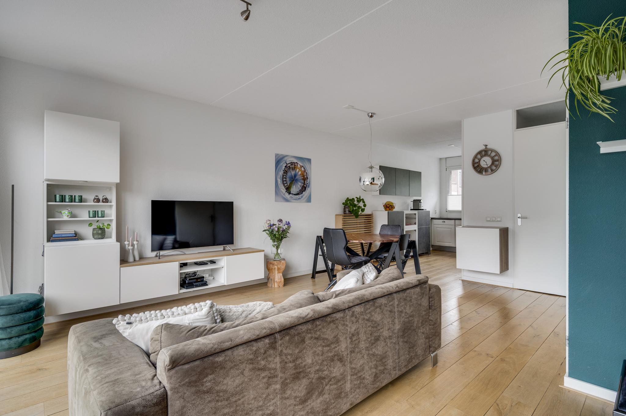 De hal met parketvloer is een mooie ruimte met de gerenoveerde trapopgang en aan de linkerzijde is de toiletruimte met halfhoge, lichte betegeling en een fonteintje. De parketvloer ligt niet alleen in de hal, maar ook in de woonkamer en keuken. De tuingerichte woonkamer (ca. 25 m²) heeft grote ramen en openslaande deuren aan de zuidkant. Onder de trap is een bergkast en aan de voorzijde is de open keuken (3.60 x 2.73), waar een grote hoekopstelling in een landelijke stijl staat. Alle benodigde apparatuur is ingebouwd: een groot gasfornuis met oven, een afzuigkap, koelkast, magnetron en een vaatwasser.