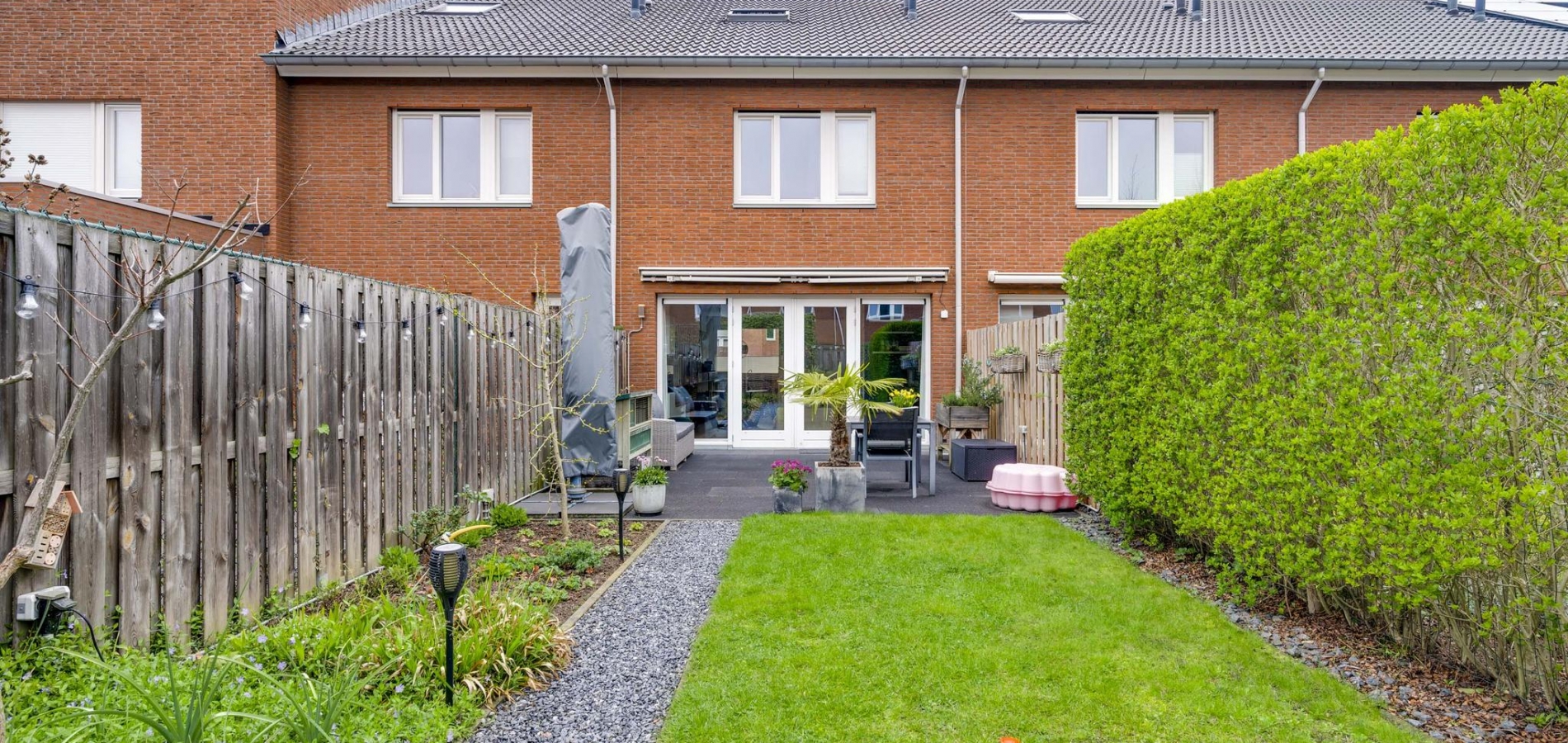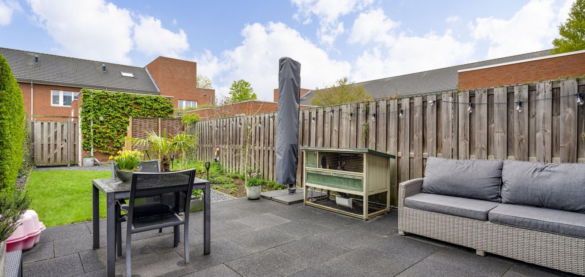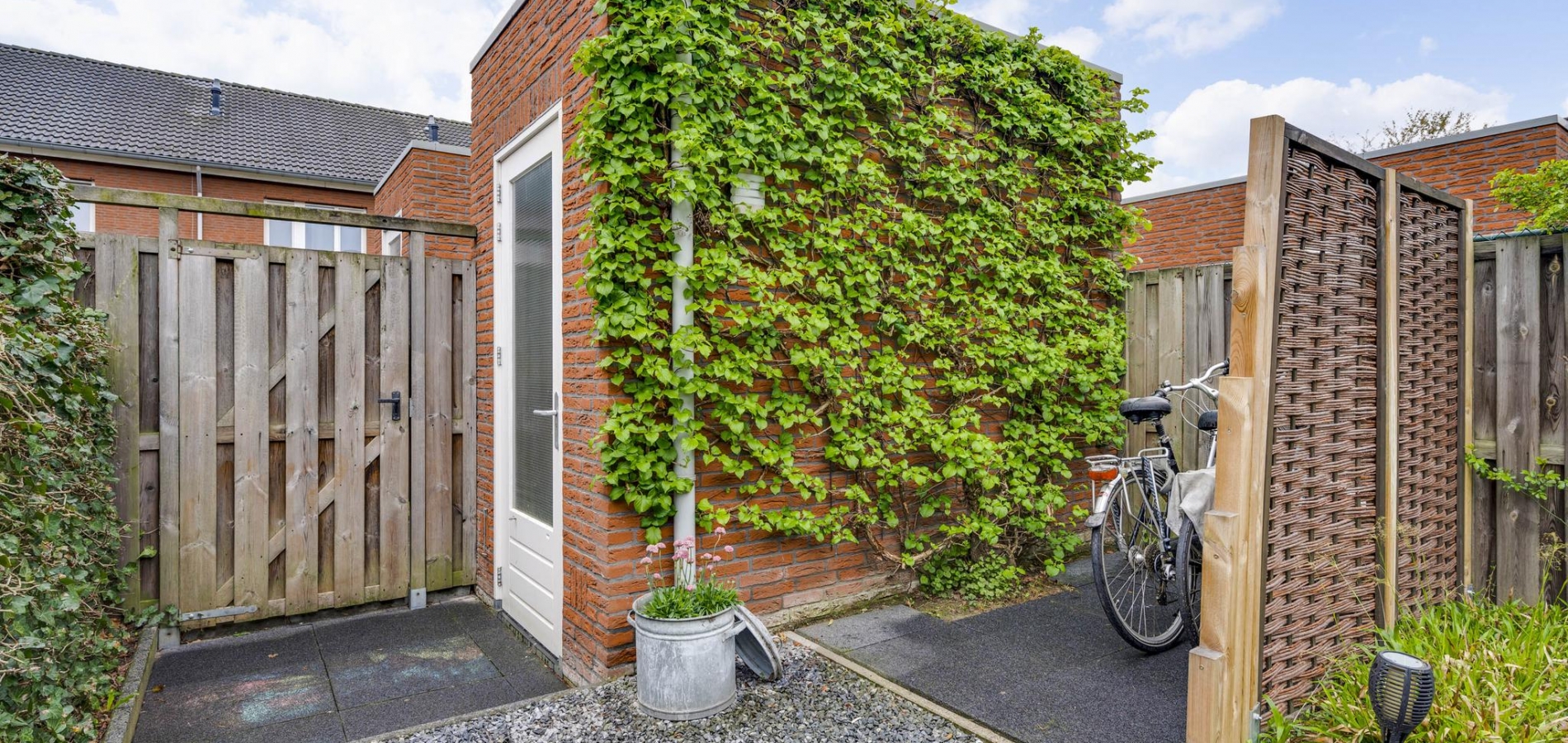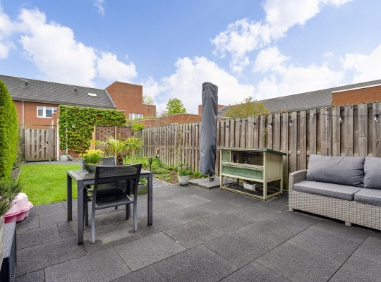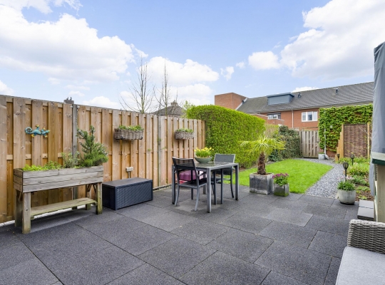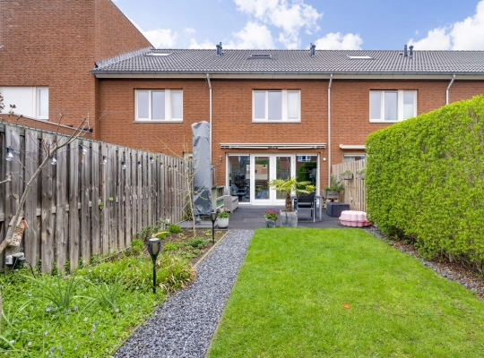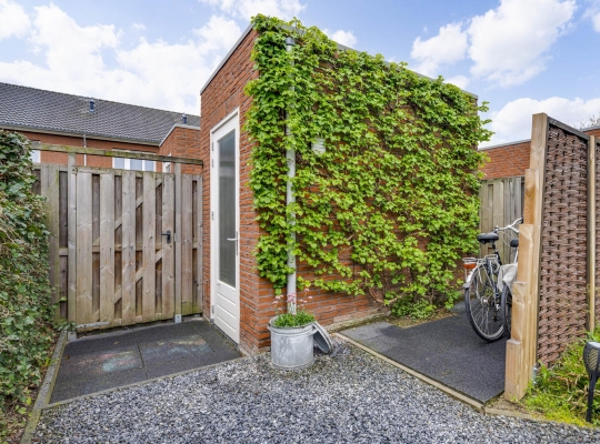 Deze instapklare woning heeft een meer dan 14 meter diepe tuin op het zonnige zuiden. Boven het grote terras hangt een elektrisch bedienbaar uitvalscherm en de rest van de tuin is ingedeeld met gras, grind en lage beplanting. Achter in de tuin ziet u een fietsenstalling, de berging en een poort naar de steeg.