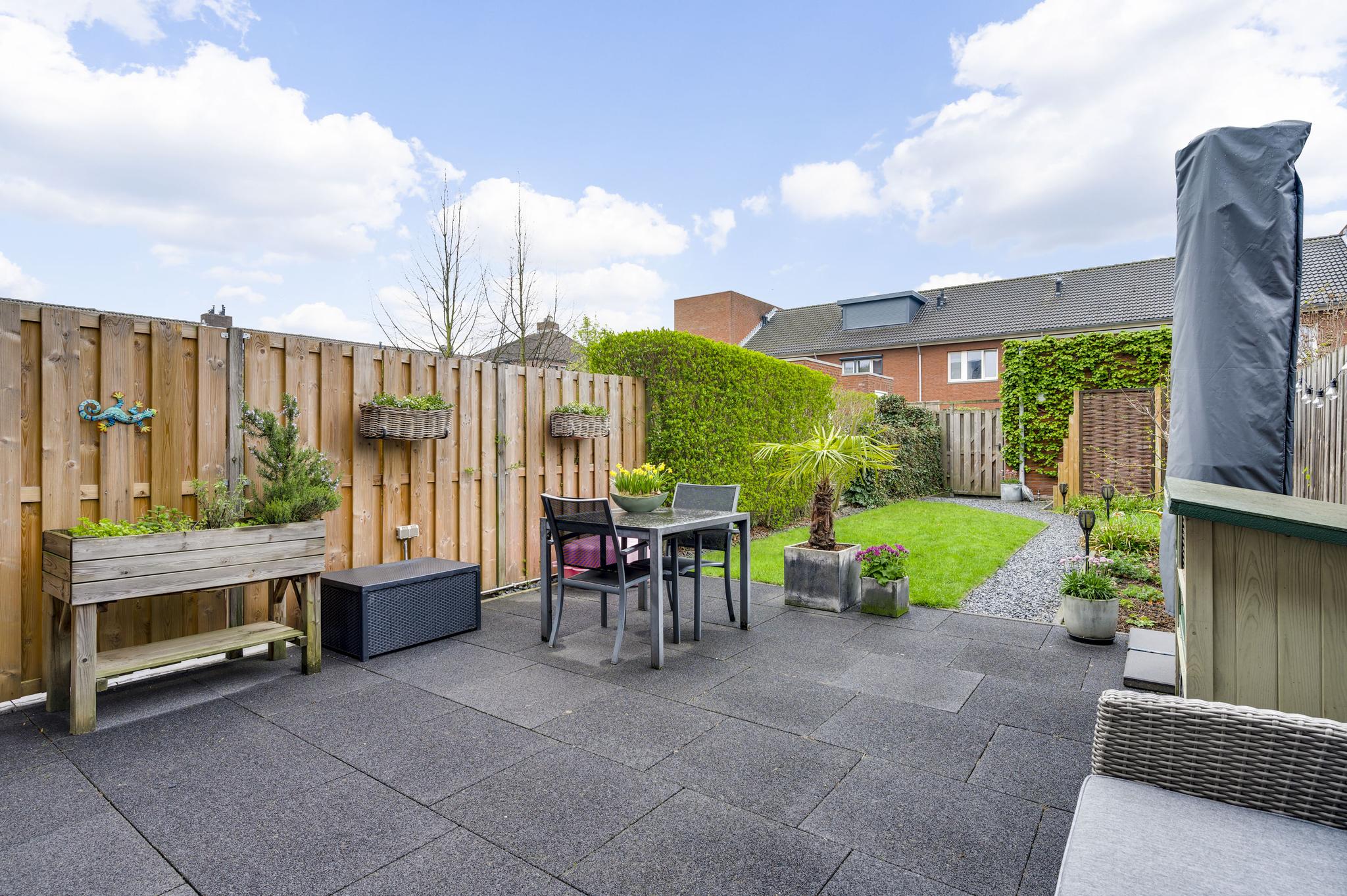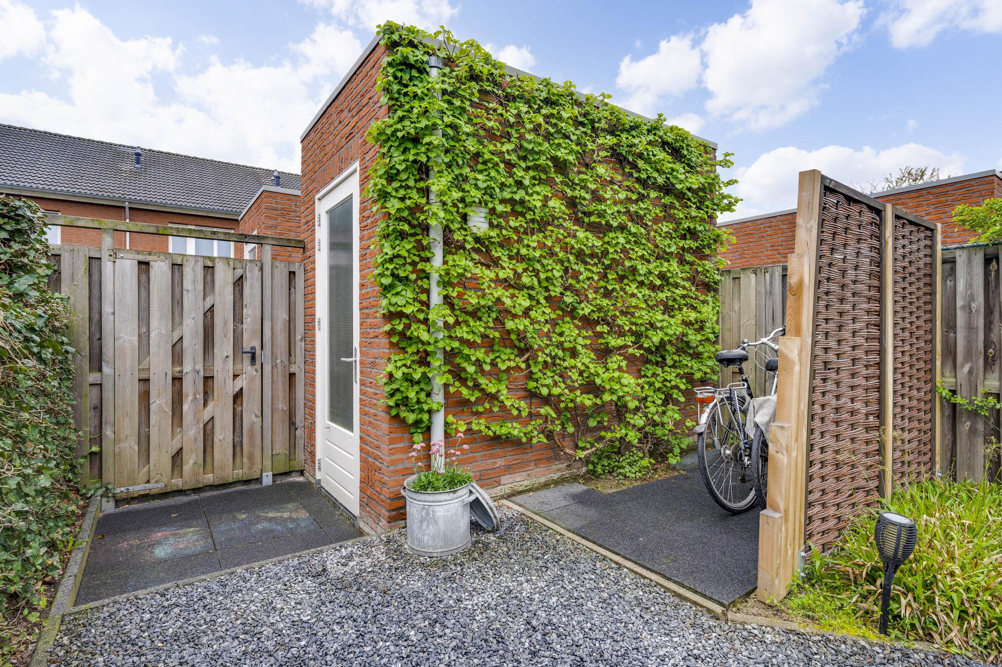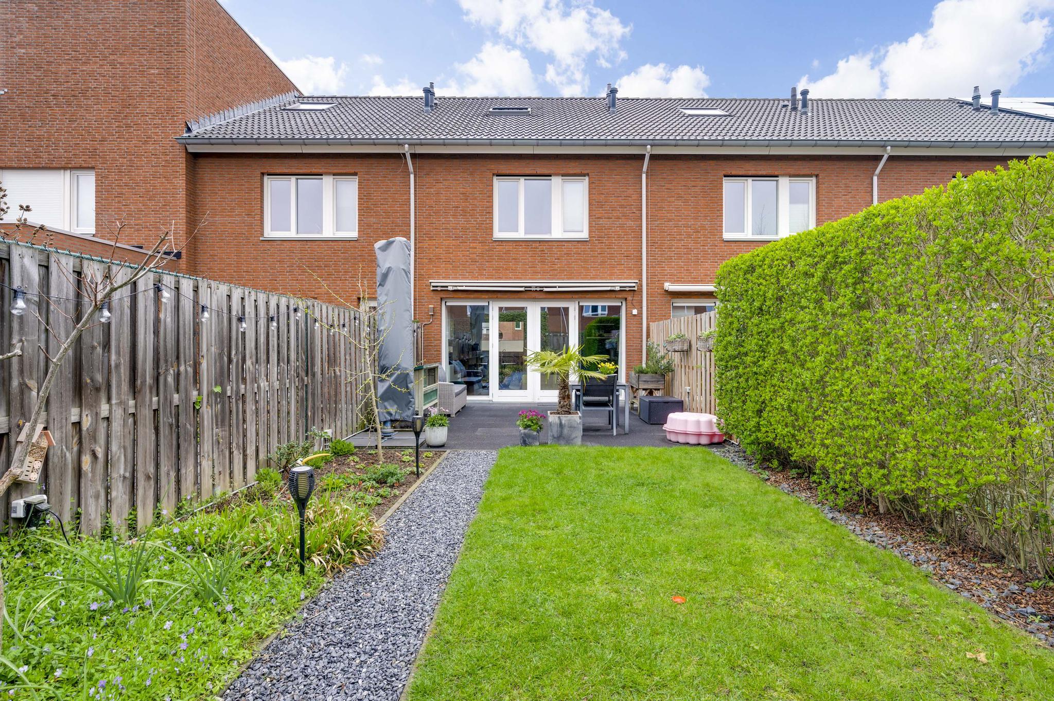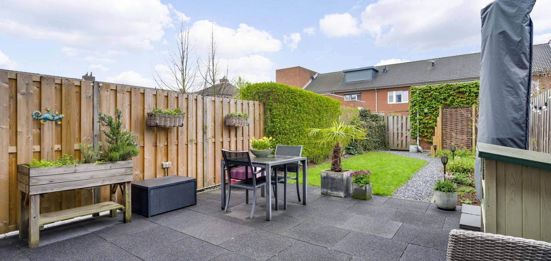 Deze instapklare woning heeft een meer dan 14 meter diepe tuin op het zonnige zuiden. Boven het grote terras hangt een elektrisch bedienbaar uitvalscherm en de rest van de tuin is ingedeeld met gras, grind en lage beplanting. Achter in de tuin ziet u een fietsenstalling, de berging en een poort naar de steeg.