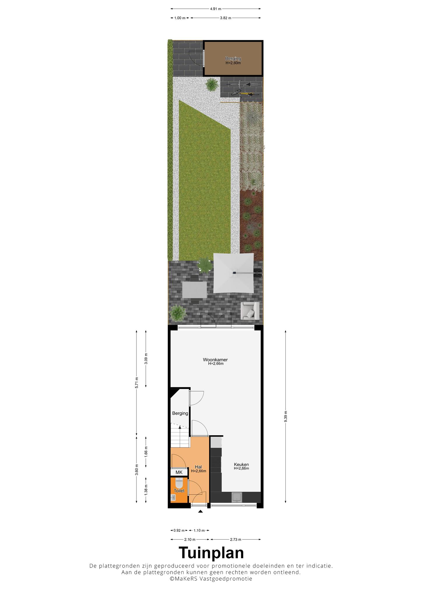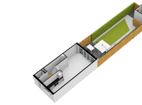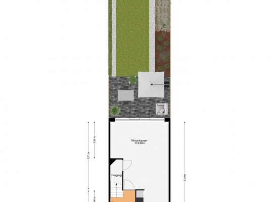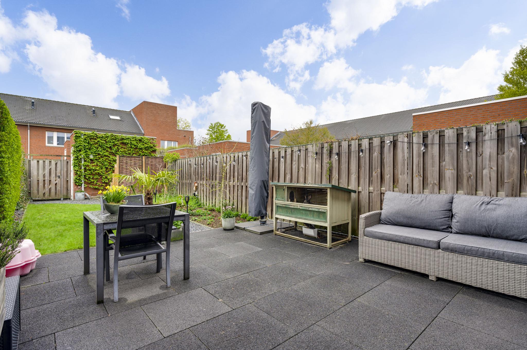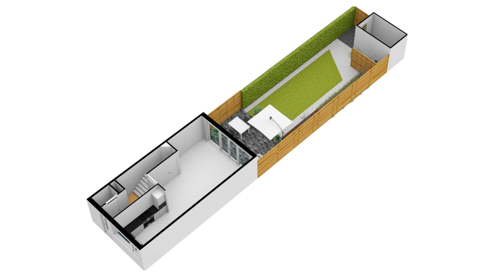 Deze instapklare woning heeft een meer dan 14 meter diepe tuin op het zonnige zuiden. Boven het grote terras hangt een elektrisch bedienbaar uitvalscherm en de rest van de tuin is ingedeeld met gras, grind en lage beplanting. Achter in de tuin ziet u een fietsenstalling, de berging en een poort naar de steeg.