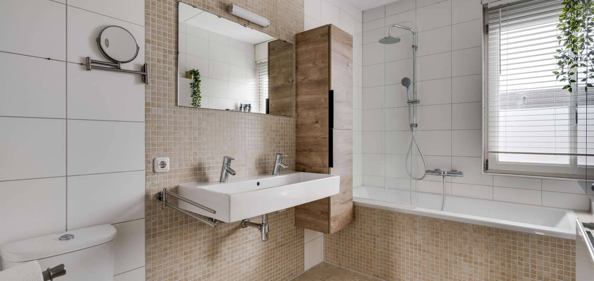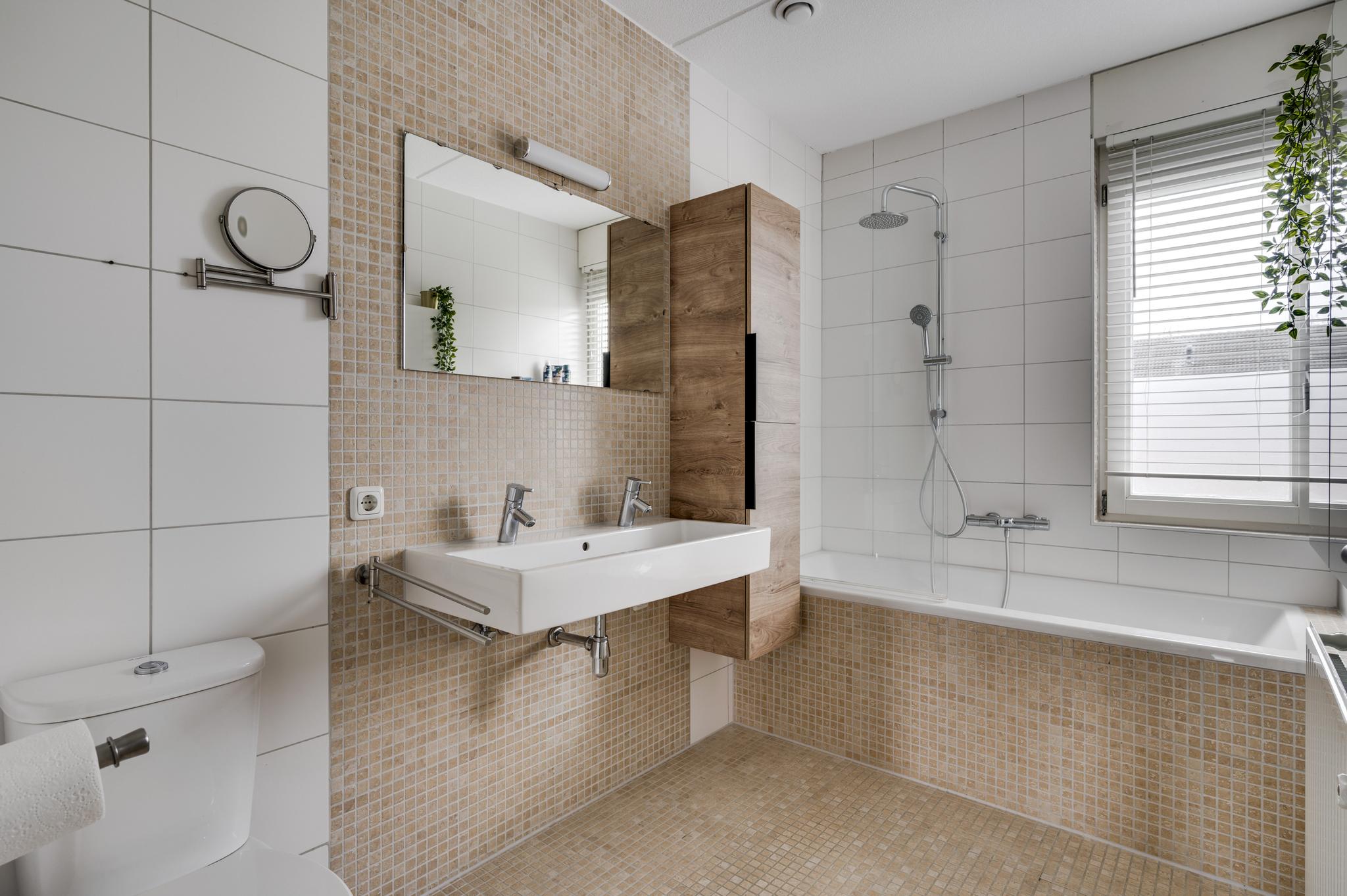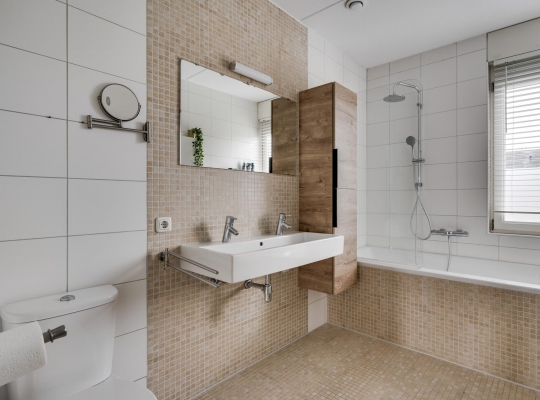 De lichte badkamer (3.09 x 1.88) is ingedeeld met een ligbad/douche, tweepersoons wastafel met spiegel en een tweede toilet. Zowel de wanden als de vloer zijn betegeld in een rustige kleurencombinatie.