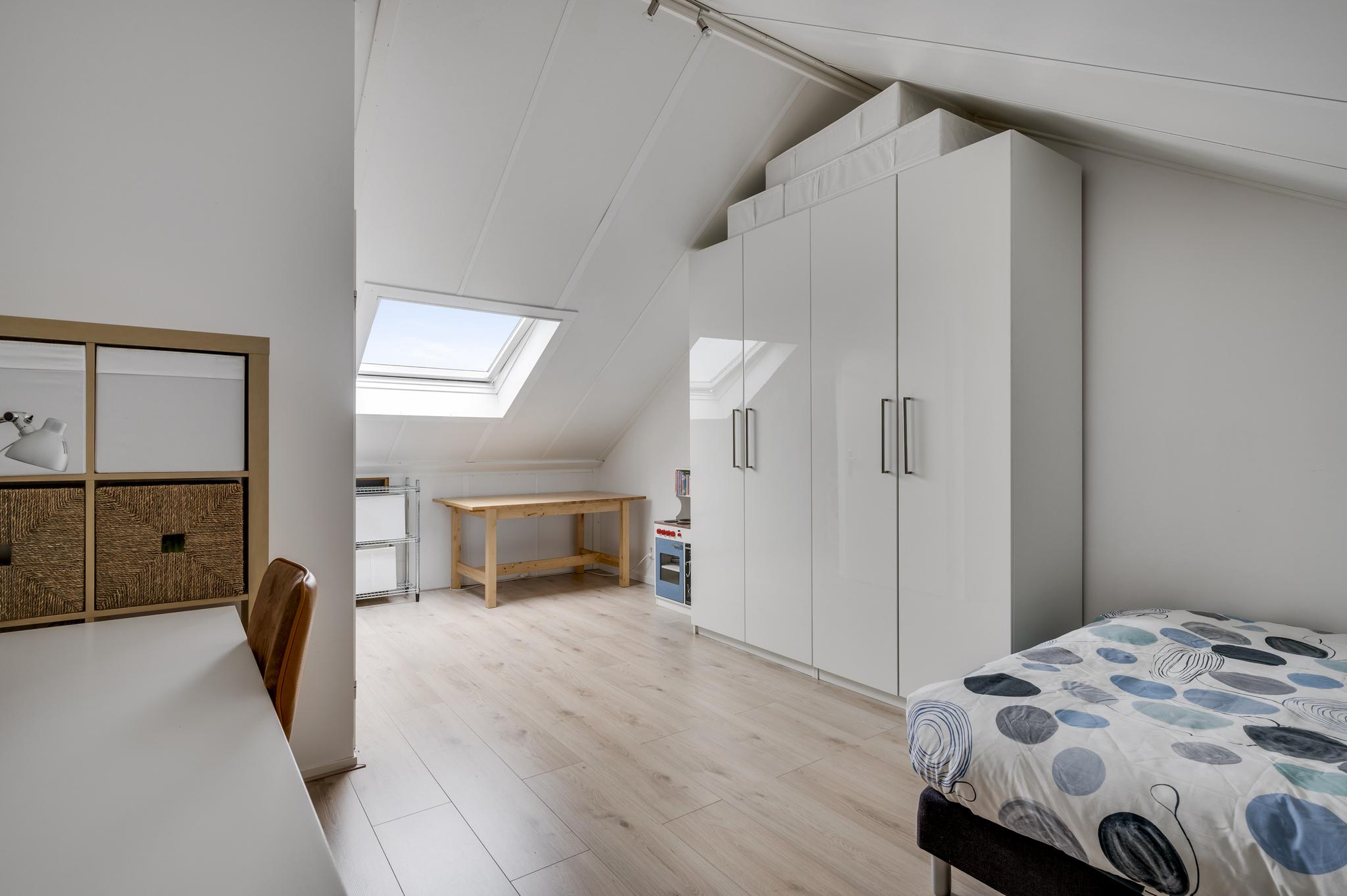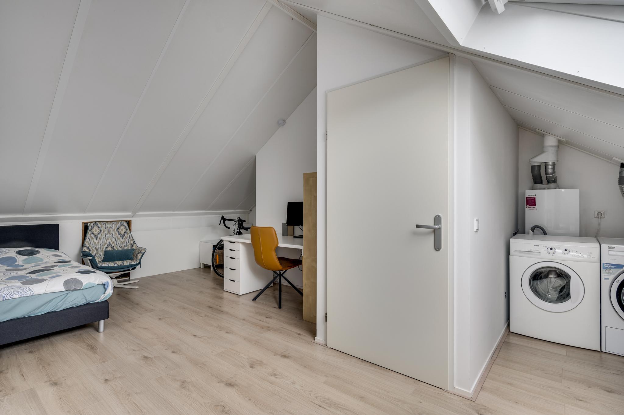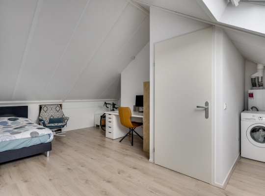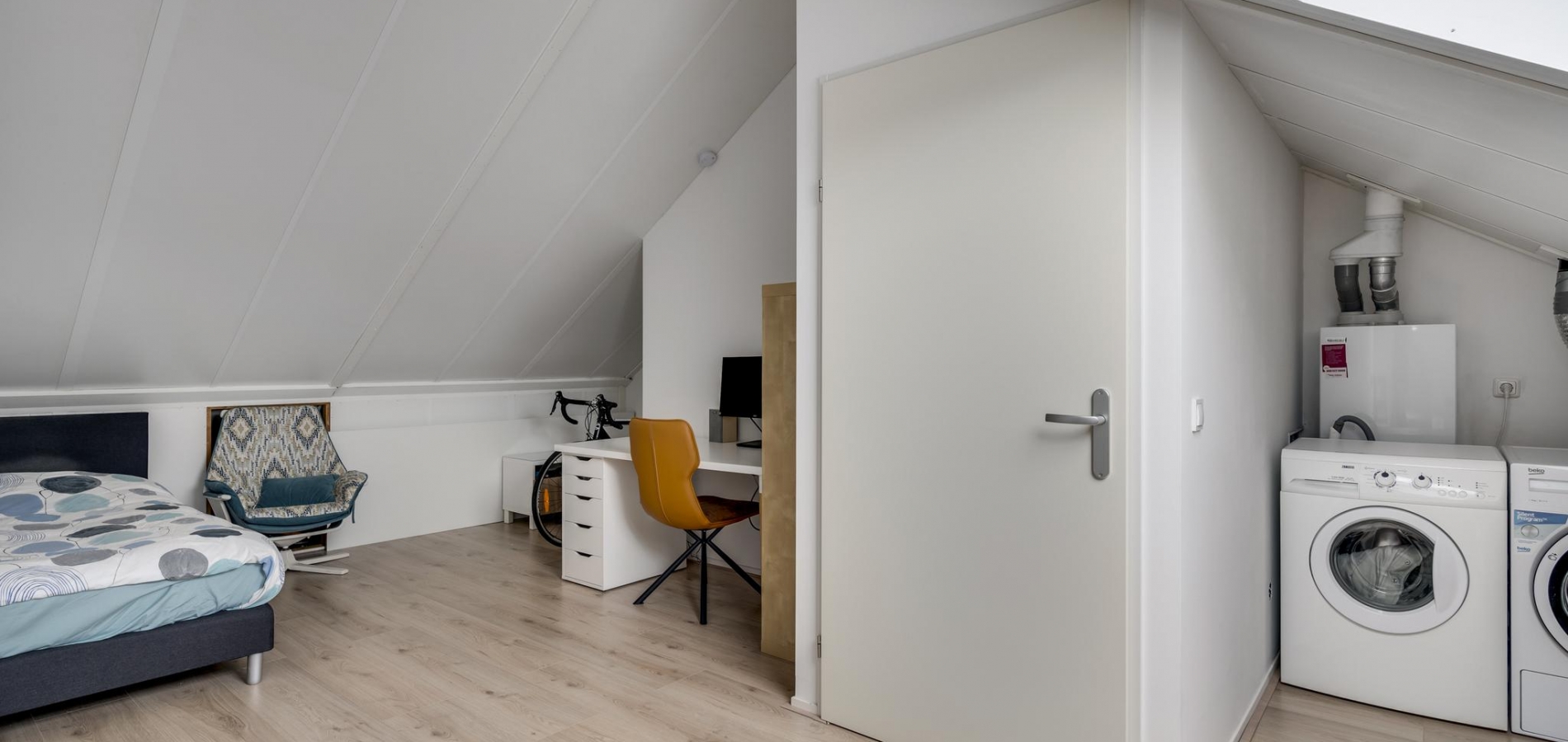 Er is een vaste trap naar de tweede verdieping. Via een portaal is de zeer grote slaap-/werkkamer te bereiken, met een laminaatvloer en een dakraam aan de achterzijde. In de hoek, bij de HR-ketel, staan de wasmachine en droger opgesteld.