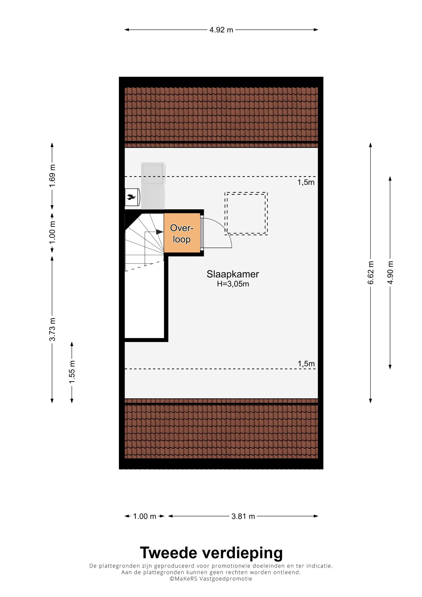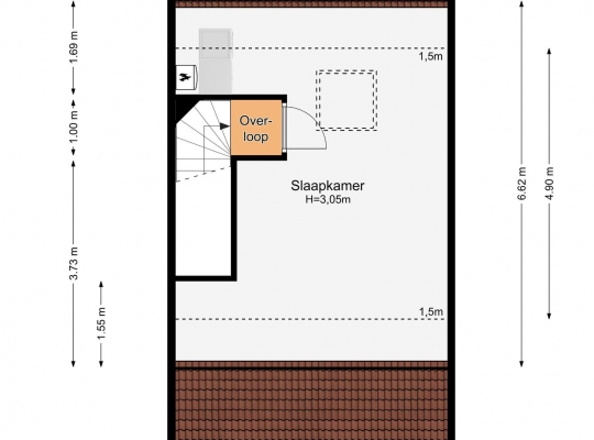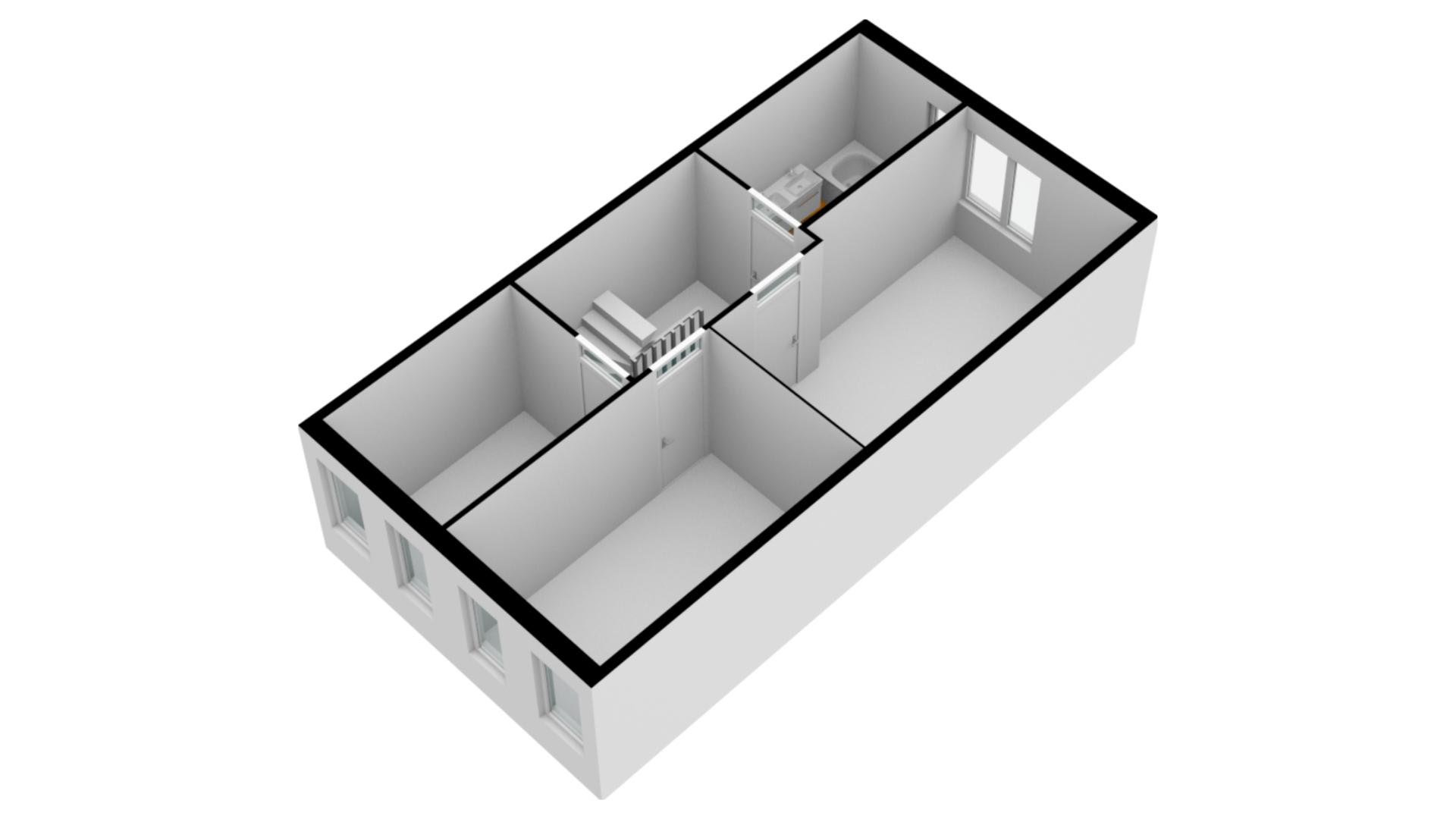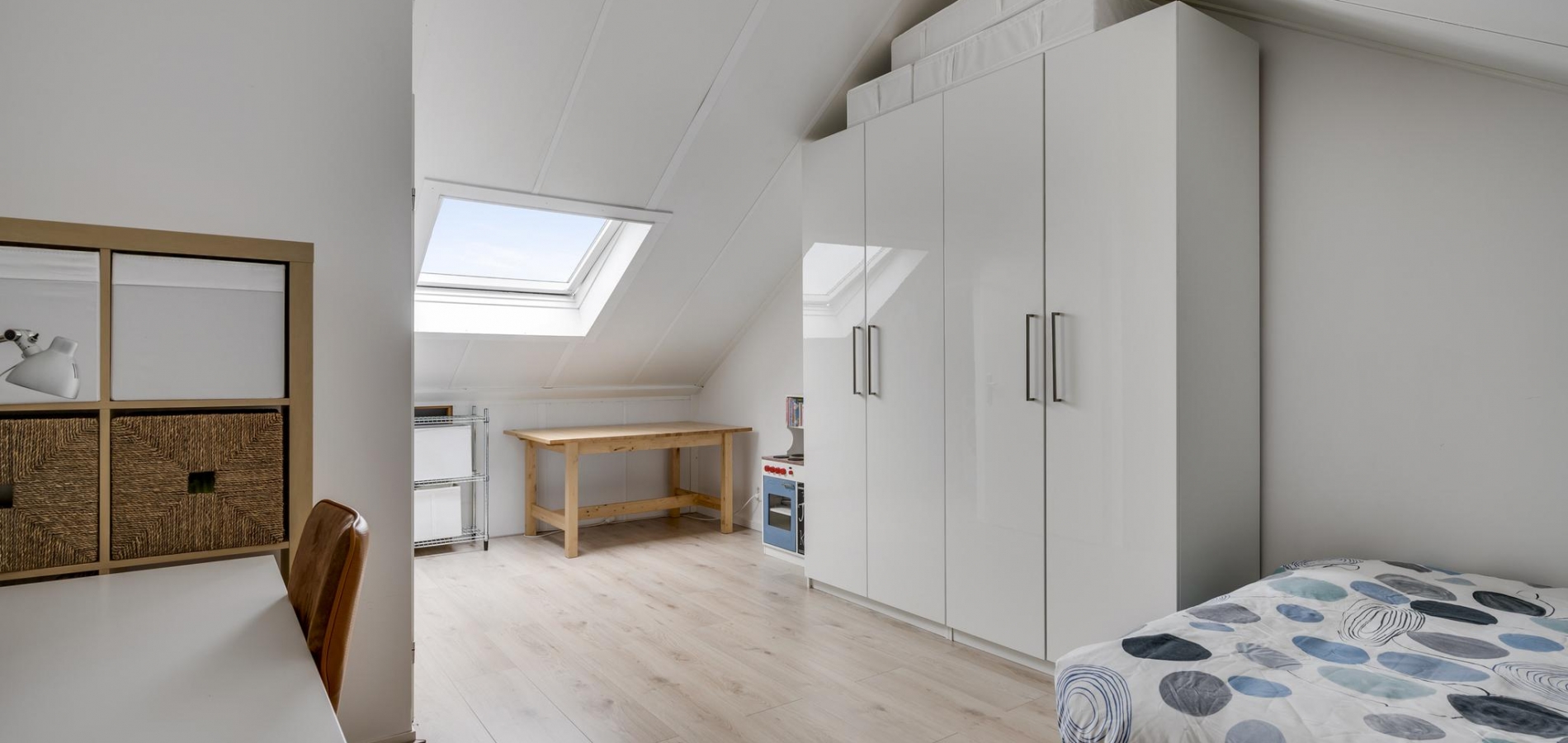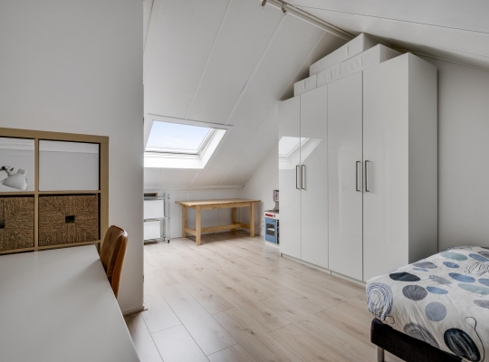 Er is een vaste trap naar de tweede verdieping. Via een portaal is de zeer grote slaap-/werkkamer te bereiken, met een laminaatvloer en een dakraam aan de achterzijde. In de hoek, bij de HR-ketel, staan de wasmachine en droger opgesteld.