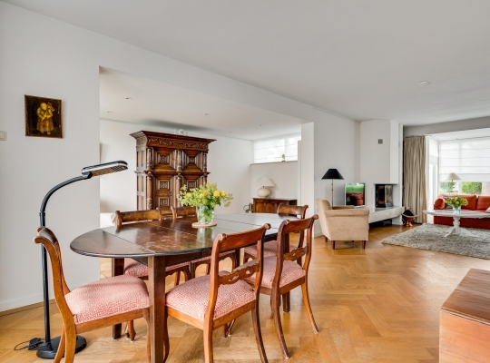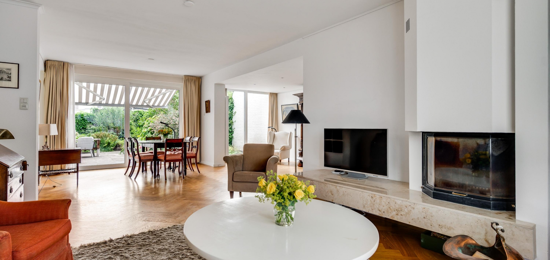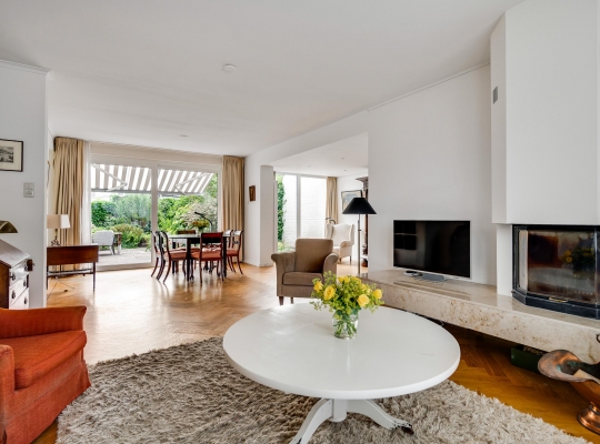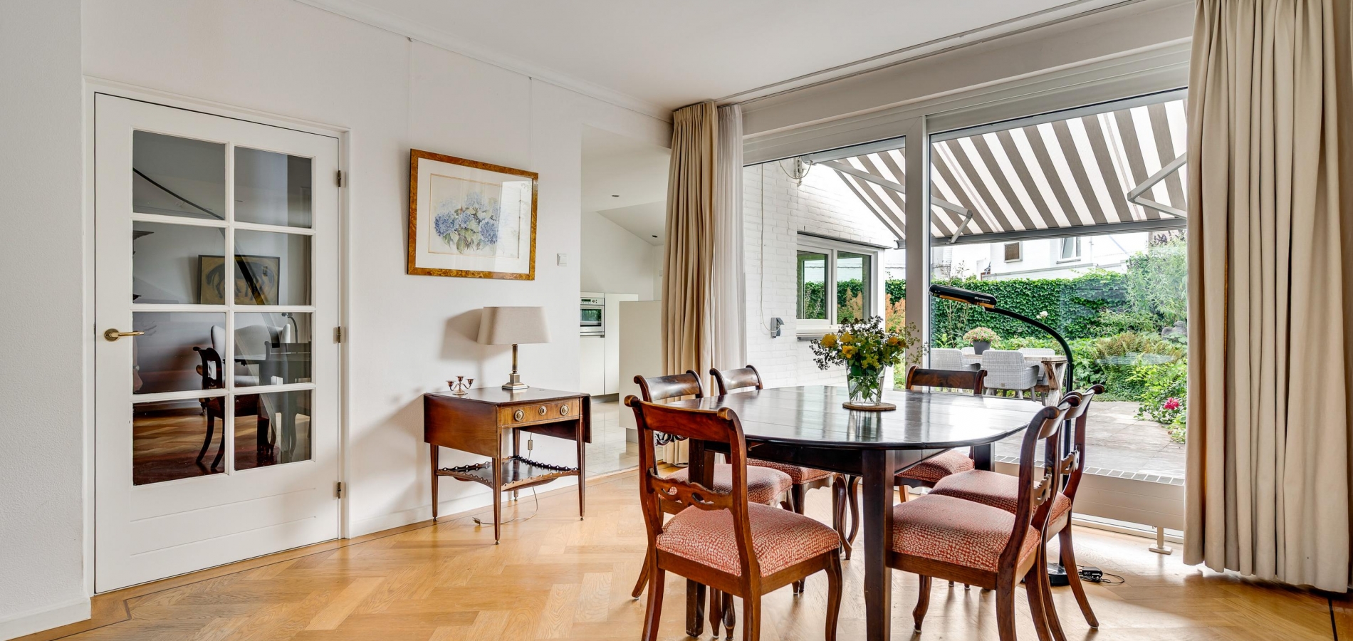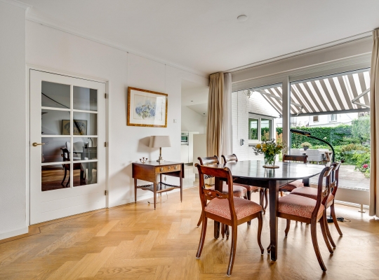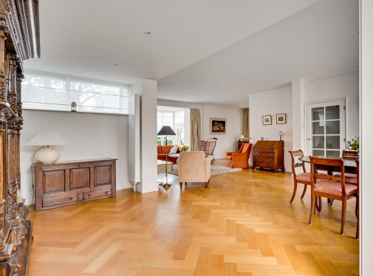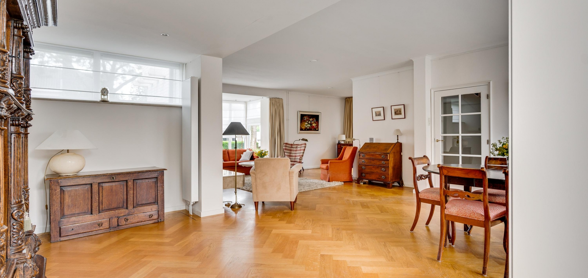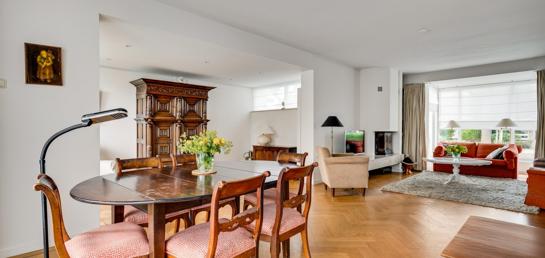 De speels ingedeelde woon-eetkamer met een visgraat parketvloer heeft een totale oppervlakte van bijna 60 m2. Het zitgedeelte is aan de voorzijde, bij de royale erker en de inbouwhaard met marmeren tv-plateau, en het eetgedeelte is bij de schuifpui naar de achtertuin. Het rechterdeel van de woonkamer, met een schuifpui en een raam, is voor verschillende doeleinden te gebruiken.