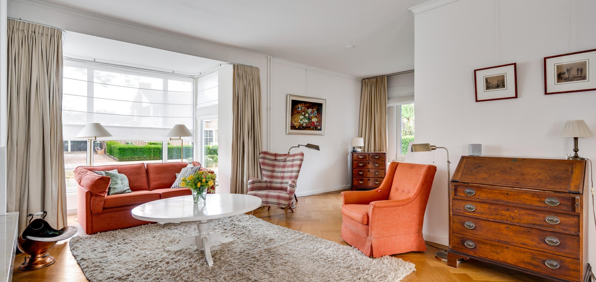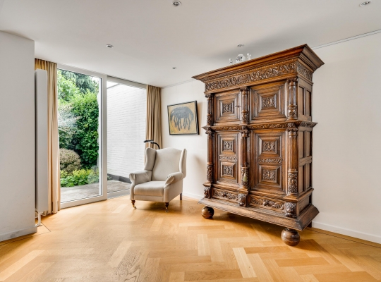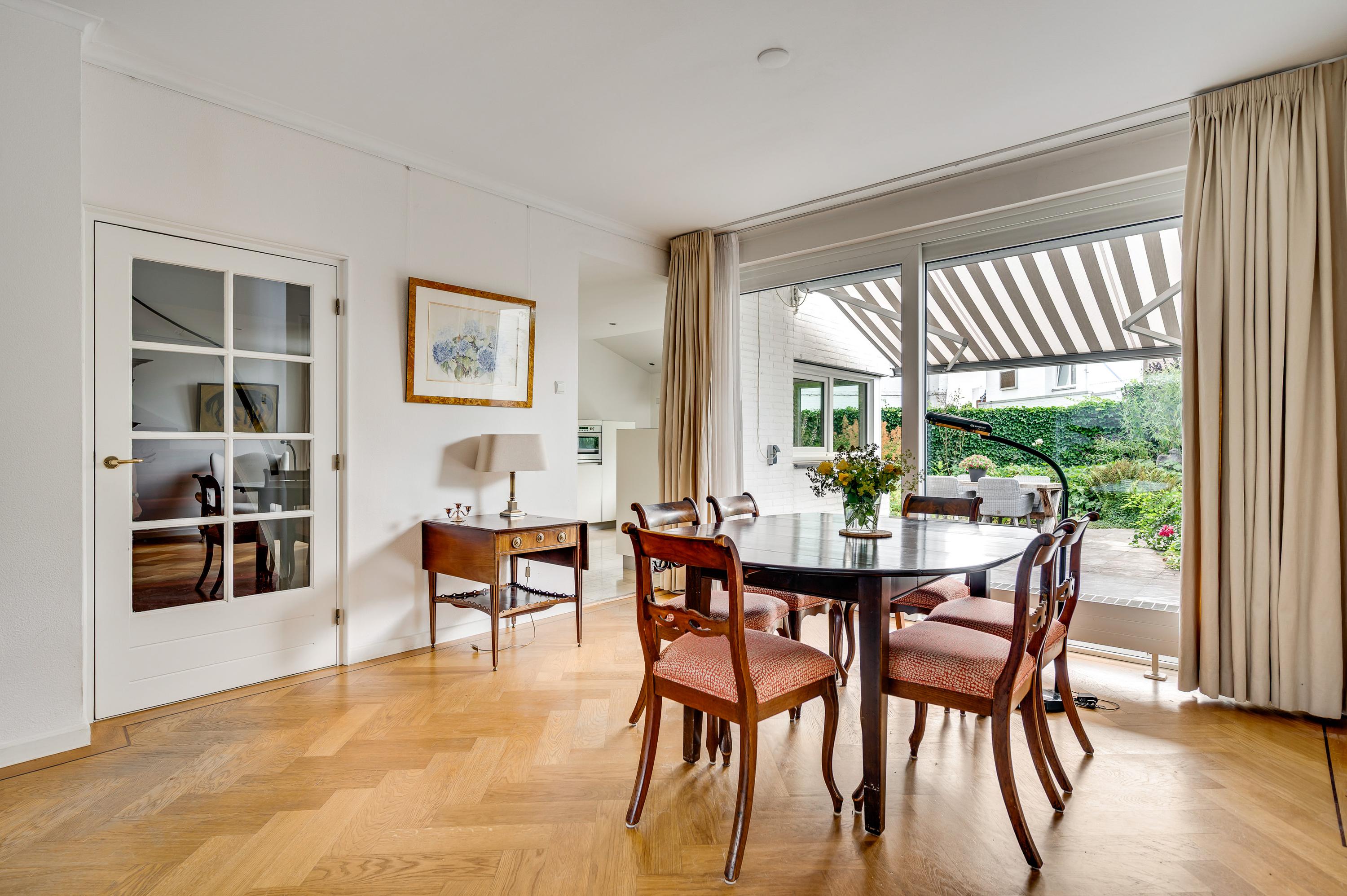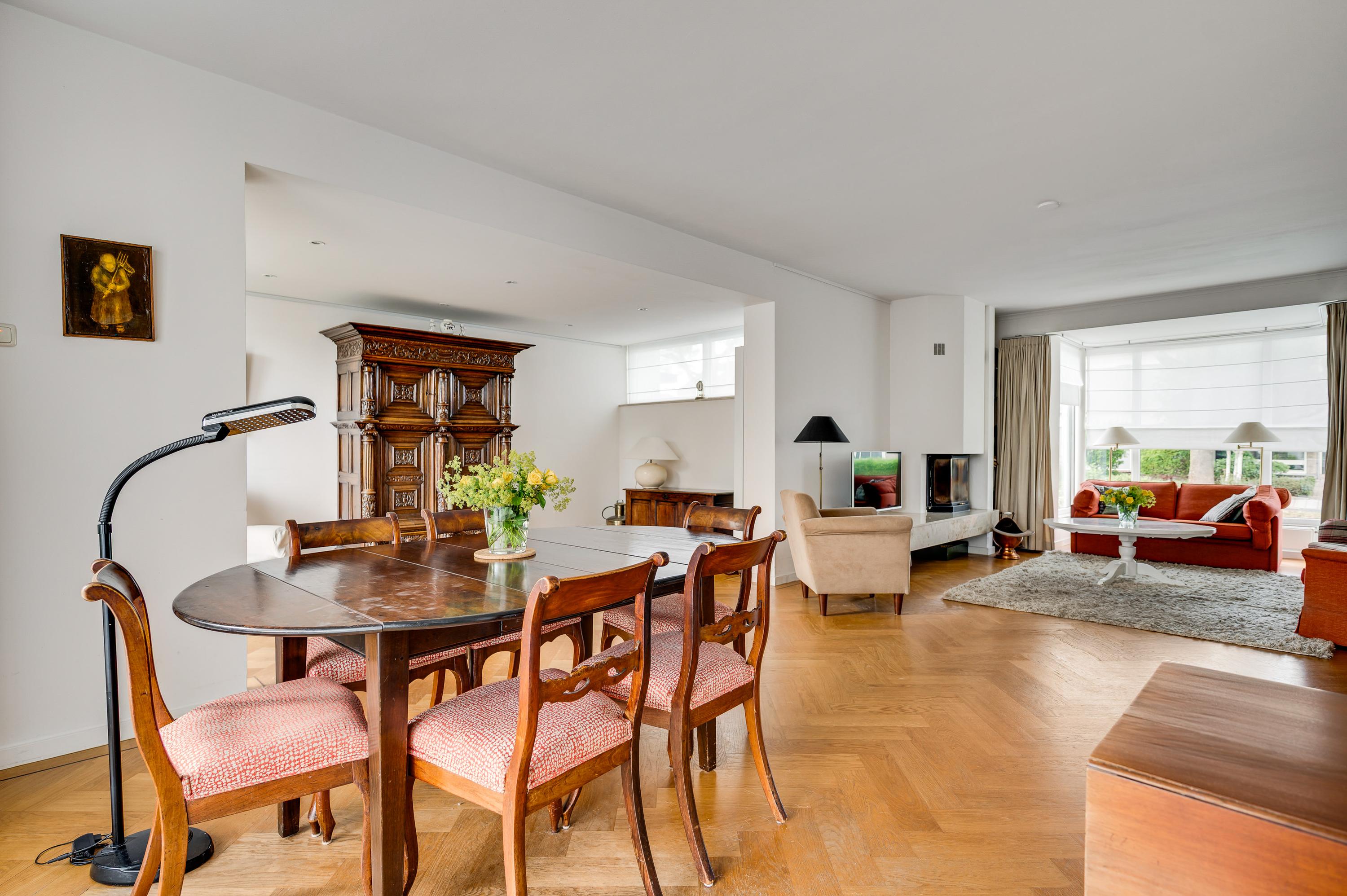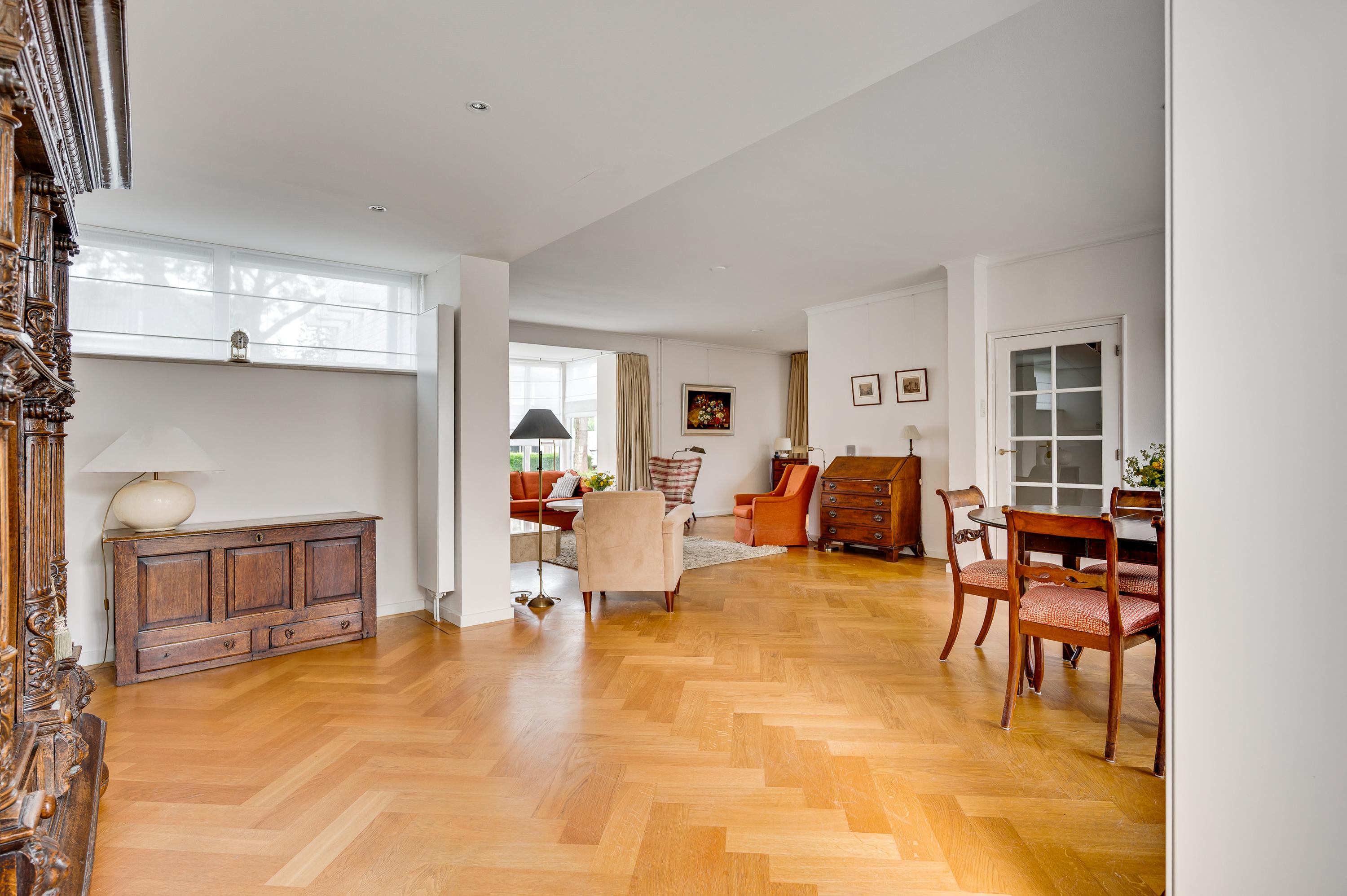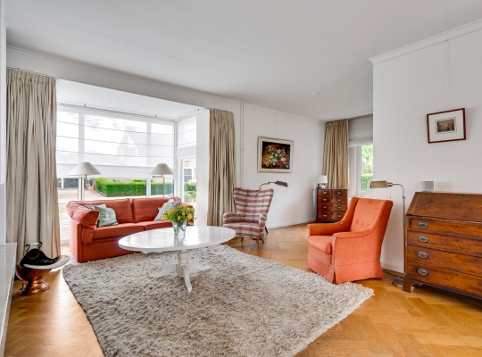 De speels ingedeelde woon-eetkamer met een visgraat parketvloer heeft een totale oppervlakte van bijna 60 m2. Het zitgedeelte is aan de voorzijde, bij de royale erker en de inbouwhaard met marmeren tv-plateau, en het eetgedeelte is bij de schuifpui naar de achtertuin. Het rechterdeel van de woonkamer, met een schuifpui en een raam, is voor verschillende doeleinden te gebruiken.