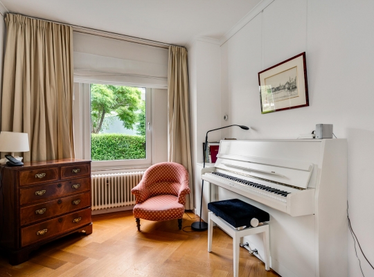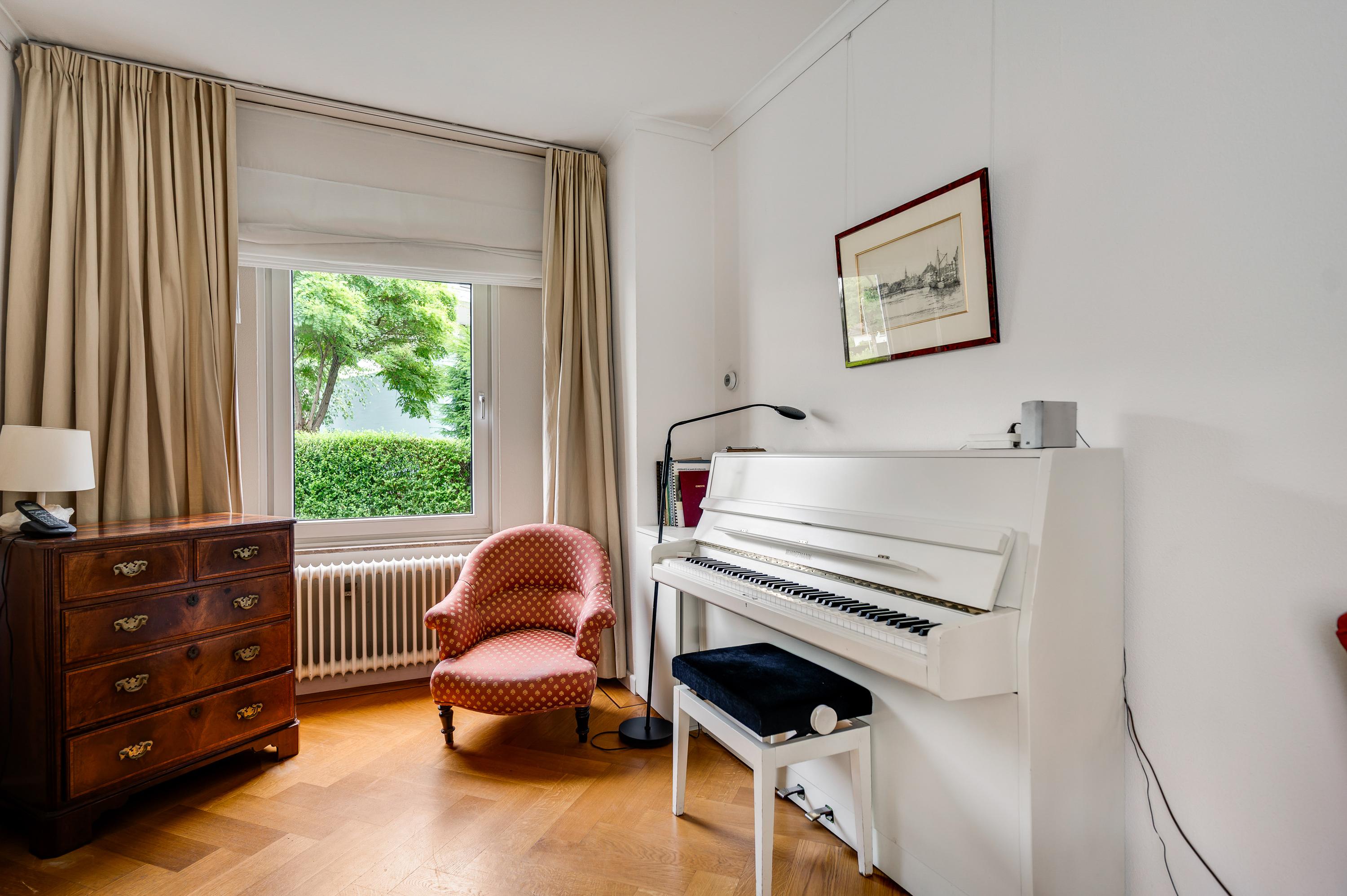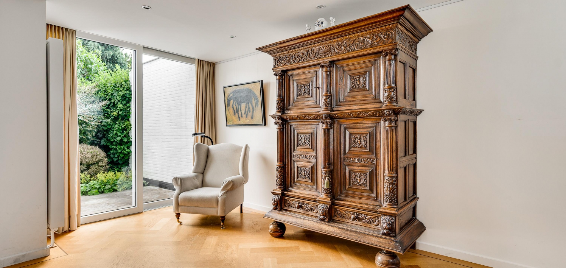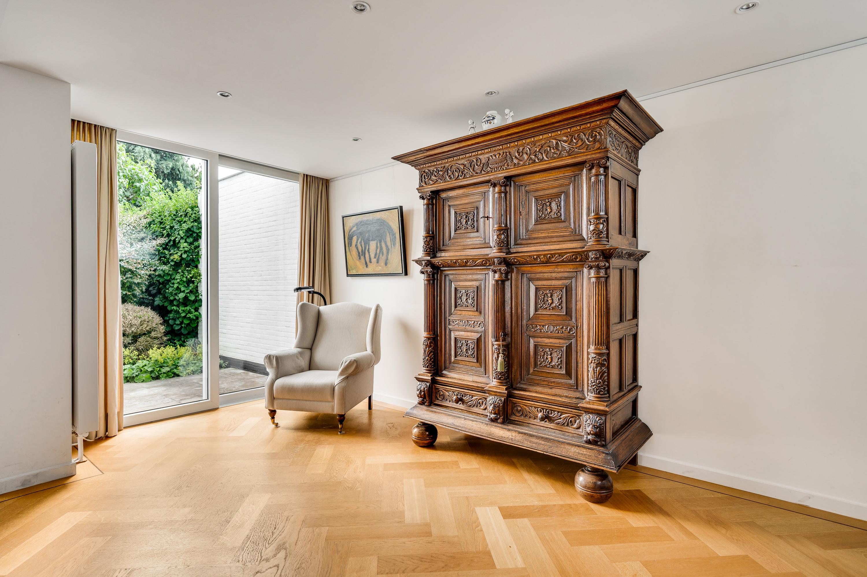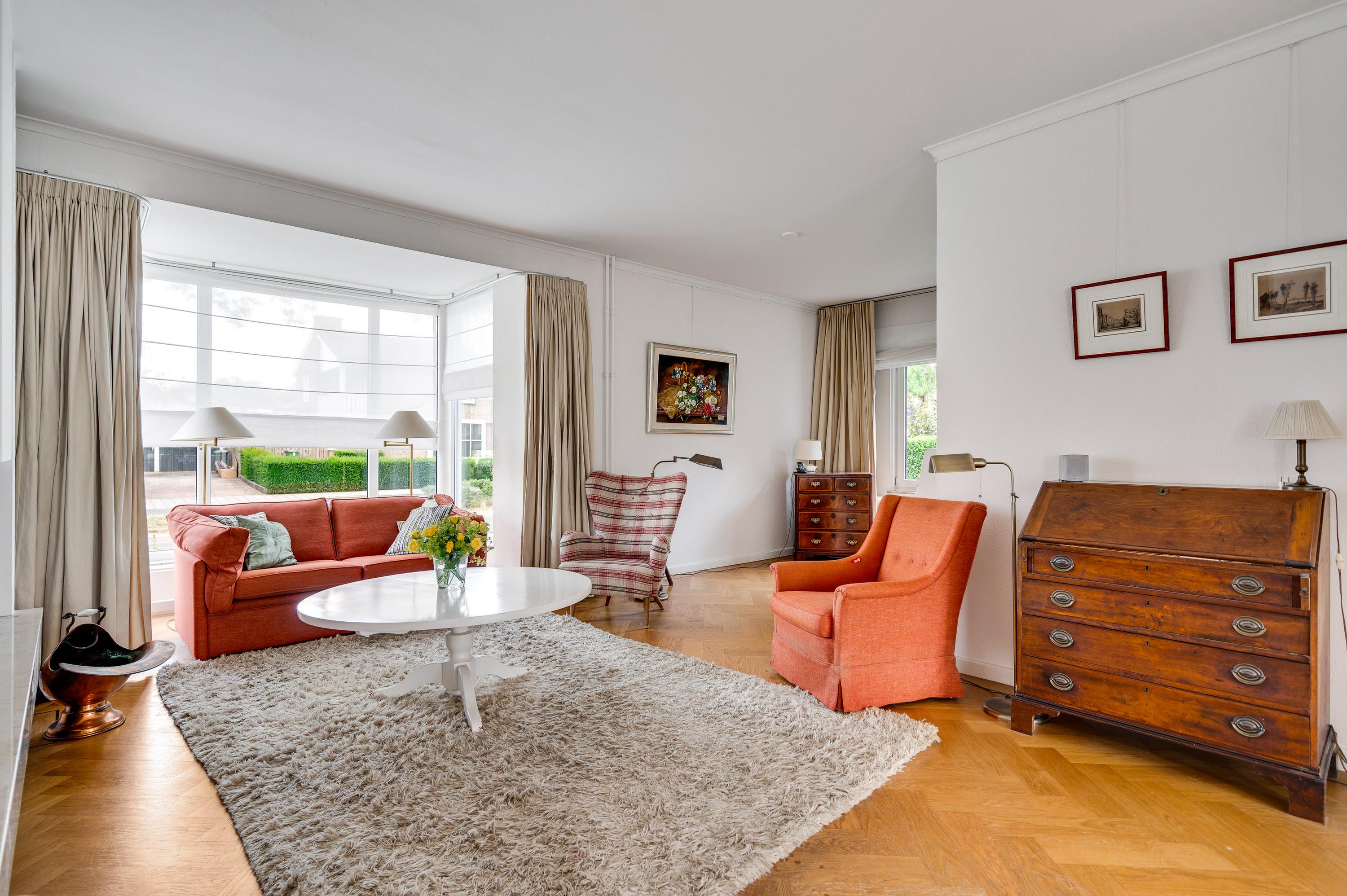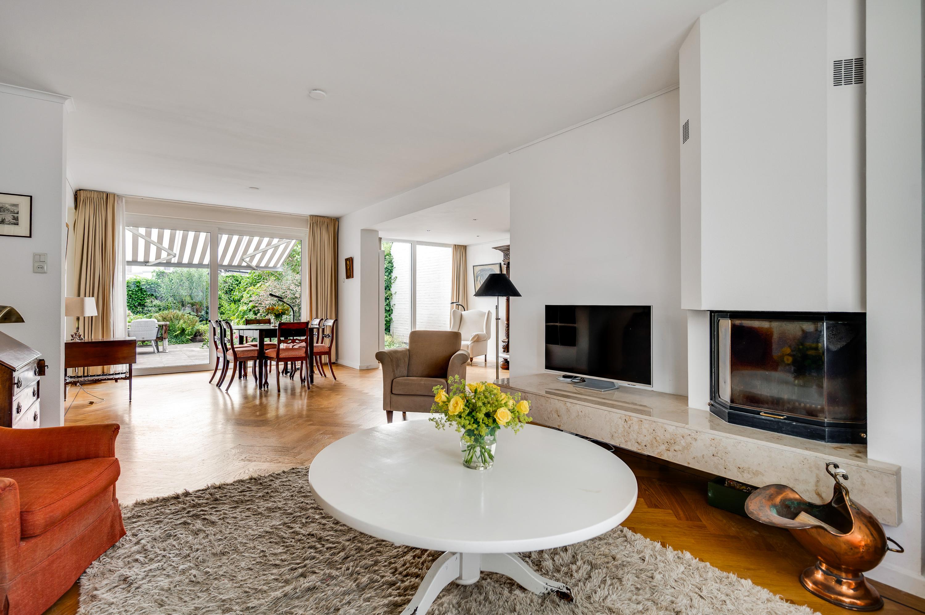 De speels ingedeelde woon-eetkamer met een visgraat parketvloer heeft een totale oppervlakte van bijna 60 m2. Het zitgedeelte is aan de voorzijde, bij de royale erker en de inbouwhaard met marmeren tv-plateau, en het eetgedeelte is bij de schuifpui naar de achtertuin. Het rechterdeel van de woonkamer, met een schuifpui en een raam, is voor verschillende doeleinden te gebruiken.