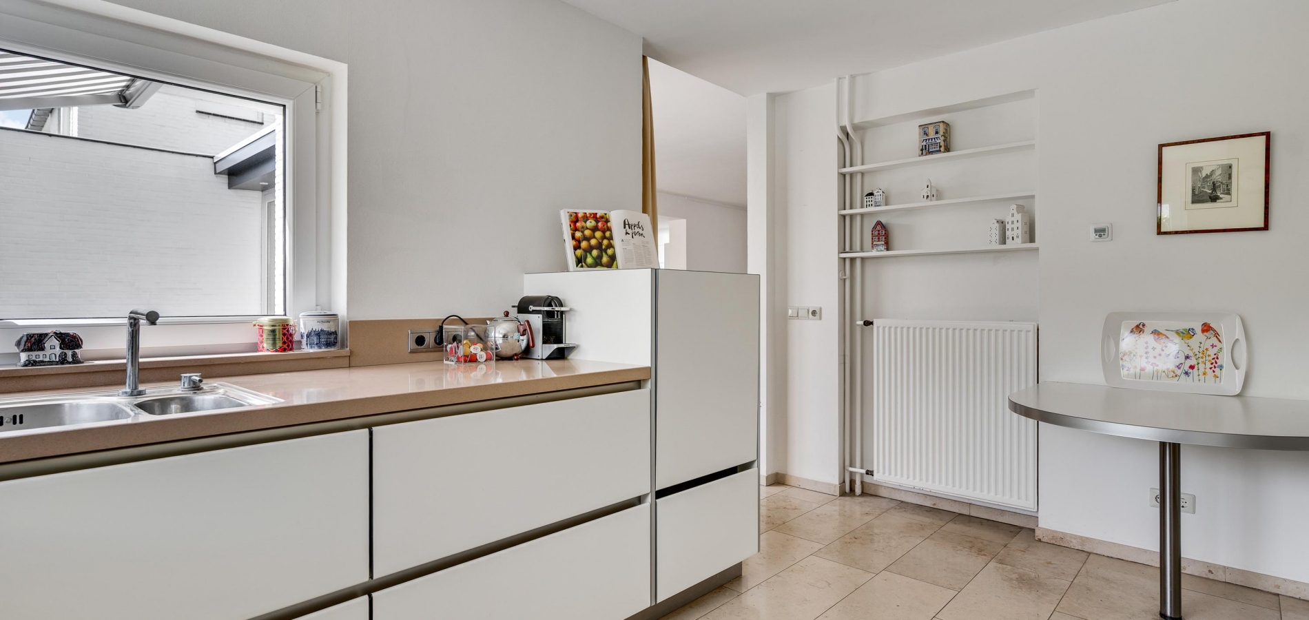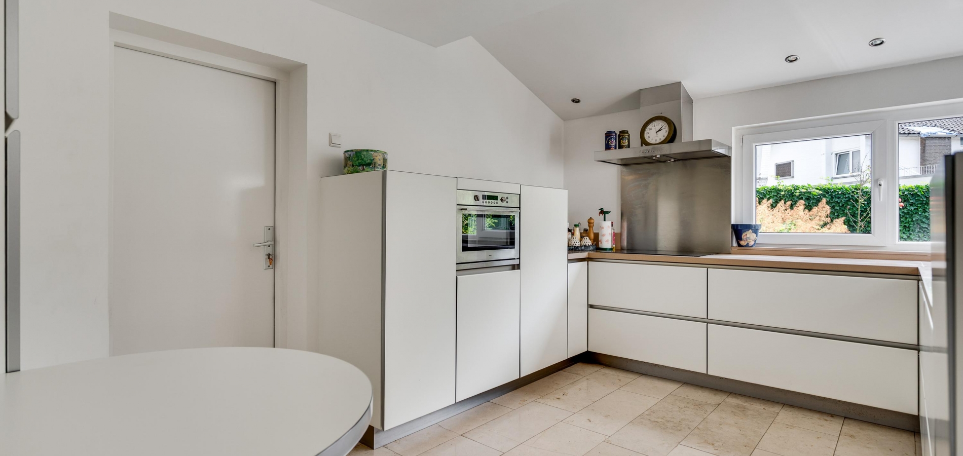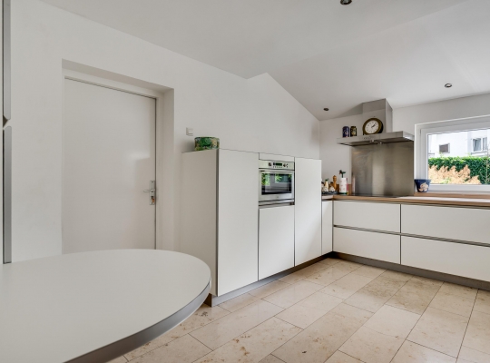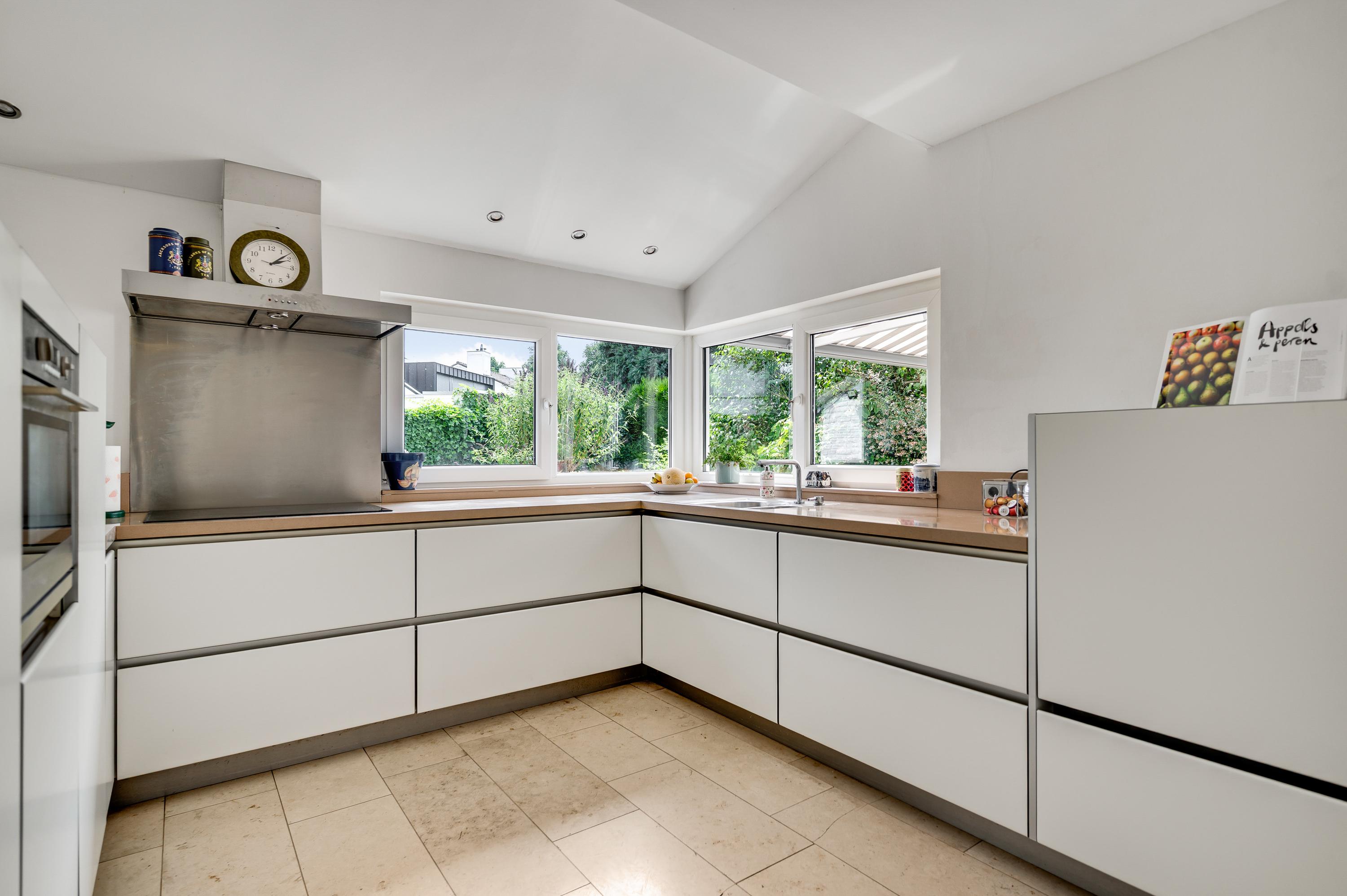 Bij het eetgedeelte is een doorgang naar de keuken (circa 4,35 x 3,76), met prachtig uitzicht naar de tuin. De halfronde eettafel maakt deel uit van de U-vormige, stijlvolle keukenopstelling met een blad van natuursteen. Alle benodigde apparatuur is ingebouwd: een inductie kookplaat, afzuigkap, combi-oven, vaatwasser en een koelkast. Fraai element is het schuine dak in het achterste deel van de keuken.