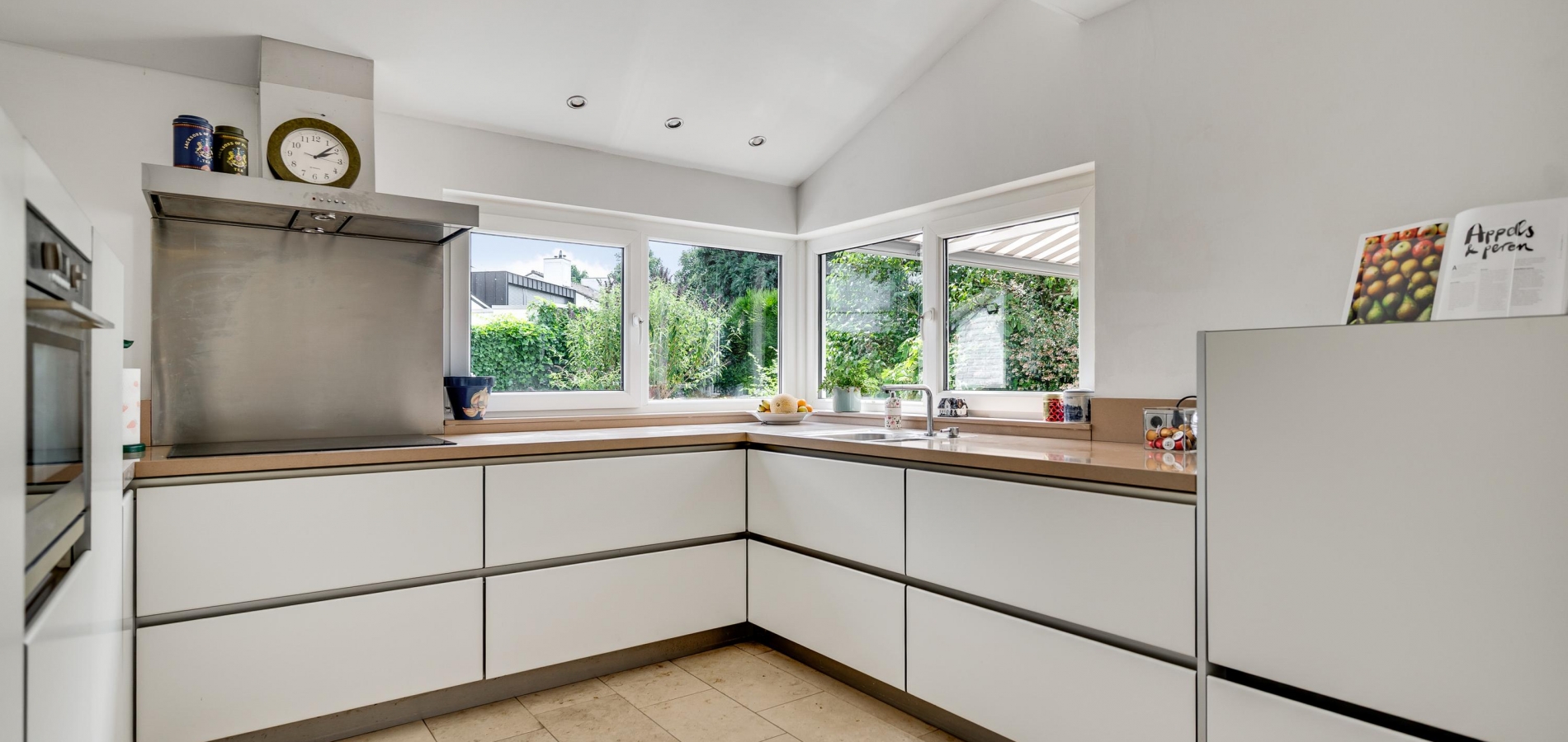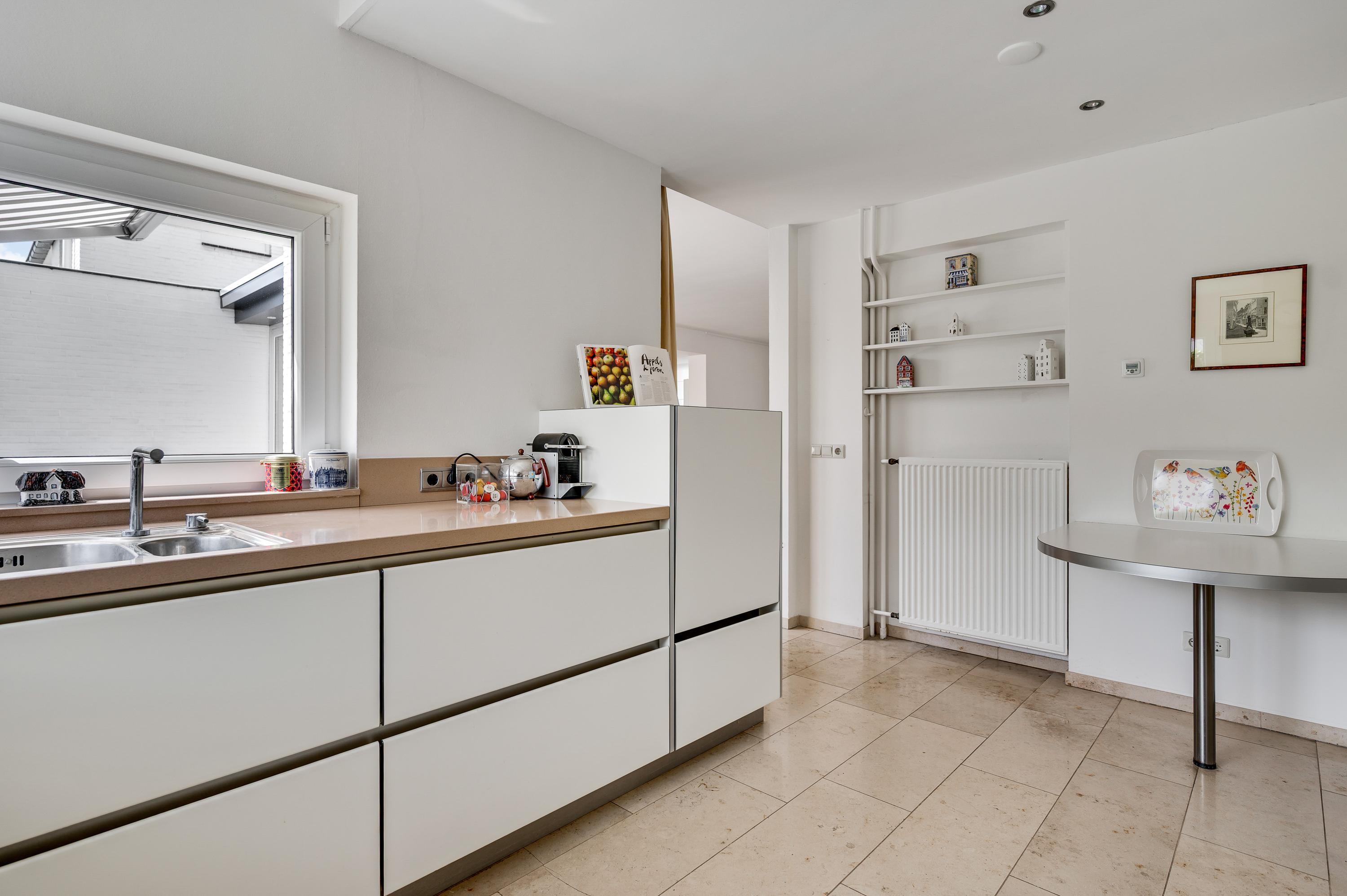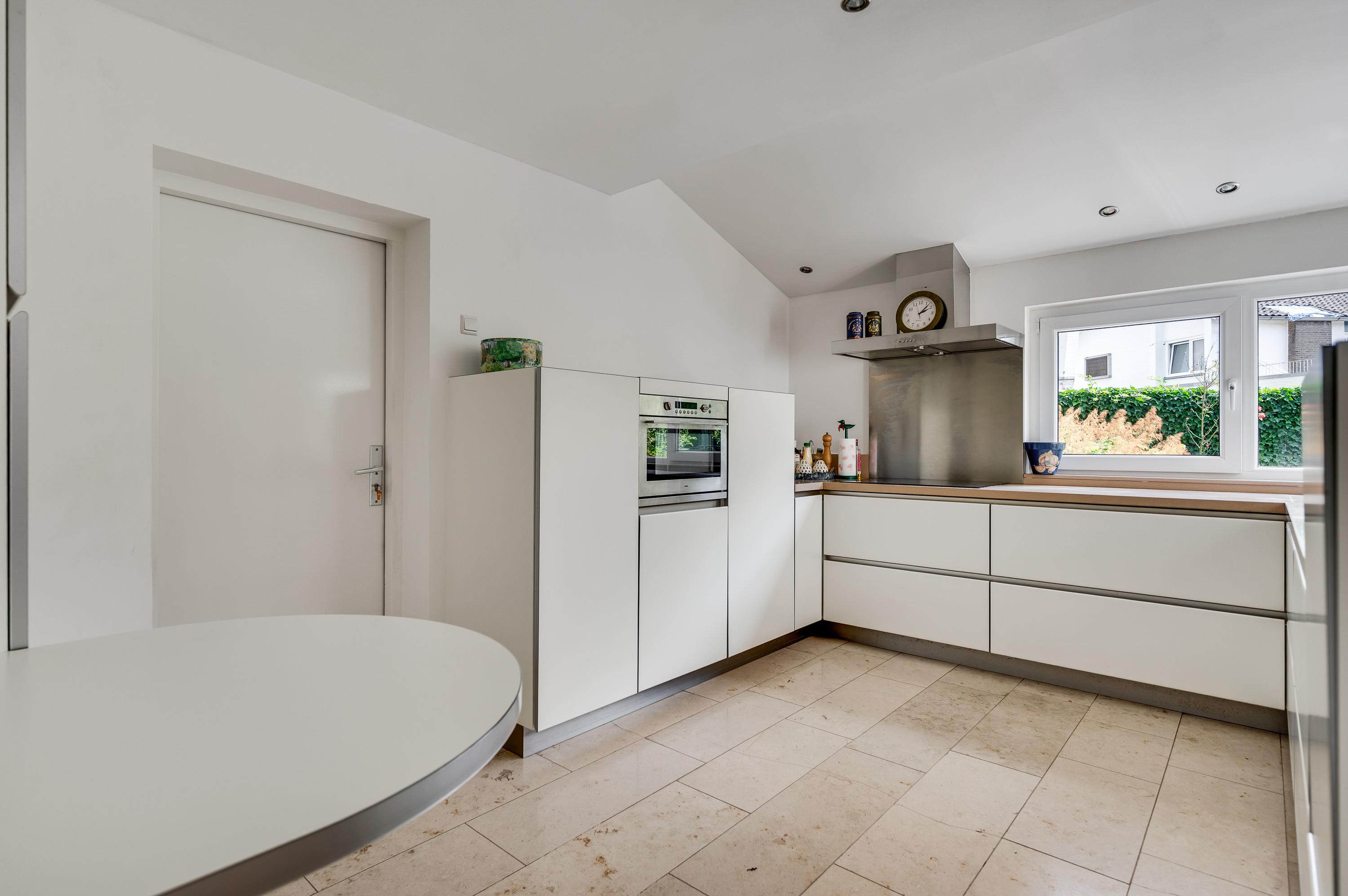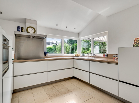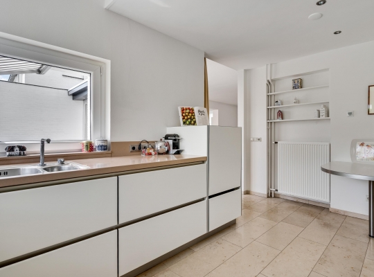 Bij het eetgedeelte is een doorgang naar de keuken (circa 4,35 x 3,76), met prachtig uitzicht naar de tuin. De halfronde eettafel maakt deel uit van de U-vormige, stijlvolle keukenopstelling met een blad van natuursteen. Alle benodigde apparatuur is ingebouwd: een inductie kookplaat, afzuigkap, combi-oven, vaatwasser en een koelkast. Fraai element is het schuine dak in het achterste deel van de keuken.