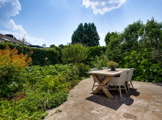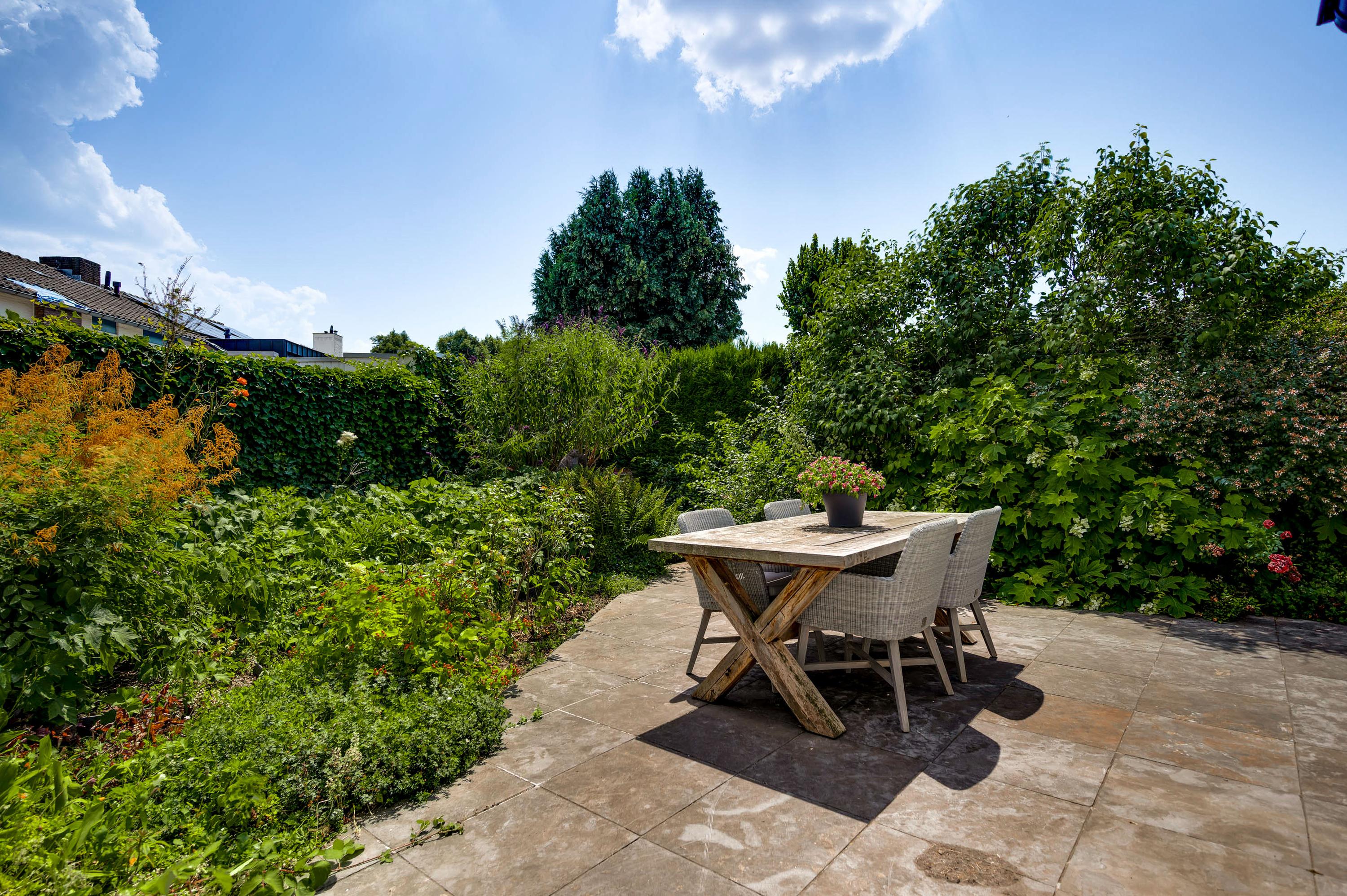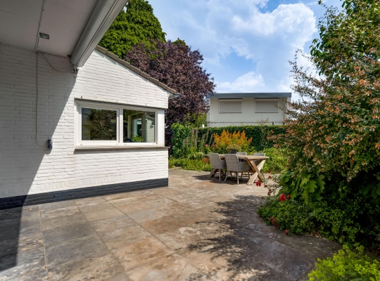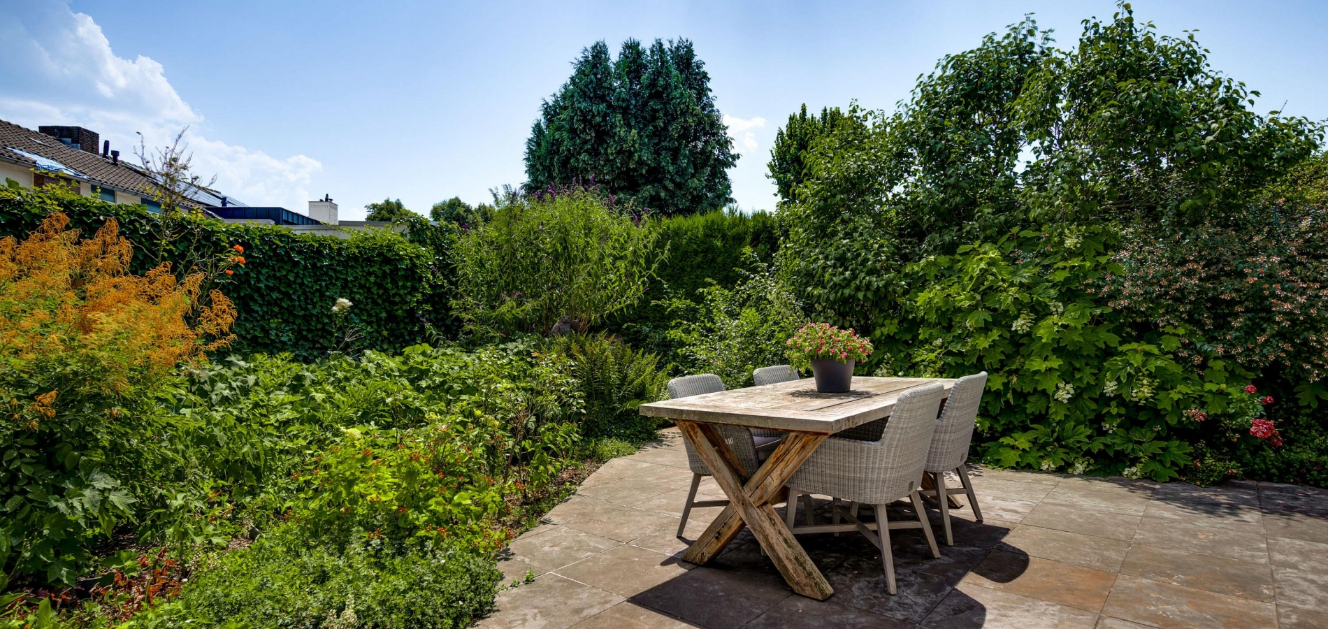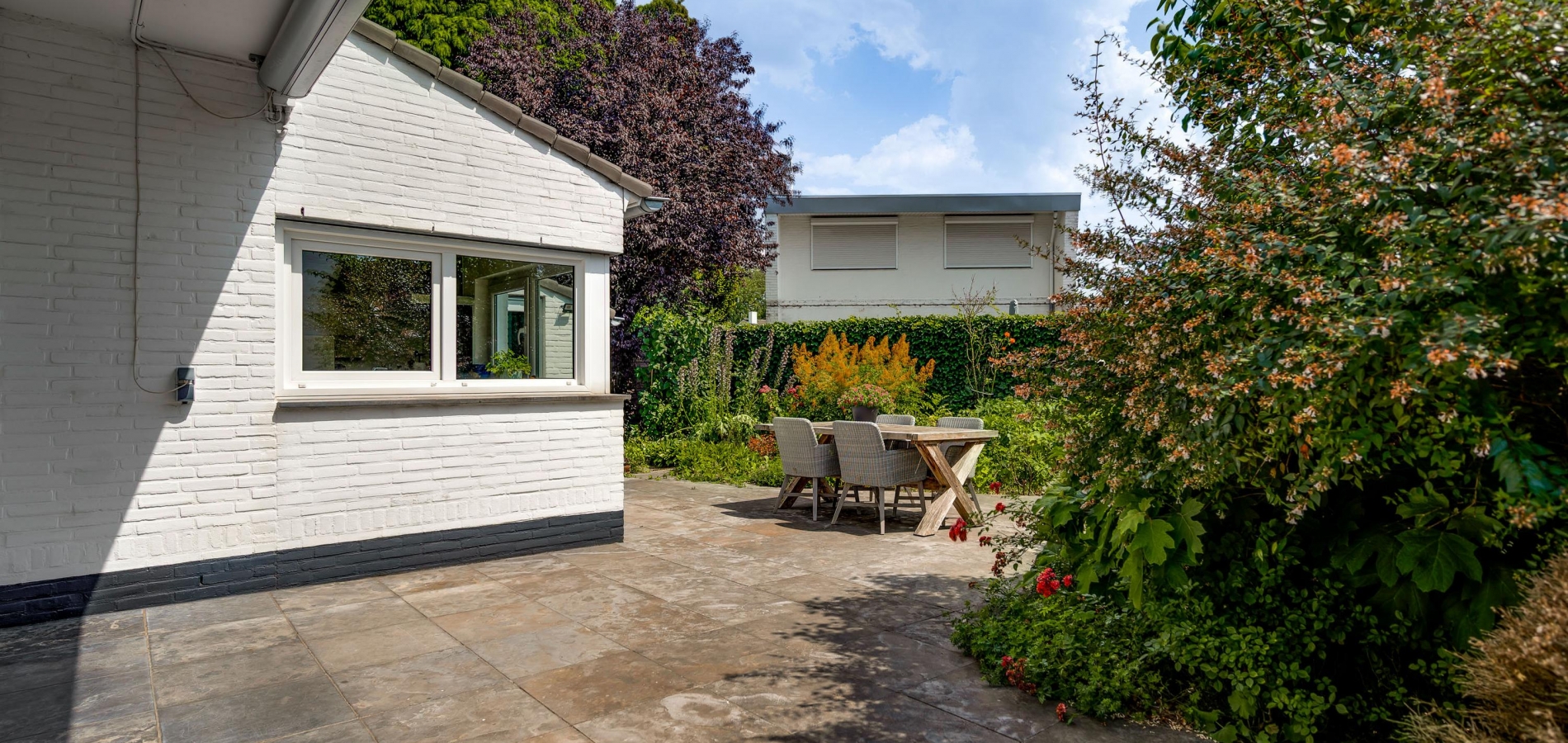 De garage biedt, net als de woon-/eetkamer, toegang tot de achtertuin op het zuidoosten. Het terras van natuursteen is van groot formaat en er hangt een breed zonnescherm, die zorgt voor schaduw op een deel van het terras en in de woonkamer. Verder is er veel groen in de tuin, zowel aan de achterzijde als in de zij- en voortuin. De oprit zorgt, samen met de carport, voor ruime parkeergelegenheid op eigen terrein.