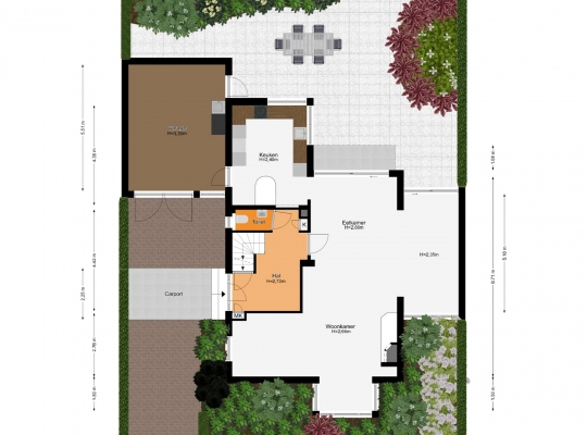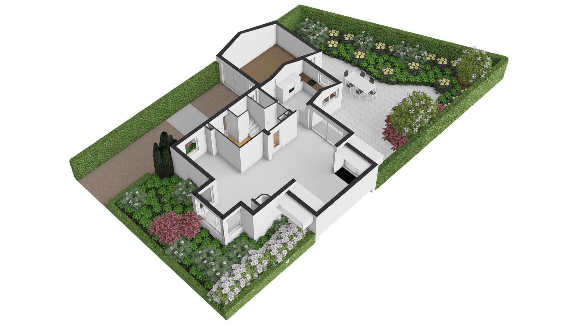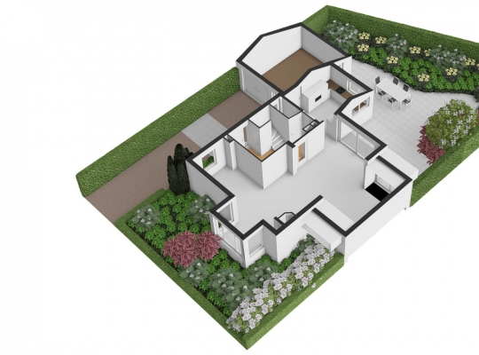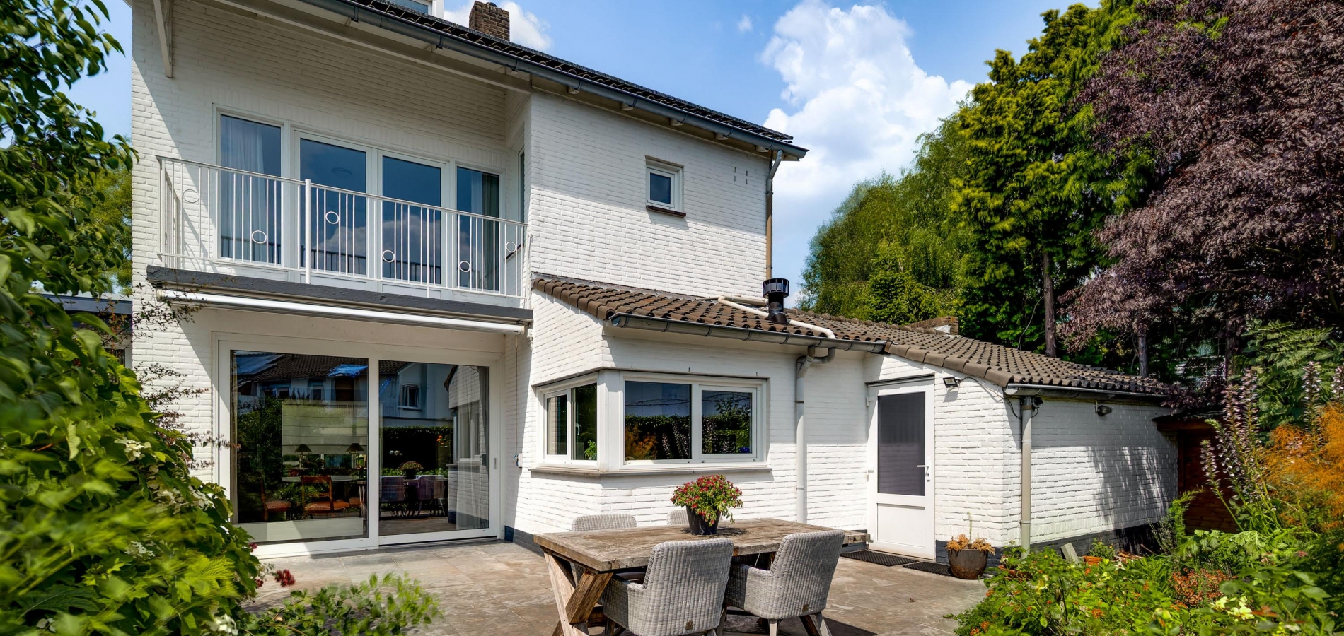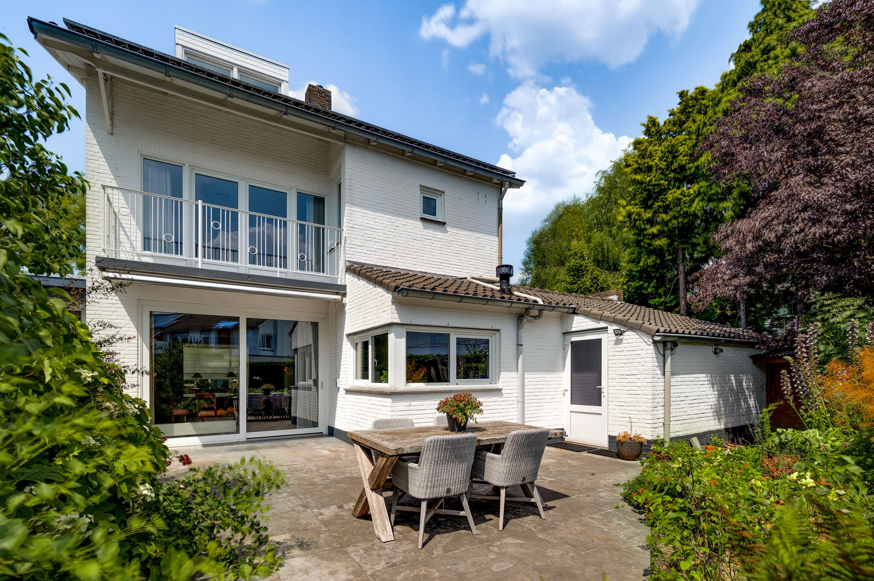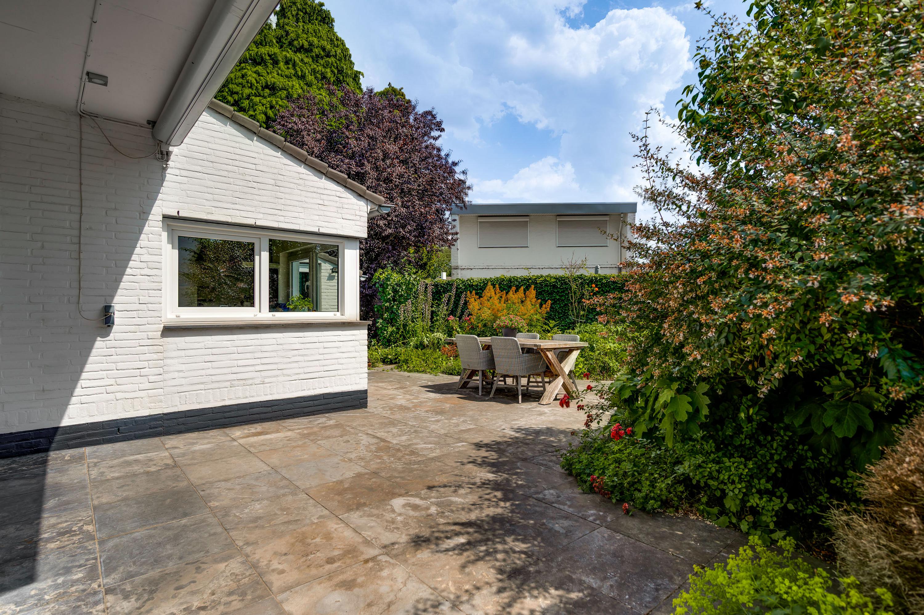De garage biedt, net als de woon-/eetkamer, toegang tot de achtertuin op het zuidoosten. Het terras van natuursteen is van groot formaat en er hangt een breed zonnescherm, die zorgt voor schaduw op een deel van het terras en in de woonkamer. Verder is er veel groen in de tuin, zowel aan de achterzijde als in de zij- en voortuin. De oprit zorgt, samen met de carport, voor ruime parkeergelegenheid op eigen terrein.