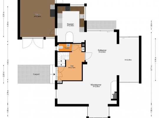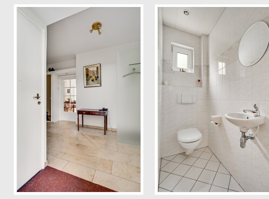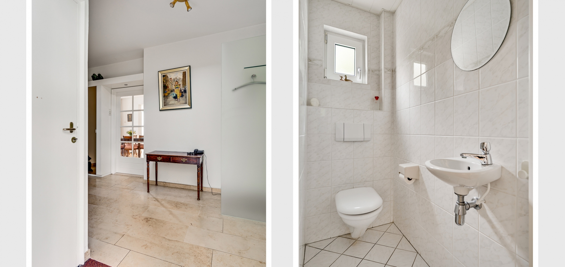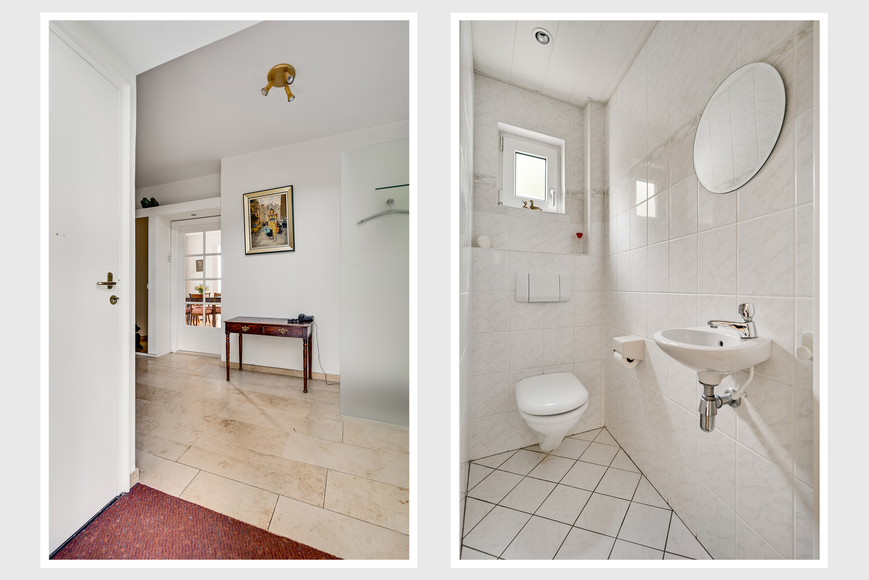 Aan de linkerzijde, bij de carport, is het bordes met de voordeur van deze fraaie woning. In de hal valt uw oog op de travertinvloer en de fraaie trap naar de eerste verdieping. Onder deze trap is de trap naar het souterrain. Ook de toiletruimte, met een wandcloset en fonteintje, is vanuit de hal te bereiken.