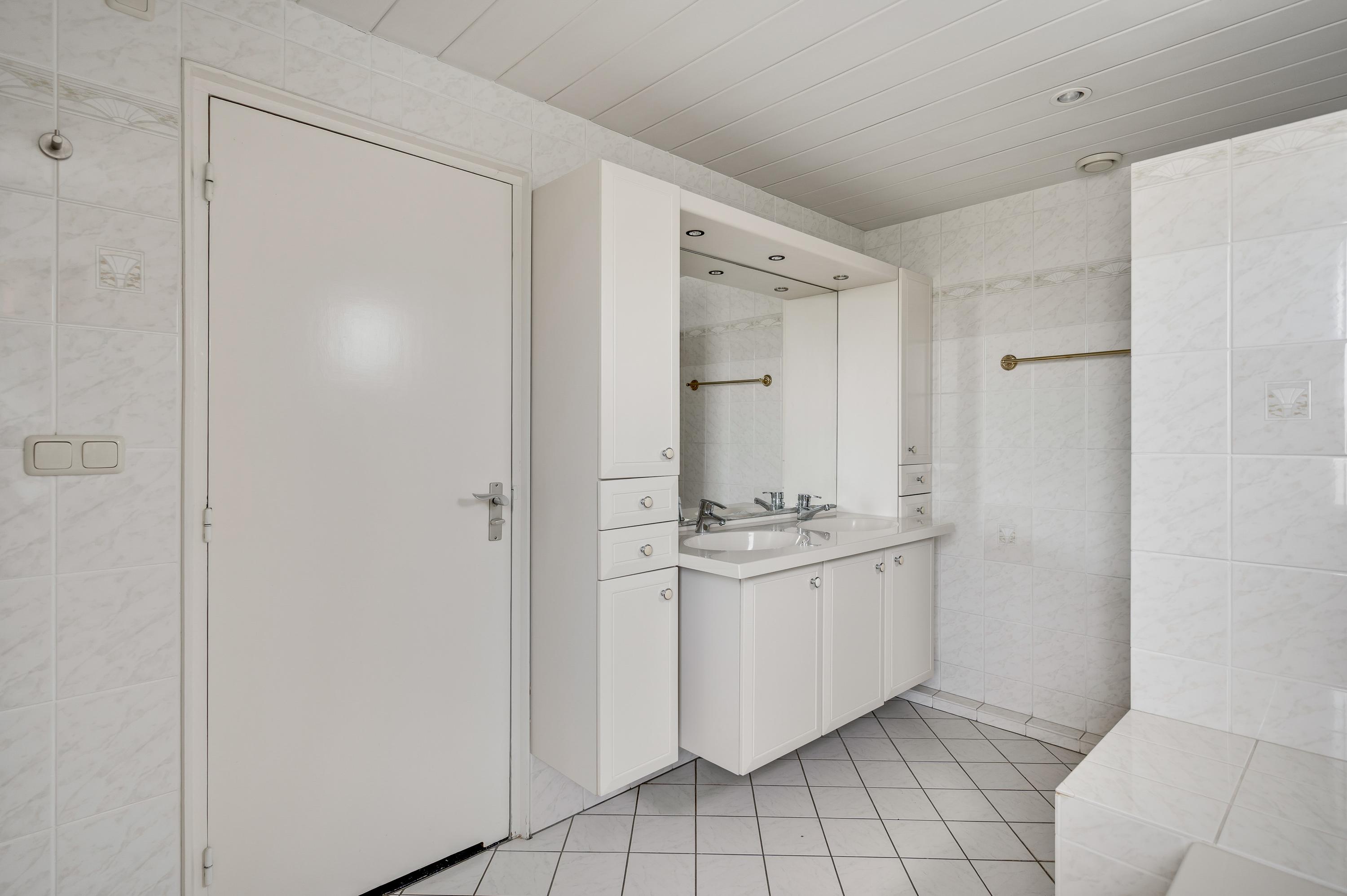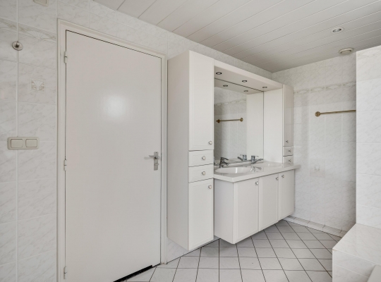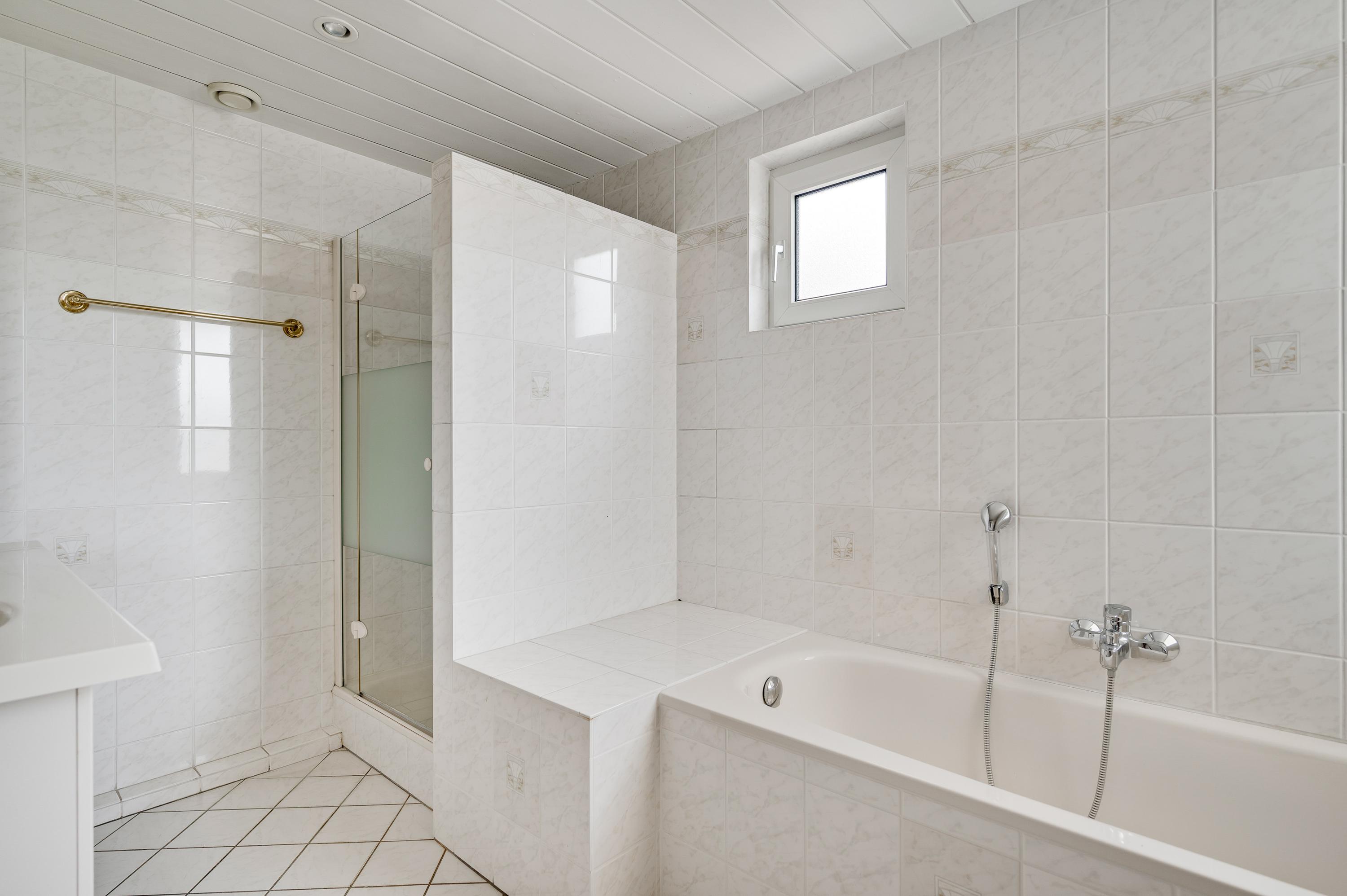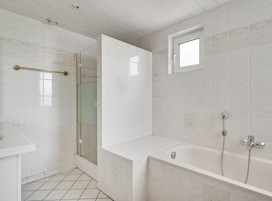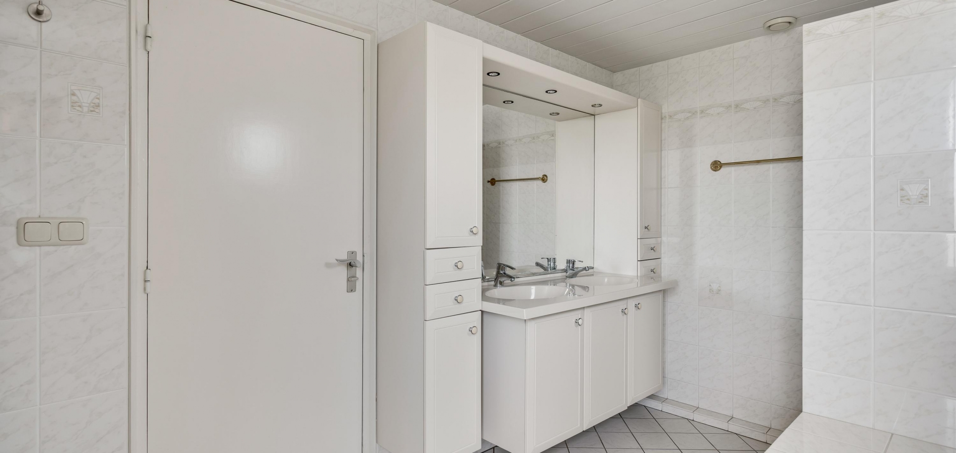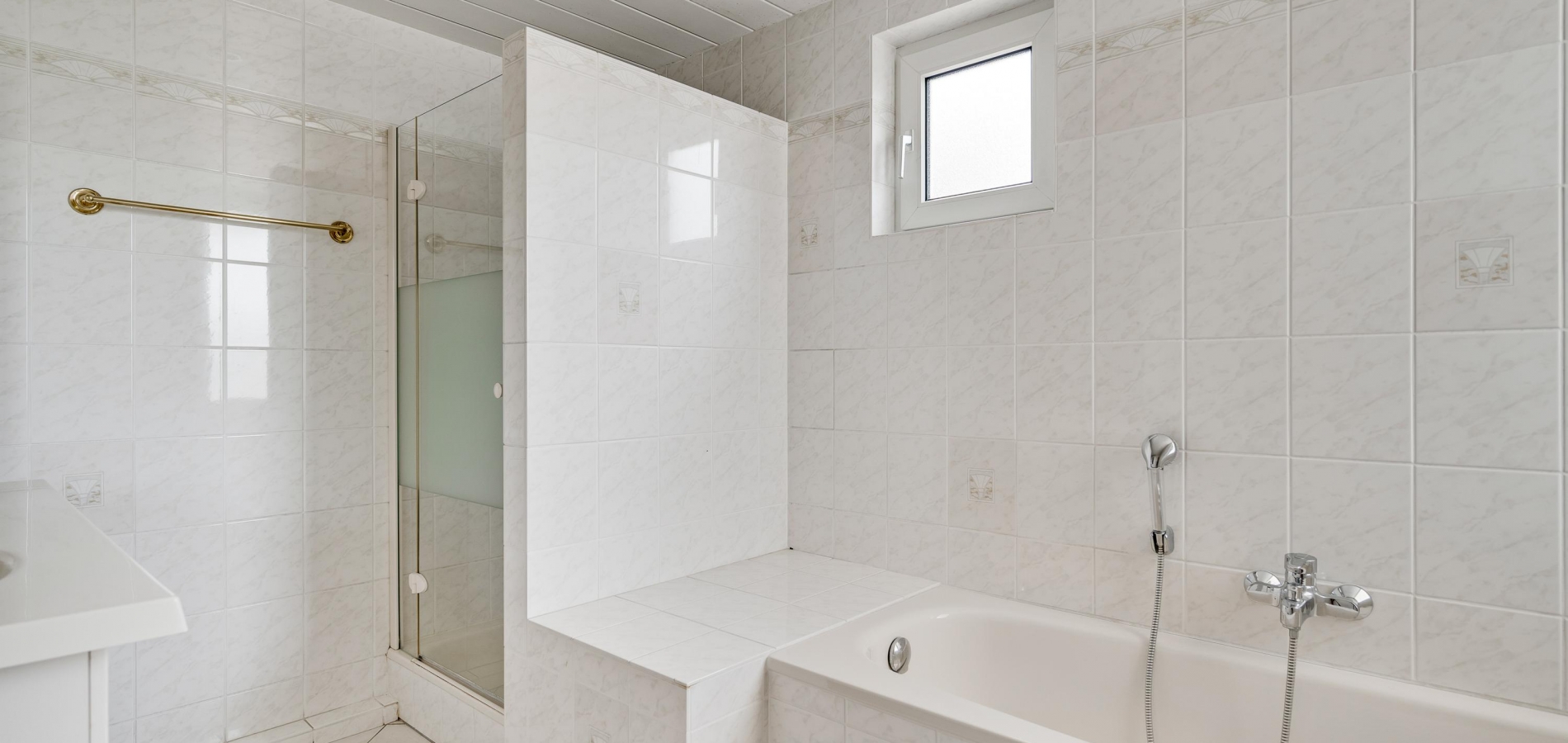 Op de overloop, naast de toiletruimte, is de ruime badkamer (circa 3,23 x 2,32) met een ligbad, aparte douche, een grote designradiator en een groot wastafelmeubel. De badkamer is, net als de toiletruimte, uitgevoerd in lichte kleuren.