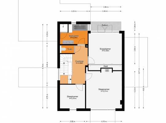 Aan de achterzijde is slaapkamer I (circa 3,80 x 3,58) met een grote schuifdeurkast en openslaande deuren naar het balkon. Slaapkamer II (circa 4,33 x 3,91) met wastafel is aan de voorzijde, net als slaapkamer III (circa 2,92 x 2,76).