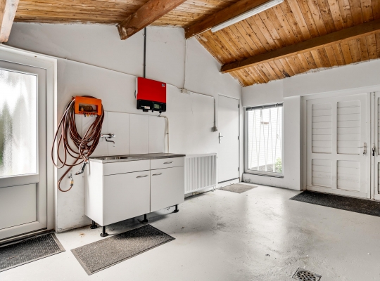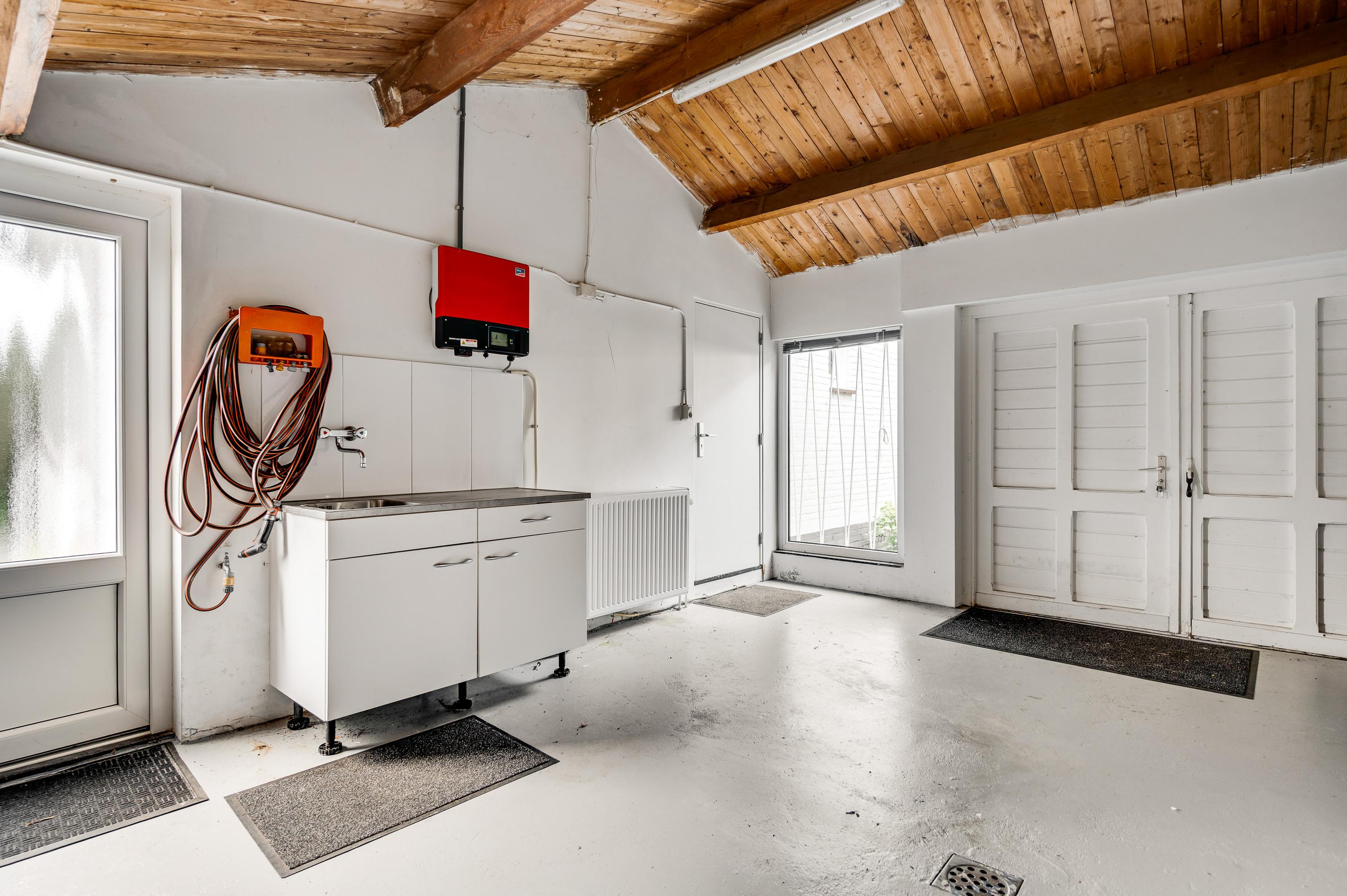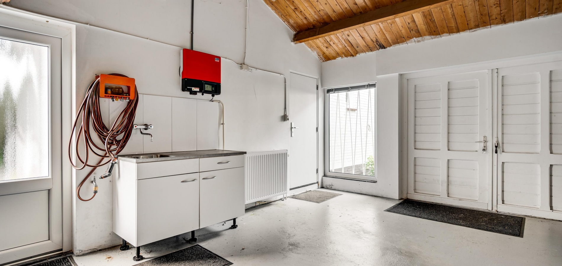 Vanuit de keuken is de garage (circa 5,51 x 4,23) te bereiken. Deze fraaie ruimte is voorzien van elektra, water, afvoer en verwarming. Dubbele, houten deuren geven toegang tot de carport en er is een deur naar de achtertuin. Gezien de hoogte is het mogelijk om in de garage een bergvliering te realiseren.