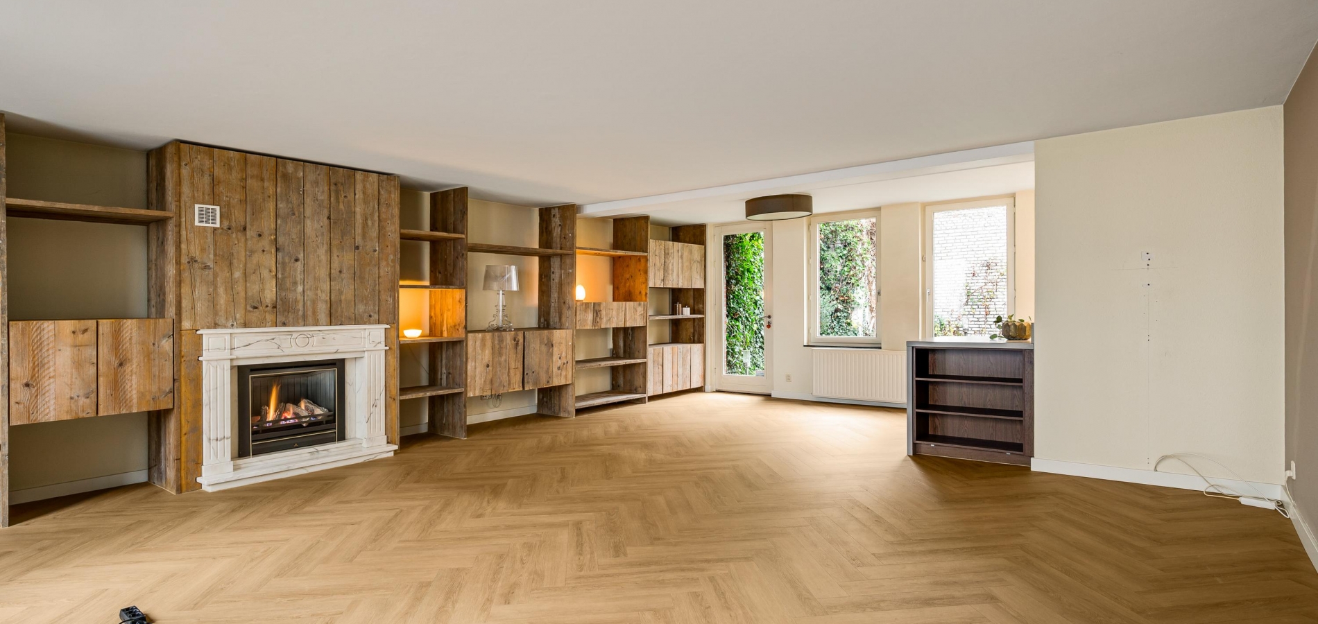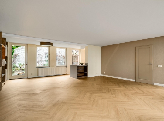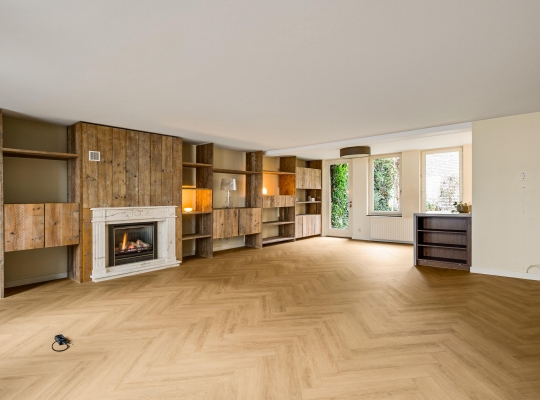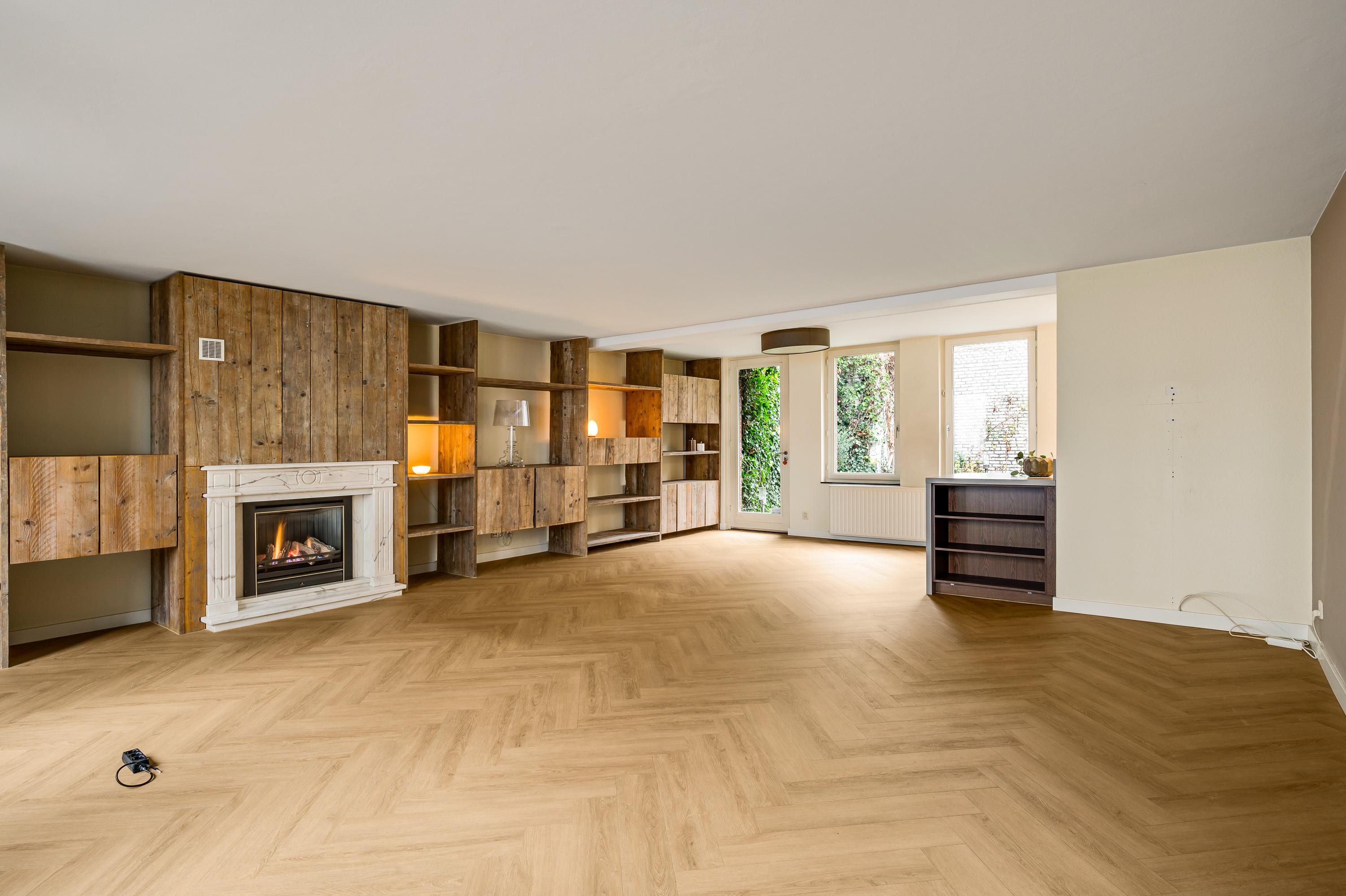 De visgraat pvc-vloer ligt niet alleen in de hal, maar ook in de woonkamer en keuken. Met een totale oppervlakte van circa 55 m2 heeft u de beschikking over een aangename leefruimte, waar u kunt koken en waar het uitnodigen van familie of vrienden geen issue is. Door de grote ramen aan twee zijden, waaronder de zuidkant, valt veel licht naar binnen en de maatwerk raamluiken zorgen voor gewenste beschutting. Over de hele lengte van de woonkamer is een wandmeubel gemaakt, waar een gashaard met schouw het middelpunt is.