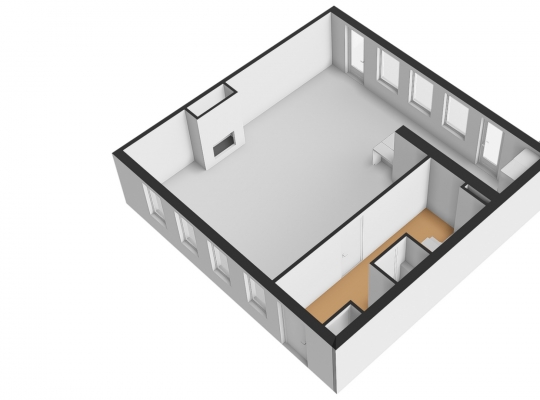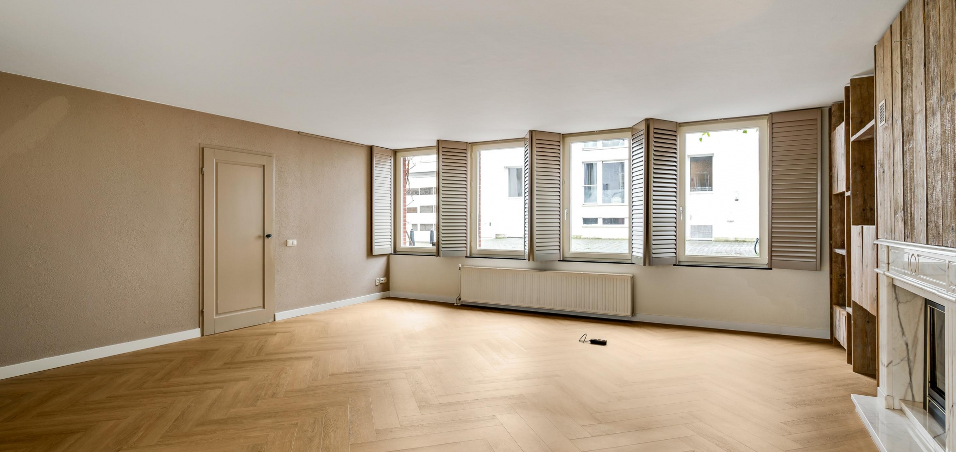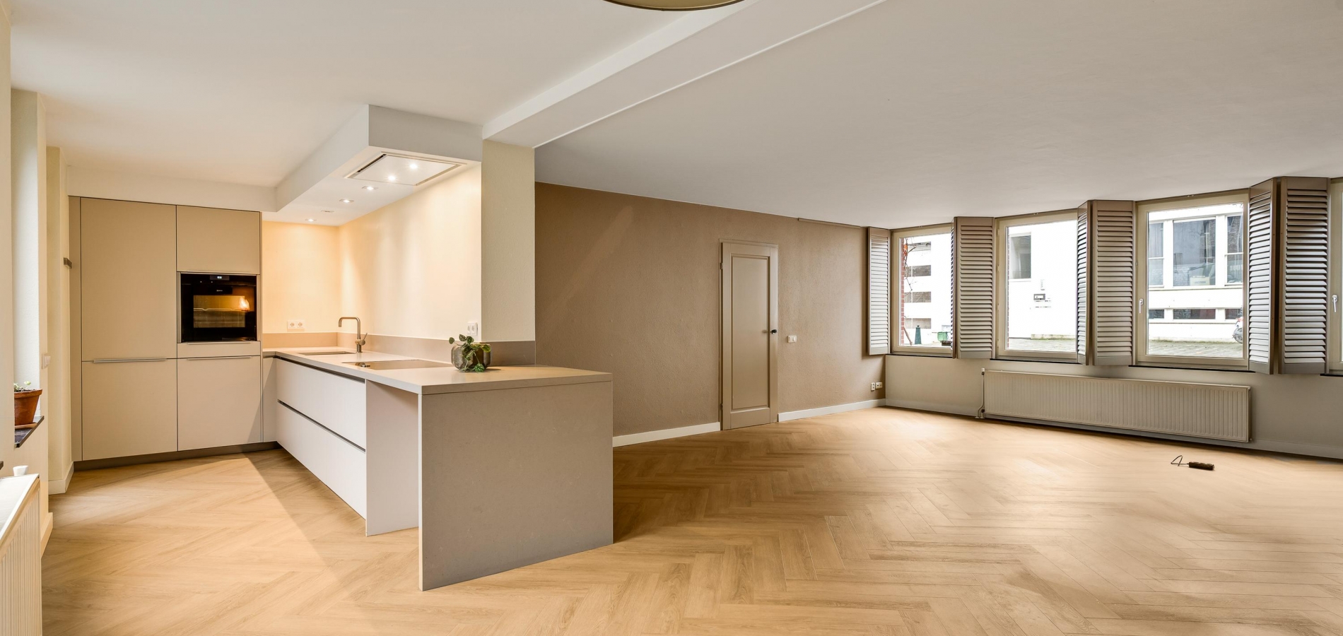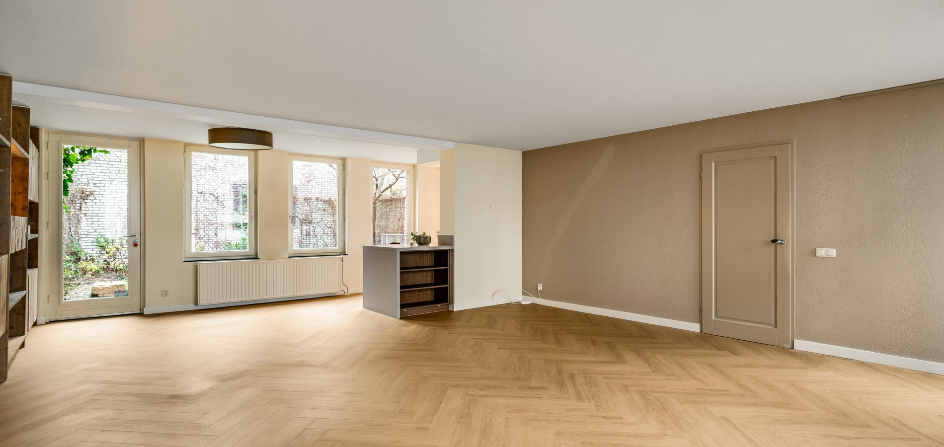 De visgraat pvc-vloer ligt niet alleen in de hal, maar ook in de woonkamer en keuken. Met een totale oppervlakte van circa 55 m2 heeft u de beschikking over een aangename leefruimte, waar u kunt koken en waar het uitnodigen van familie of vrienden geen issue is. Door de grote ramen aan twee zijden, waaronder de zuidkant, valt veel licht naar binnen en de maatwerk raamluiken zorgen voor gewenste beschutting. Over de hele lengte van de woonkamer is een wandmeubel gemaakt, waar een gashaard met schouw het middelpunt is.