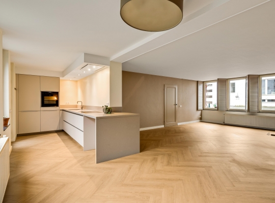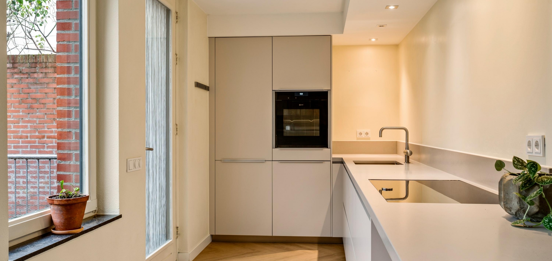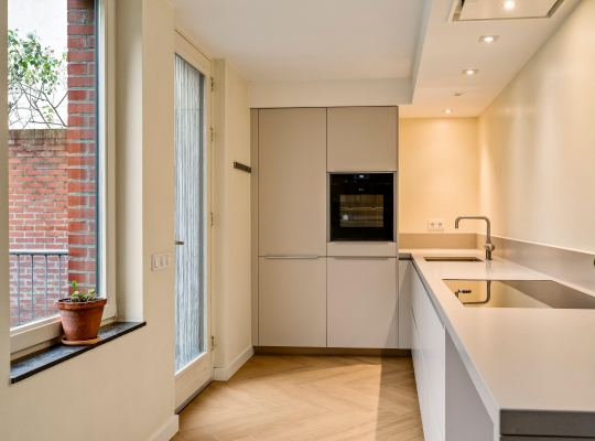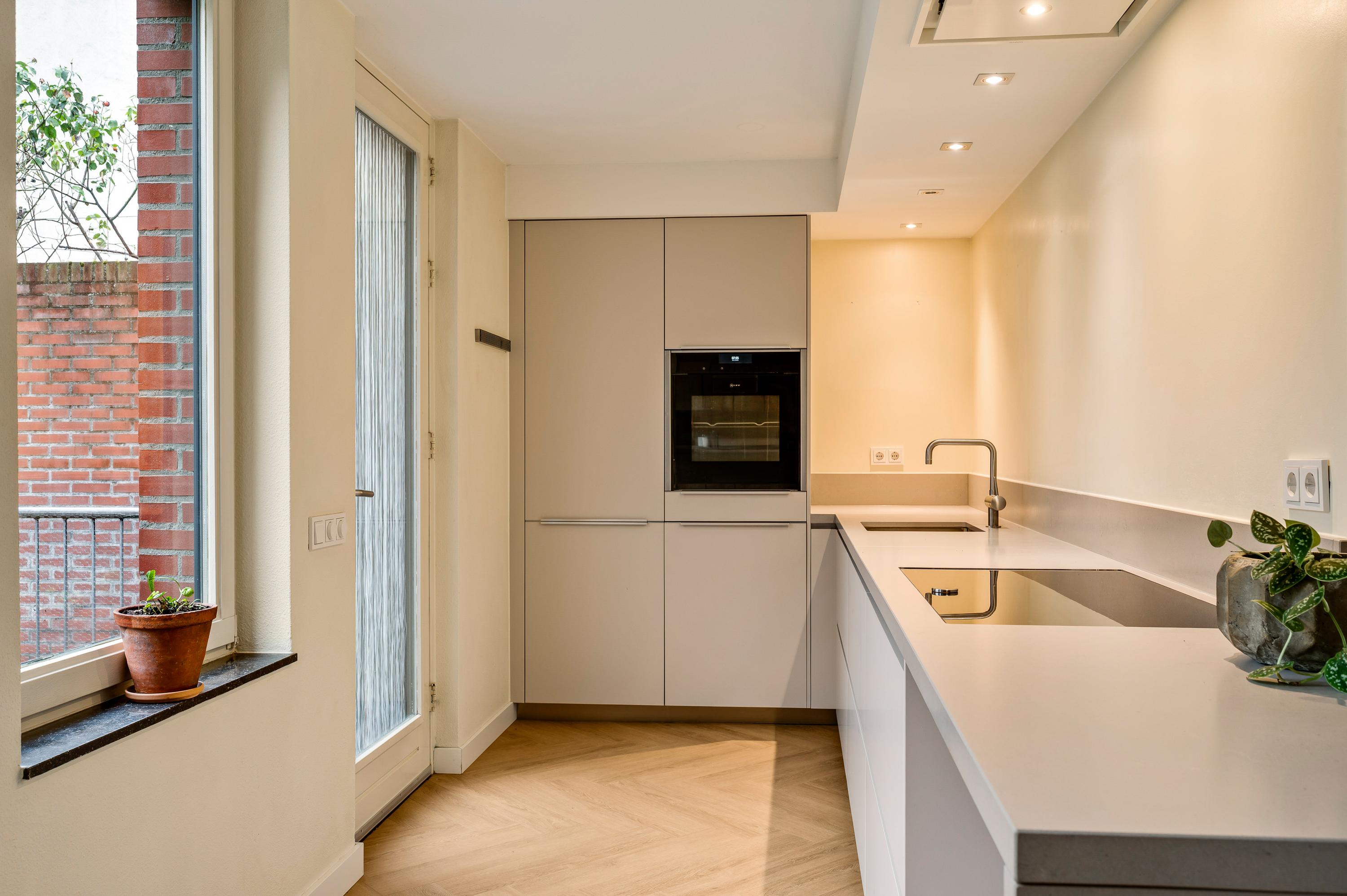 In de keuken staat een zeer luxe design hoekopstelling (2018), uitgevoerd in een warme kleur. Deze keuken past perfect binnen het hele interieurconcept, warm en uitnodigend. Alle benodigde inbouwapparatuur van het gerenommeerde merk Neff is aanwezig: een inductie kookplaat, plafondafzuiging, koelkast, vriezer, vaatwasser en een stoomoven.