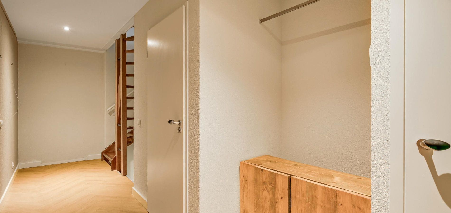 Volg de hardhouten trap in de hal, die u naar de overloop brengt. Vanaf hier is er toegang tot de master bedroom, een prachtige badkamer en het dakterras. De master bedroom (circa 6,09 x 5,23/4,92) is fraai uitgevoerd met een eiken parketvloer, maatwerk garderobekasten en een mooi kleurenpalet.