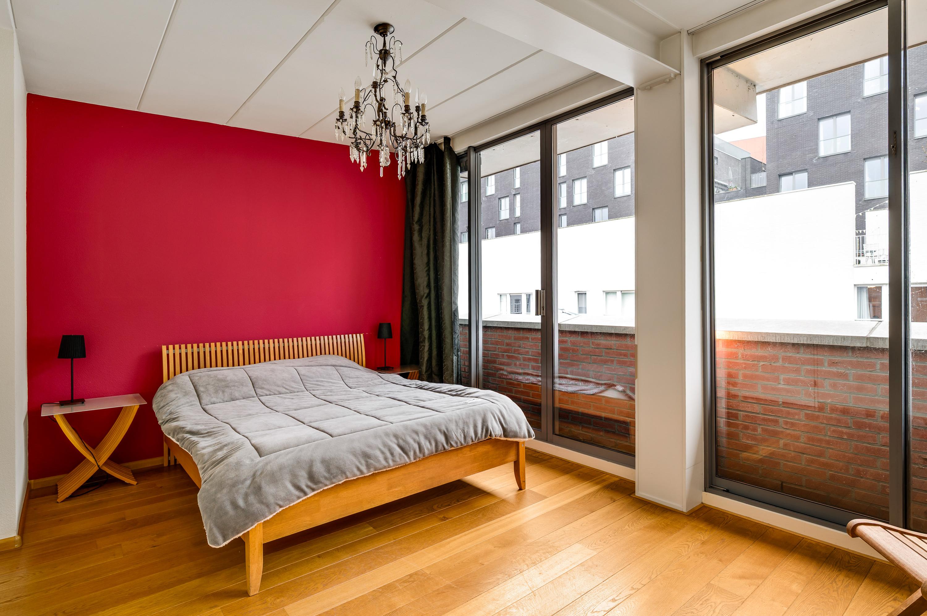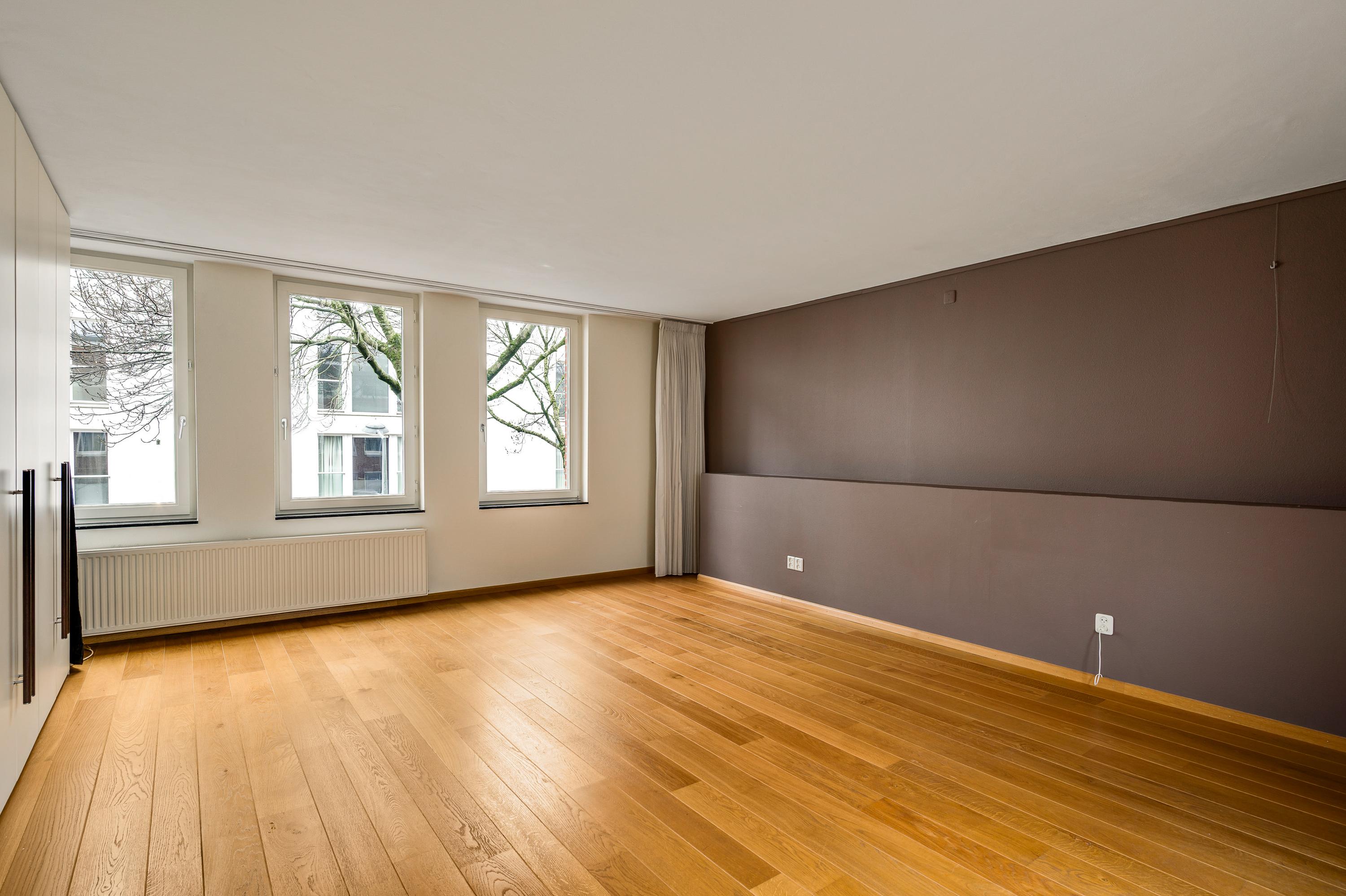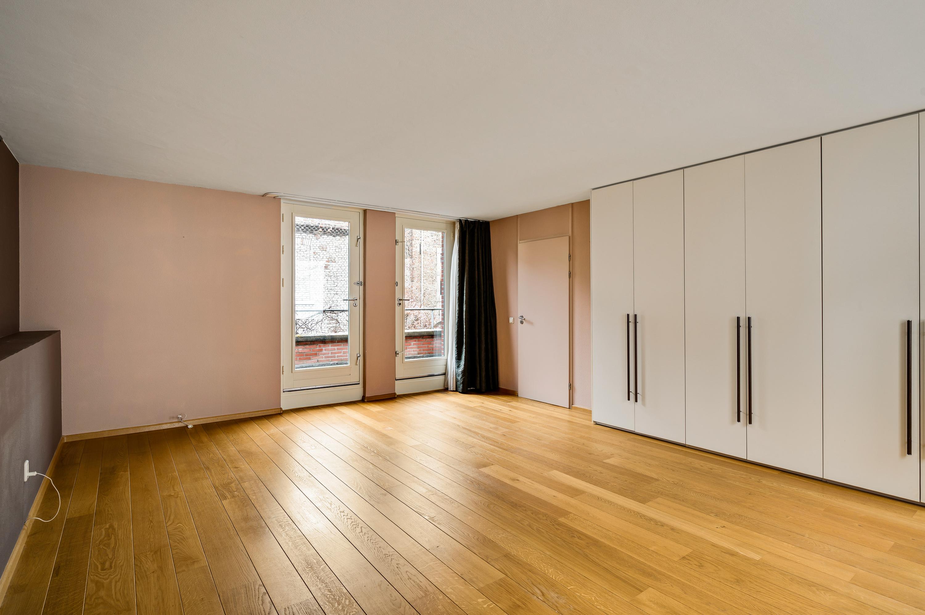 Onder het gebogen dak met koperen afwerking zijn nog twee slaapkamers, beiden bereikbaar vanaf de overloop. Ook op deze verdieping ligt een eiken parketvloer en door de grote ramen, deels uitgevoerd als schuifpui, valt veel licht naar binnen.