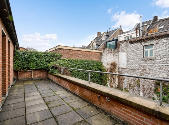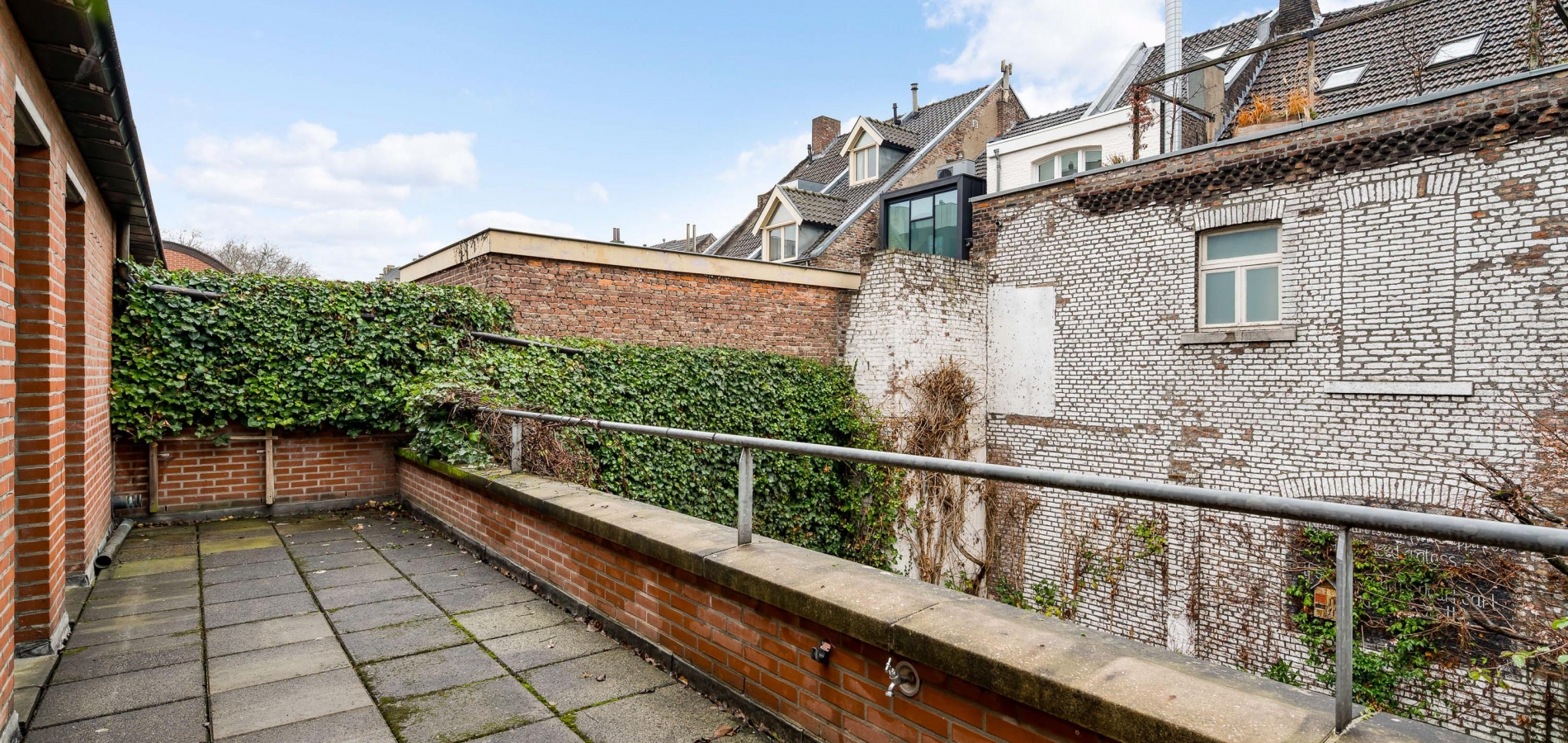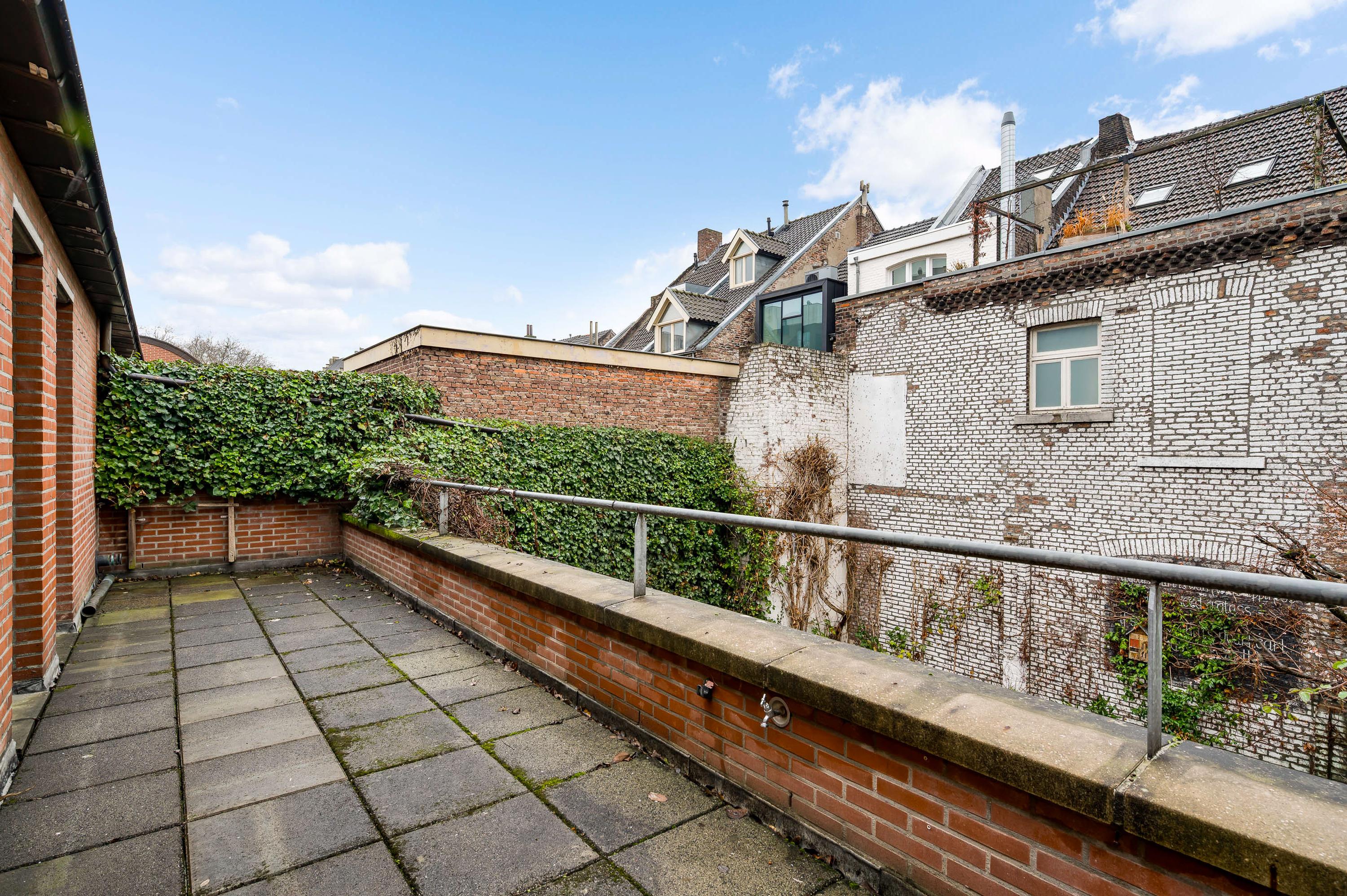Het dakterras (circa 8,79 x 1,99) is een verrassend grote ruimte, waar u uitzicht heeft op veelal historische en monumentale bebouwing. De kenner van Maastricht herkent de achtergevels van prachtige panden die aan de Hoogbrugstraat staan.