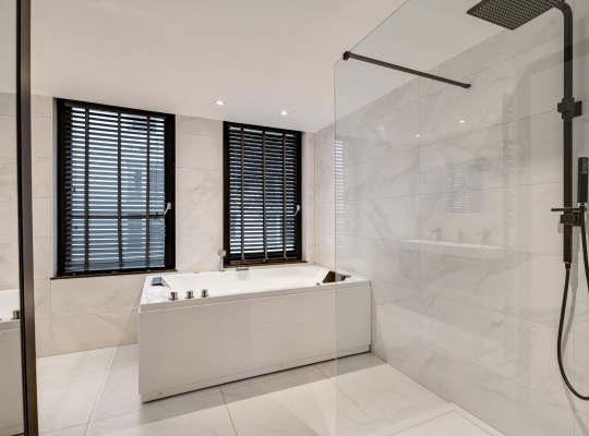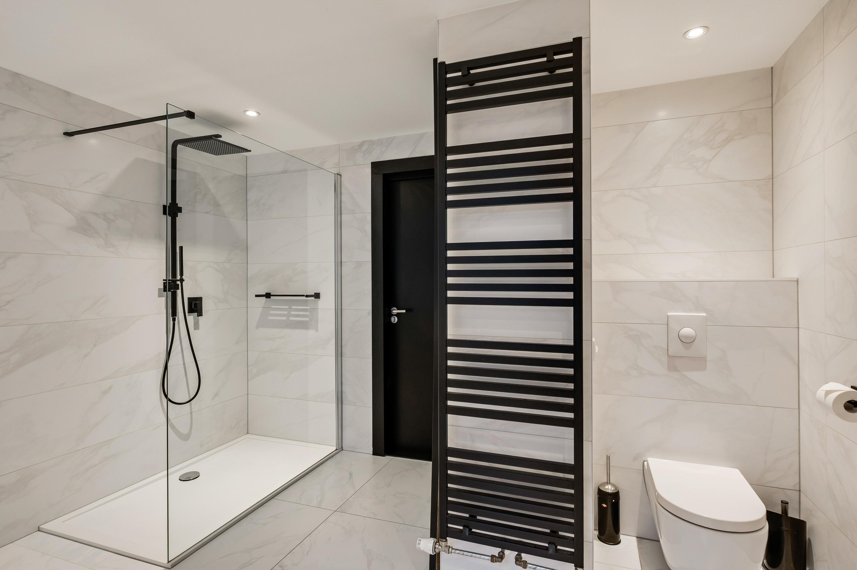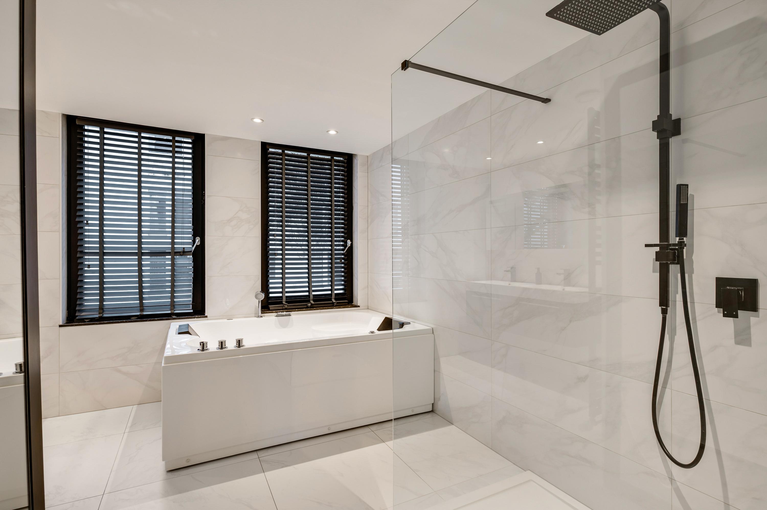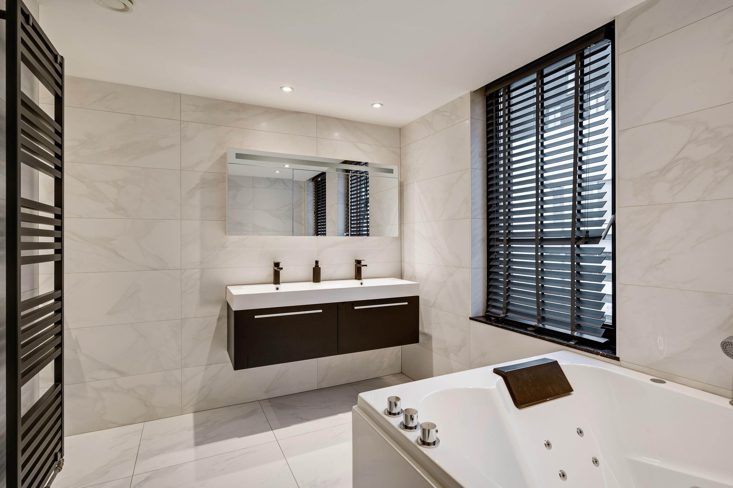 In de badkamer (circa 3,46 x 3,48) voeren marmer en zwart de boventoon. Grote wand- en vloertegels zijn gecombineerd met stucwerk, design sanitair en diverse zwarte elementen. U heeft de beschikking over een tweepersoons whirlpoolbad, een inloopdouche, een nis met wandcloset en een dubbel wastafelmeubel.