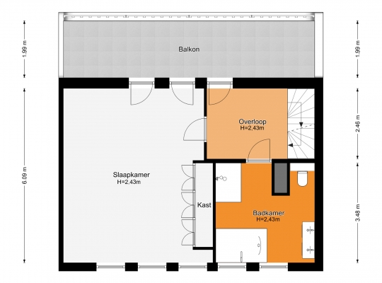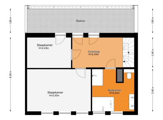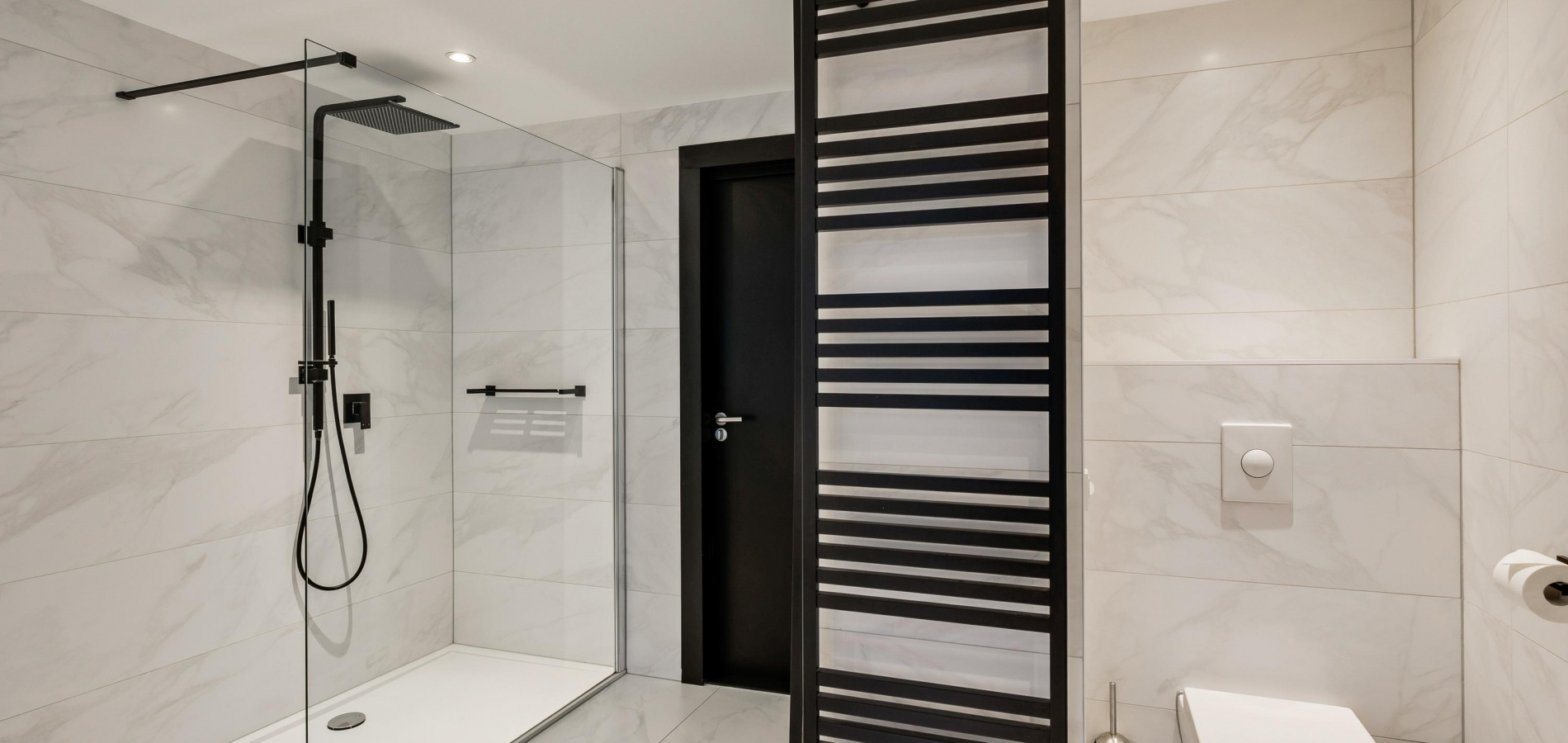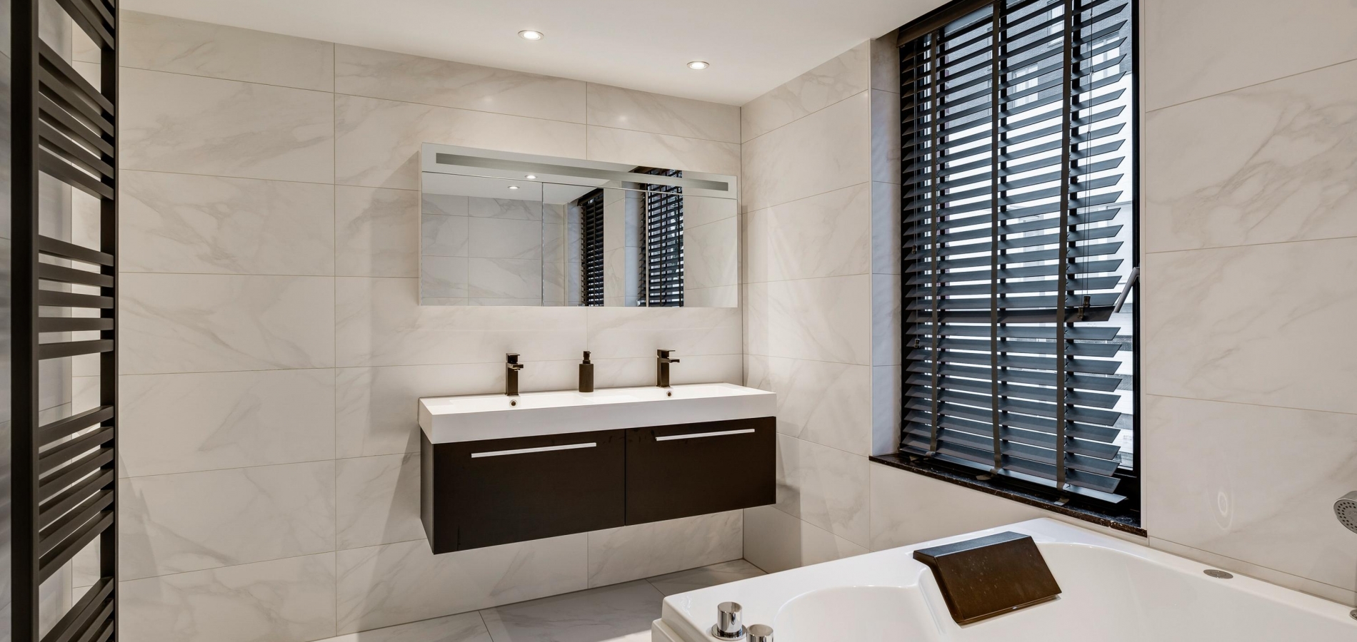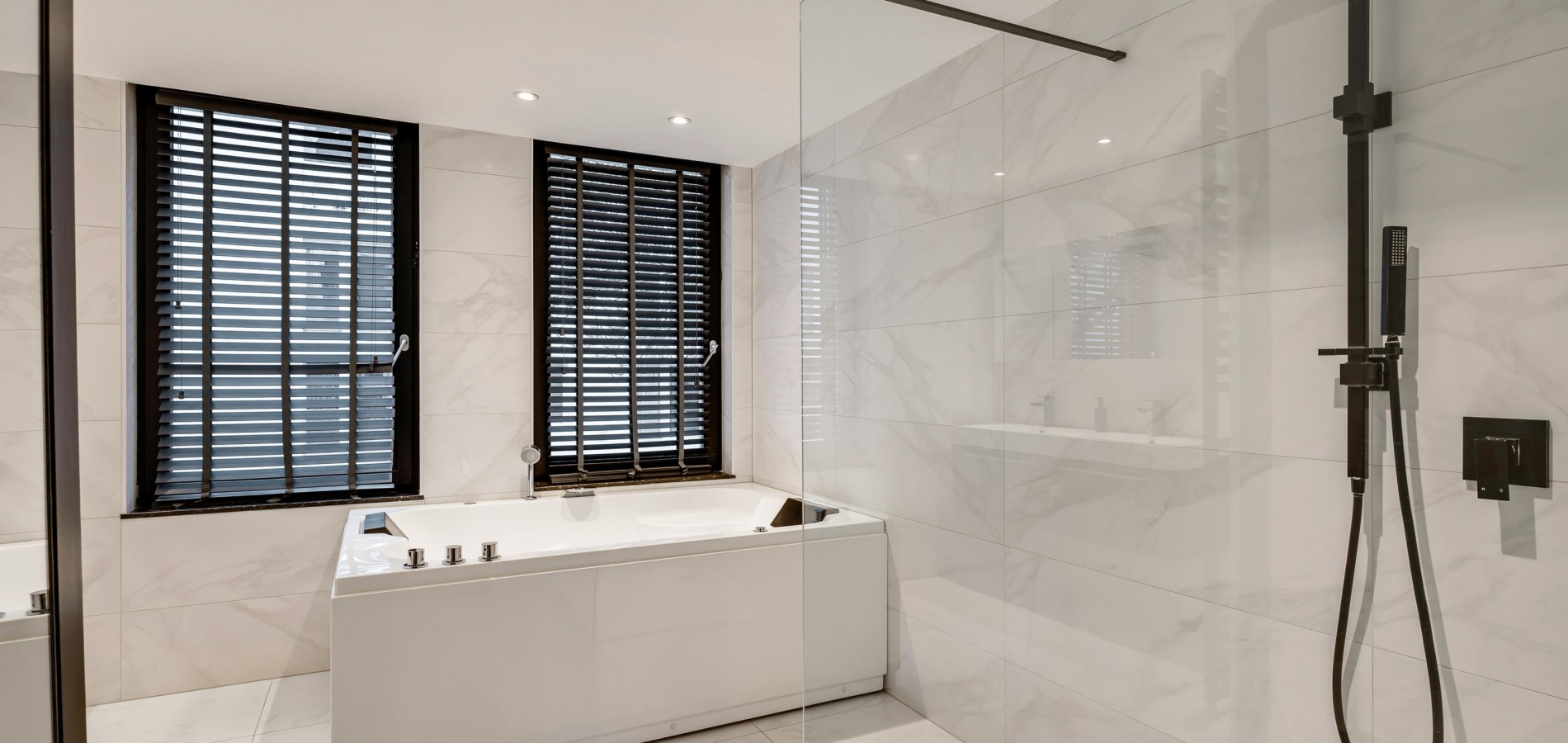 In de badkamer (circa 3,46 x 3,48) voeren marmer en zwart de boventoon. Grote wand- en vloertegels zijn gecombineerd met stucwerk, design sanitair en diverse zwarte elementen. U heeft de beschikking over een tweepersoons whirlpoolbad, een inloopdouche, een nis met wandcloset en een dubbel wastafelmeubel.