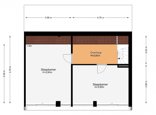 Slaapkamer II (circa 4,79 x 3,28) is ingericht als tweepersoons logeerkamer en slaapkamer III (circa 5,79 x 3,88) is klaar voor een nieuwe invulling. Perfect om in te richten als kinderkamer, als werkkamer of …. ? Aan u de keuze.