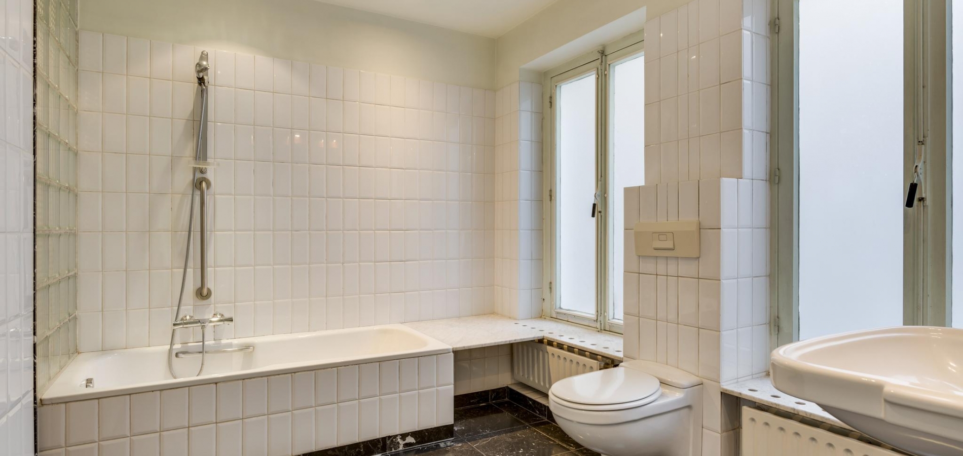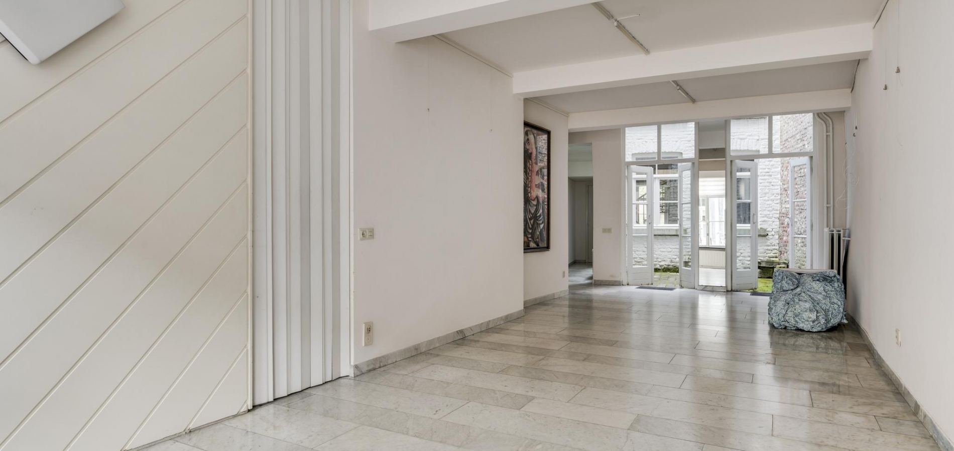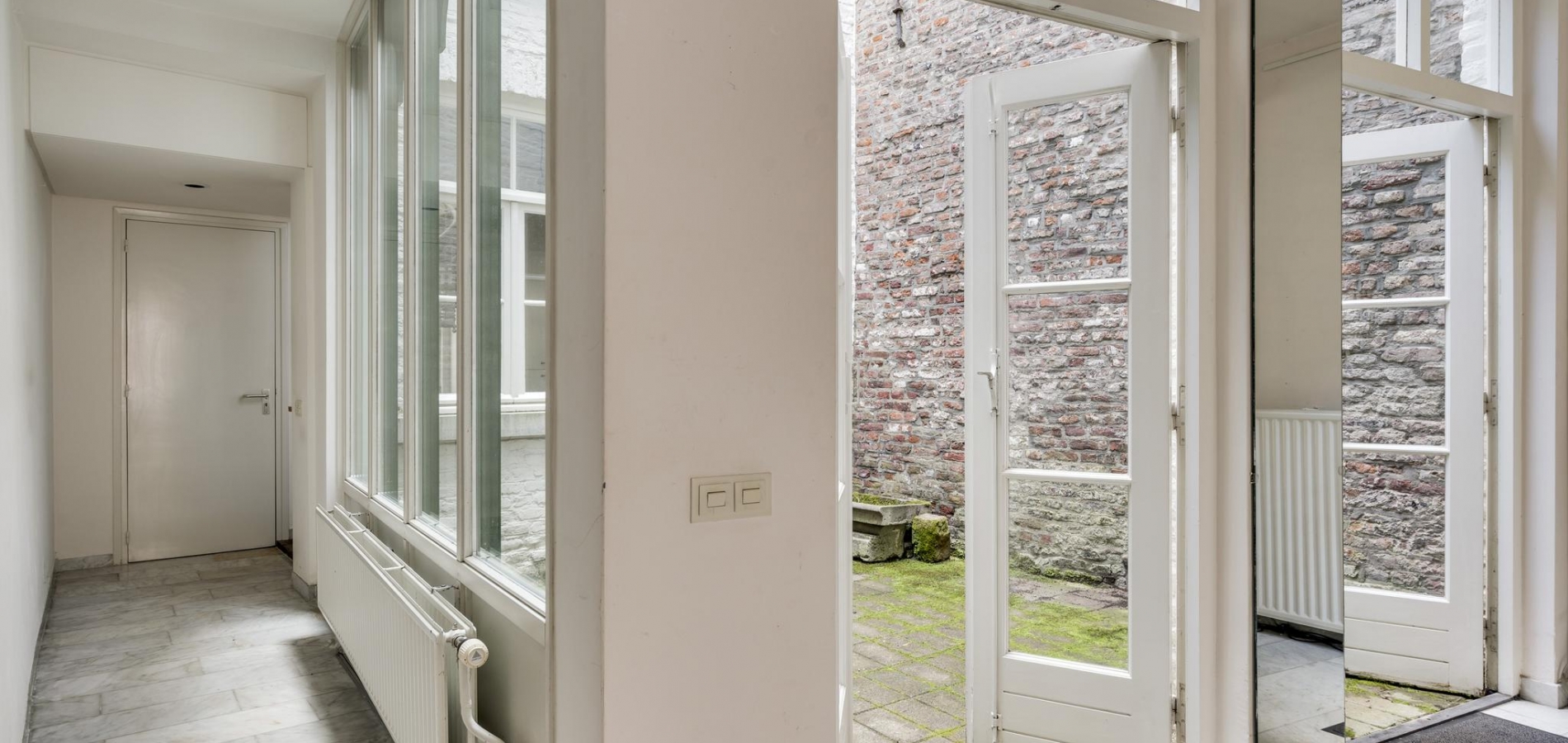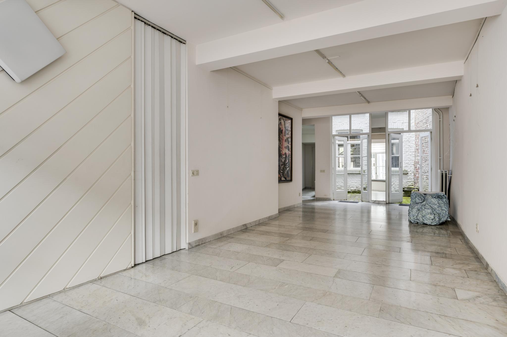 De vloeren van het portaal, de multifunctionele ruimte en de gang naar de woonkeuken zijn voorzien van een marmeren vloer. Dubbele openslaande deuren in de multifunctionele ruimte geven toegang tot de patiotuin tussen het voor- en achterhuis.