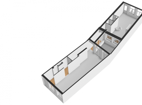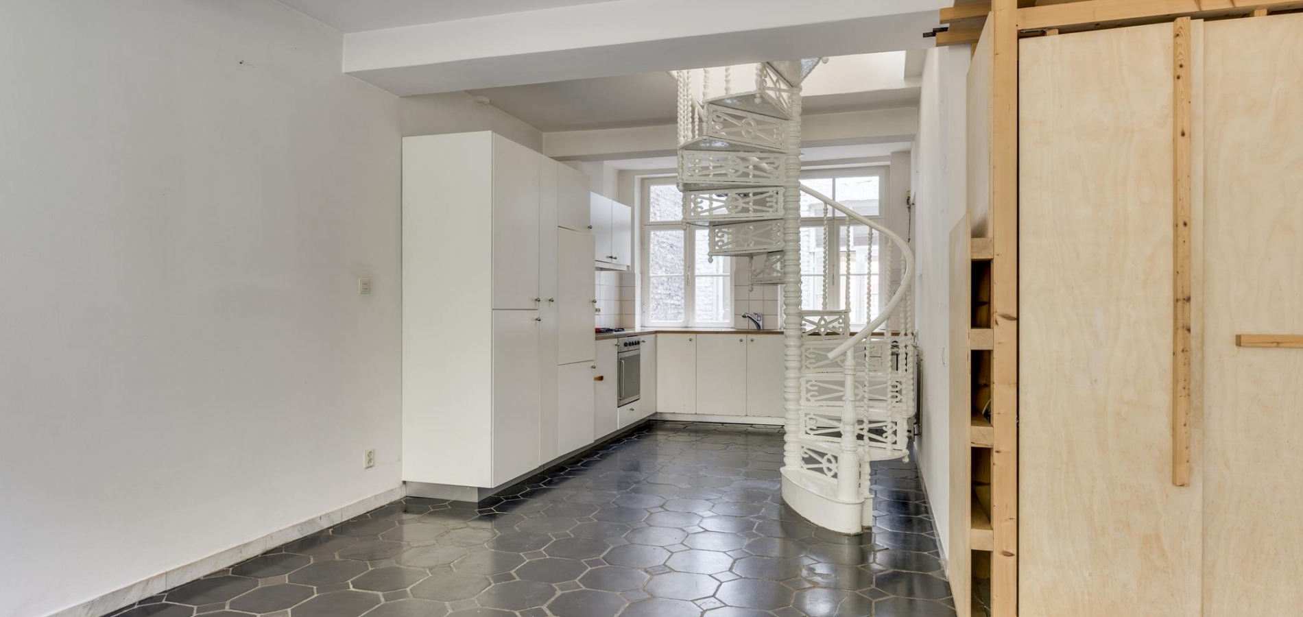 Achter de voordeur loopt u via een open portaal naar de multifunctionele ruimte (ca.34 m2) die dienst kan doen als winkelruimte, expositieruimte of woonruimte. Deze multifunctionele ruimte staat in open verbinding met de woonkeuken.