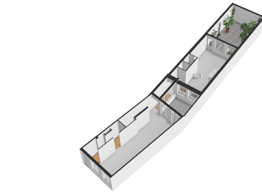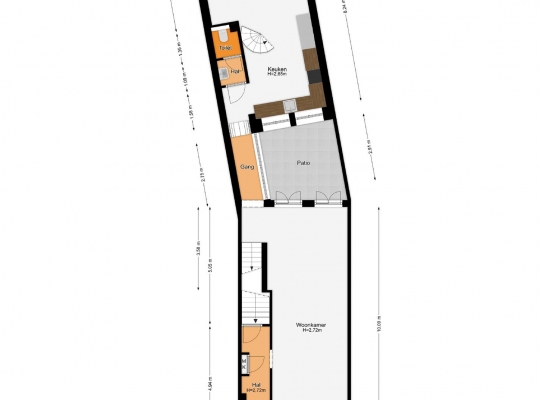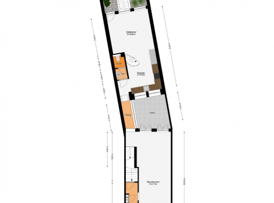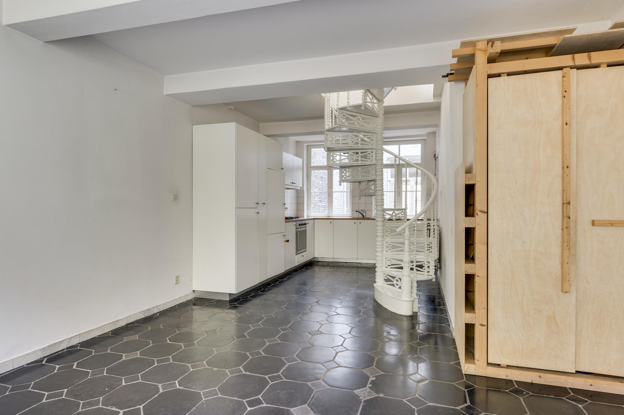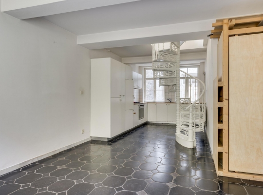 De trap naar de eerste verdieping bevindt zich in de multifunctionele ruimte, uit het zicht, achter een muur. Een lichte gang verbindt het voorhuis met het achterhuis. In het achterhuis treffen we de ruime woonkeuken (ca. 30 m2) aan met lichtinval van twee zijden. In deze woonkeuken staat een prachtige, gietijzeren, spiltrap die naar de eerste verdieping voert. De tegelvloer in de woonkeuken toont karakter en de lichte hoekopstelling is voorzien van diverse inbouwapparatuur. Ook de toiletruimte met portaal bevindt zich op de begane grond. Vanuit de woonkeuken hebt u toegang tot de charmante achtertuin die grenst aan de woonkeuken. In de met getrommelde keitjes bestraatte achtertuin ziet u de trap naar het souterrain en diverse beplanting, waaronder enkele bomen.