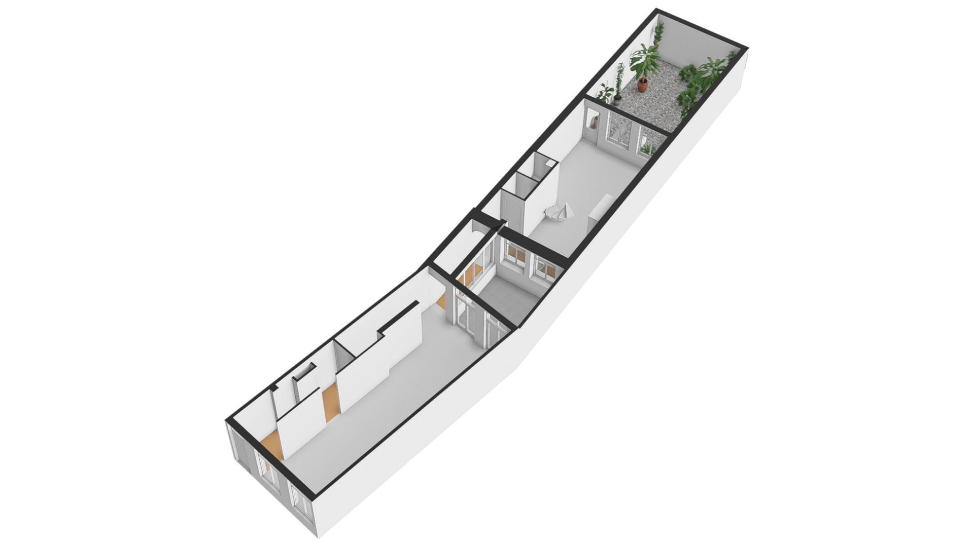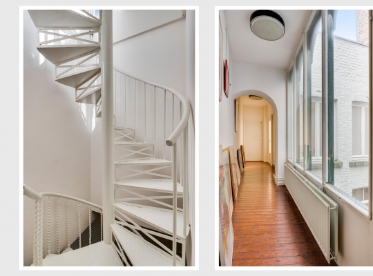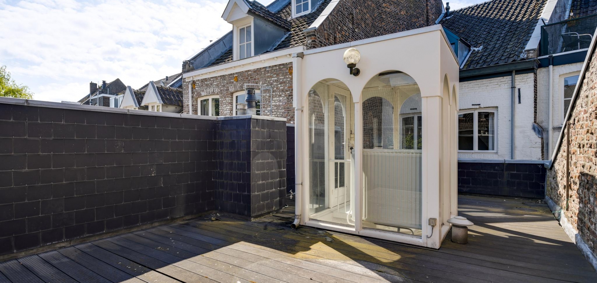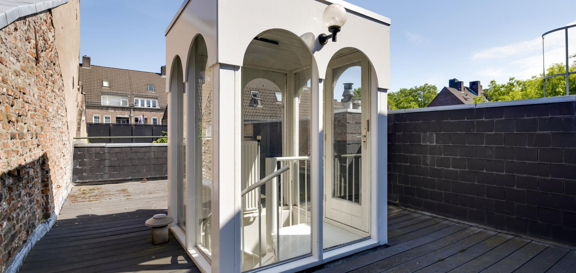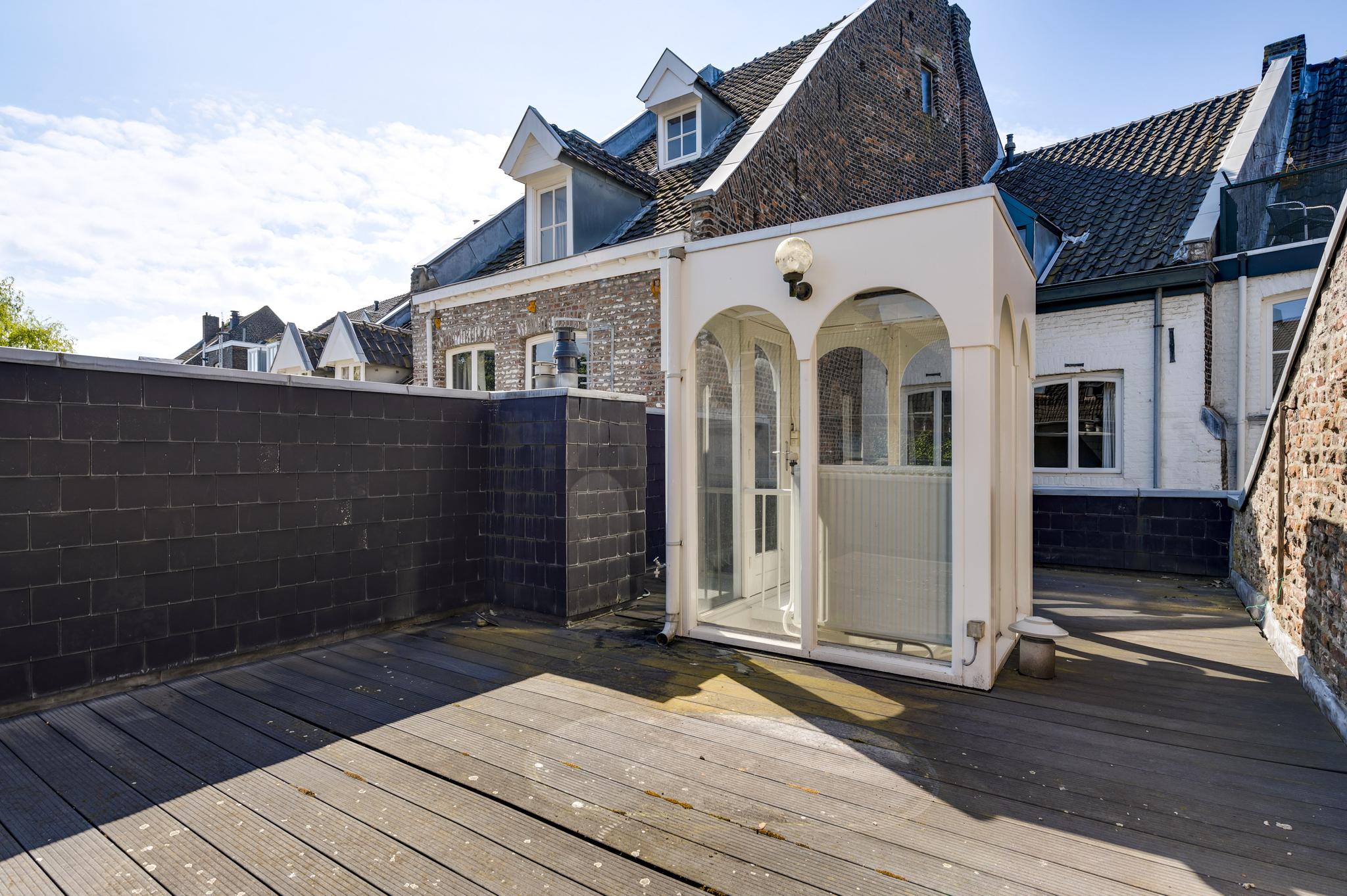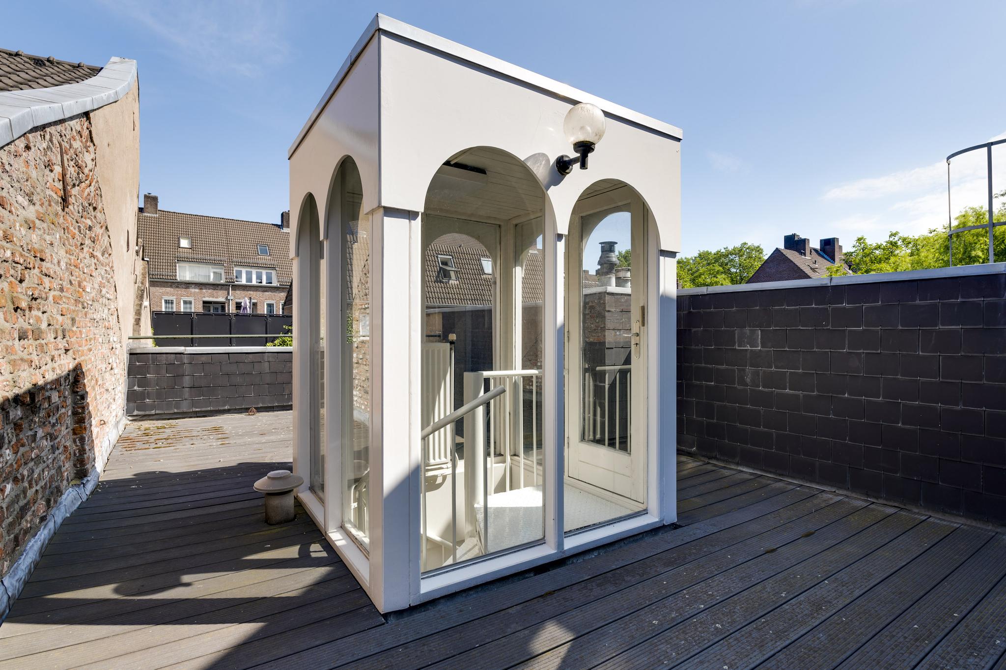 In het achterhuis is op de eerste verdieping leidt een stalen spiltrap naar het grote dakterras (ca. 35 m2) met veel privacy en een uitstekende zonligging.
