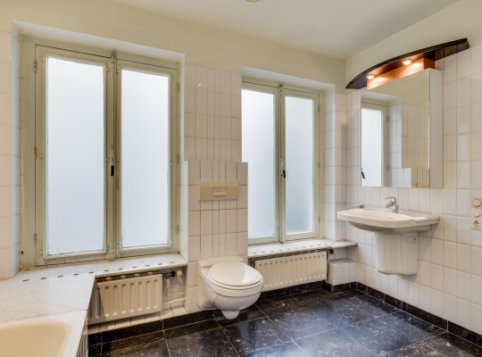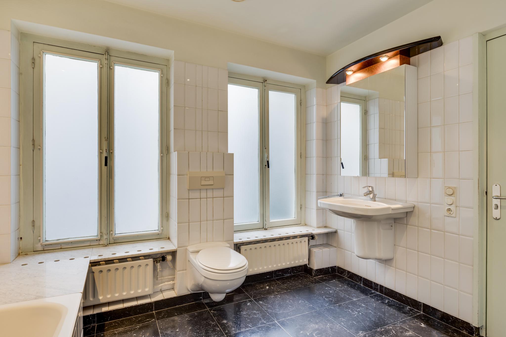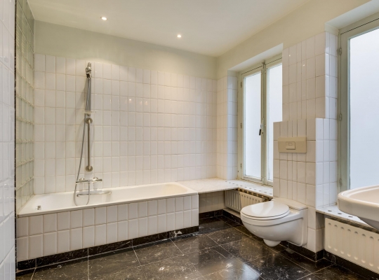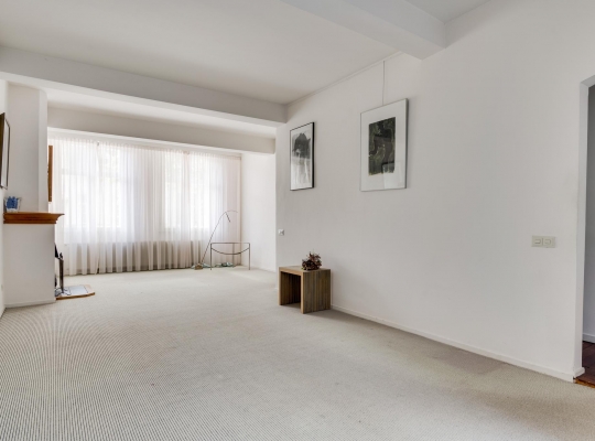 Ook op de eerste verdieping zijn het voor- en achterhuis met elkaar verbonden via een brede, lichte gang. In het voorhuis bevindt zich de woonkamer met een oppervlakte van ca. 39 m2, een 3,15 meter hoog plafond en een open haard. In het achterhuis zijn de master bedroom en de badkamer gesitueerd. Slaapkamer I (ca. 4,47 x 4,19) biedt uitzicht op de achtertuin. De badkamer (ca. 9,5 m2) met hardstenen vloer is ingedeeld met een ligbad, een wandcloset, een wastafel, een spiegelkast en opstelruimte met aansluitingen voor wasmachine en -droger.