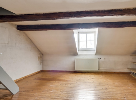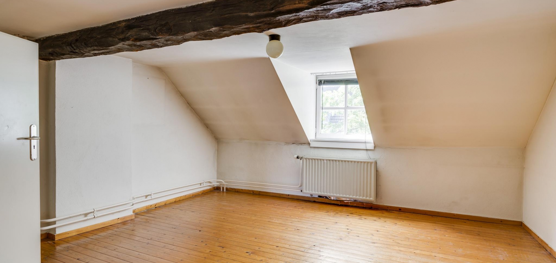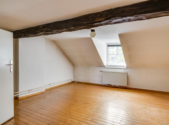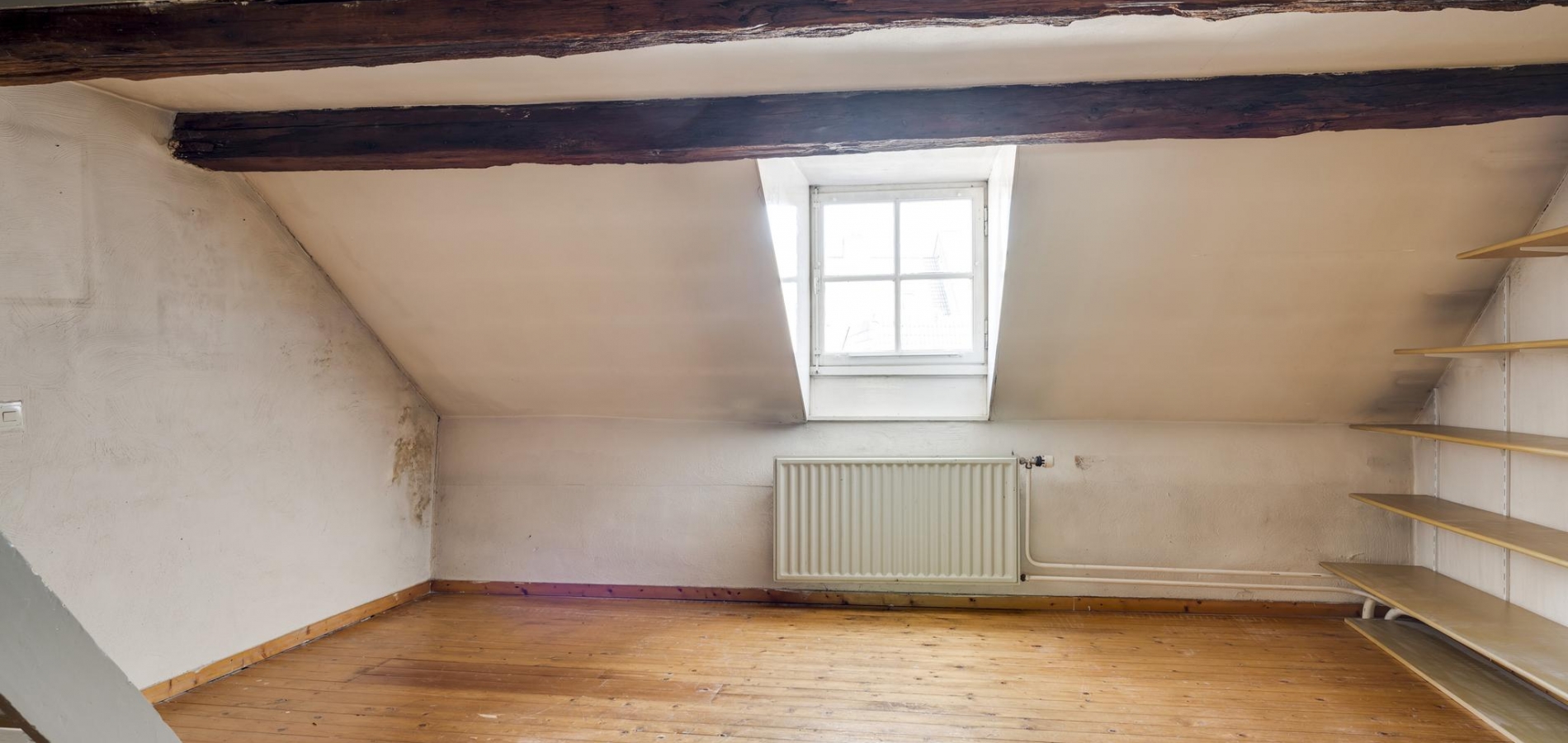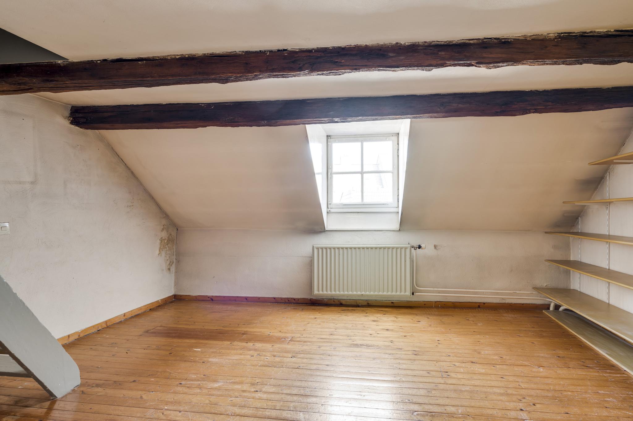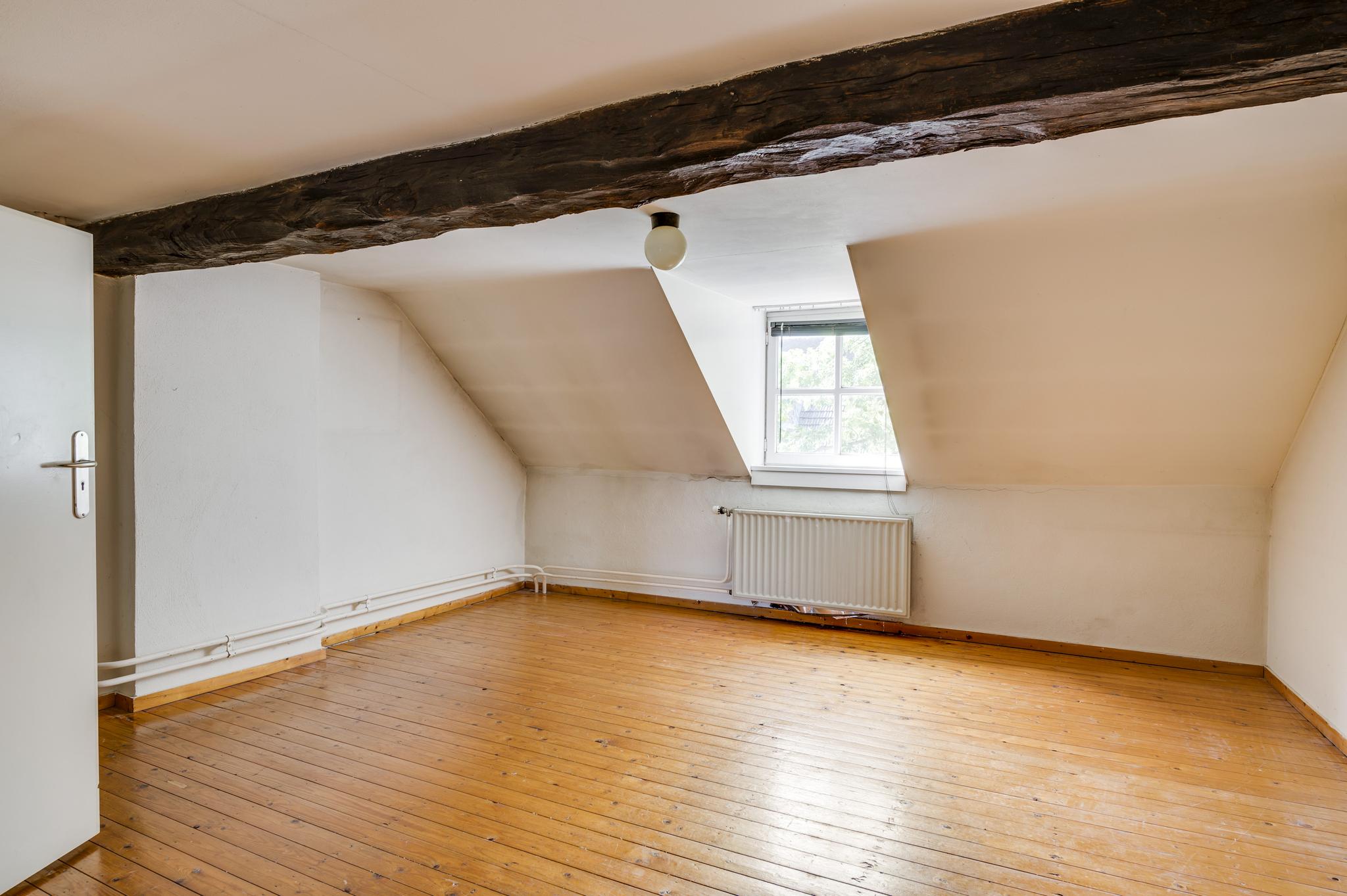 Een vaste trap geeft toegang tot de ruime zolder, die een nokhoogte van ca. 2,55 meter heeft. Op deze verdieping is de opstelling van de HR-ketel (huur 2017 12 jaar huur).