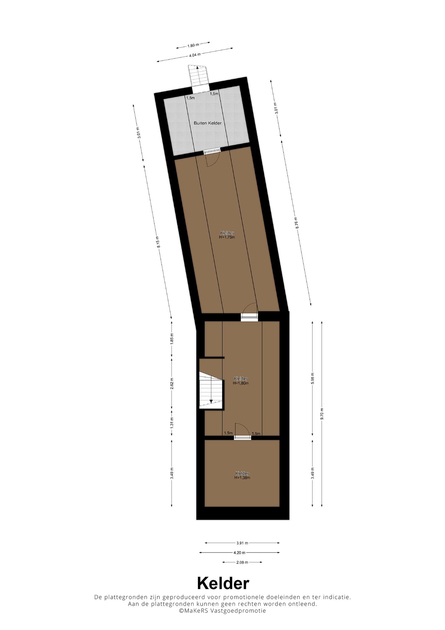 In het voorhuis is een trap die leidt naar het souterrain met drie kelderruimtes, qua hoogte variërend van ca. 1,38 tot 1,80 meter hoogte. Kelder I, aan de voorzijde, is ca. 3,49 x 3,91 groot en kelder II heeft een vloeroppervlakte van ca. 5,98 x 3,91 meter. Kelder III (ca. 8,76 x 4,04) staat in verbinding met een buitenkelder (ca. 4,04 x 3,01), van waaruit de tuin te bereiken is.