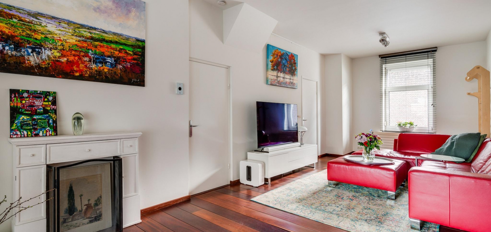 Verrassend is de ruimte in de woonkamer (circa 8,42 x 3,45) die in verbinding staat met de keuken (circa 4,35 x 4,05). Het resultaat is een ruime leef-, kook- en eetruimte van circa 45 m2, die door open doorkijk ook speels in verbinding staat met de ruime stadstuin. Het woongedeelte is voorzien van een fraaie parketvloer en een airco unit. In het keukengedeelte ligt een tegelvloer en de keukenopstelling met granieten aanrechtblad en achterwand is voorzien van inbouwapparatuur van Bosch, Itho en Smeg: een groot gasfornuis met oven, afzuigkap, magnetron en vaatwasser. De losse koel-/vriescombinatie gaat mee en achter de witte deur is een ruimte voor de wasapparatuur.
